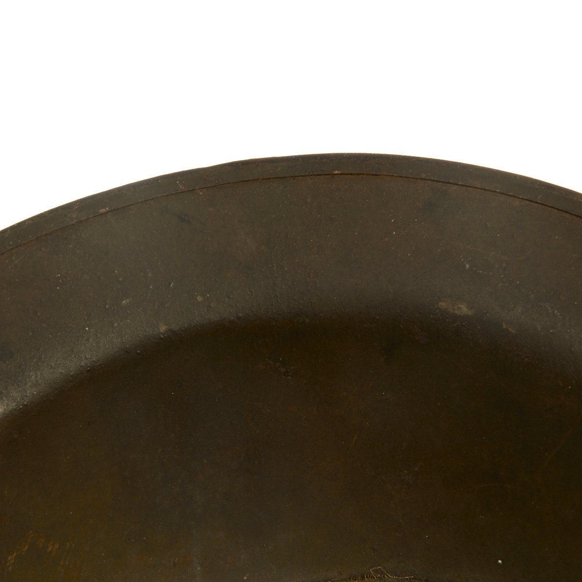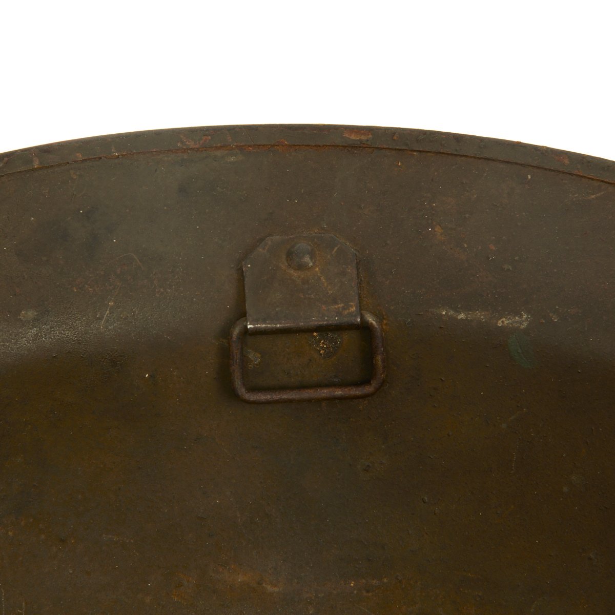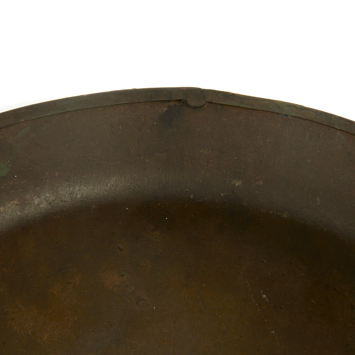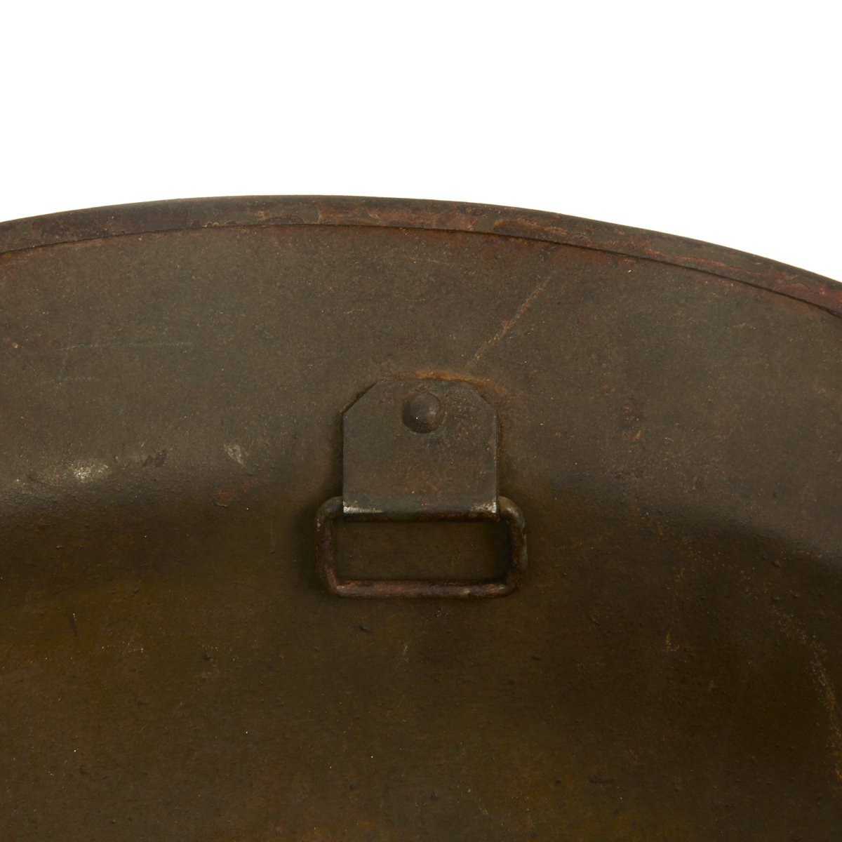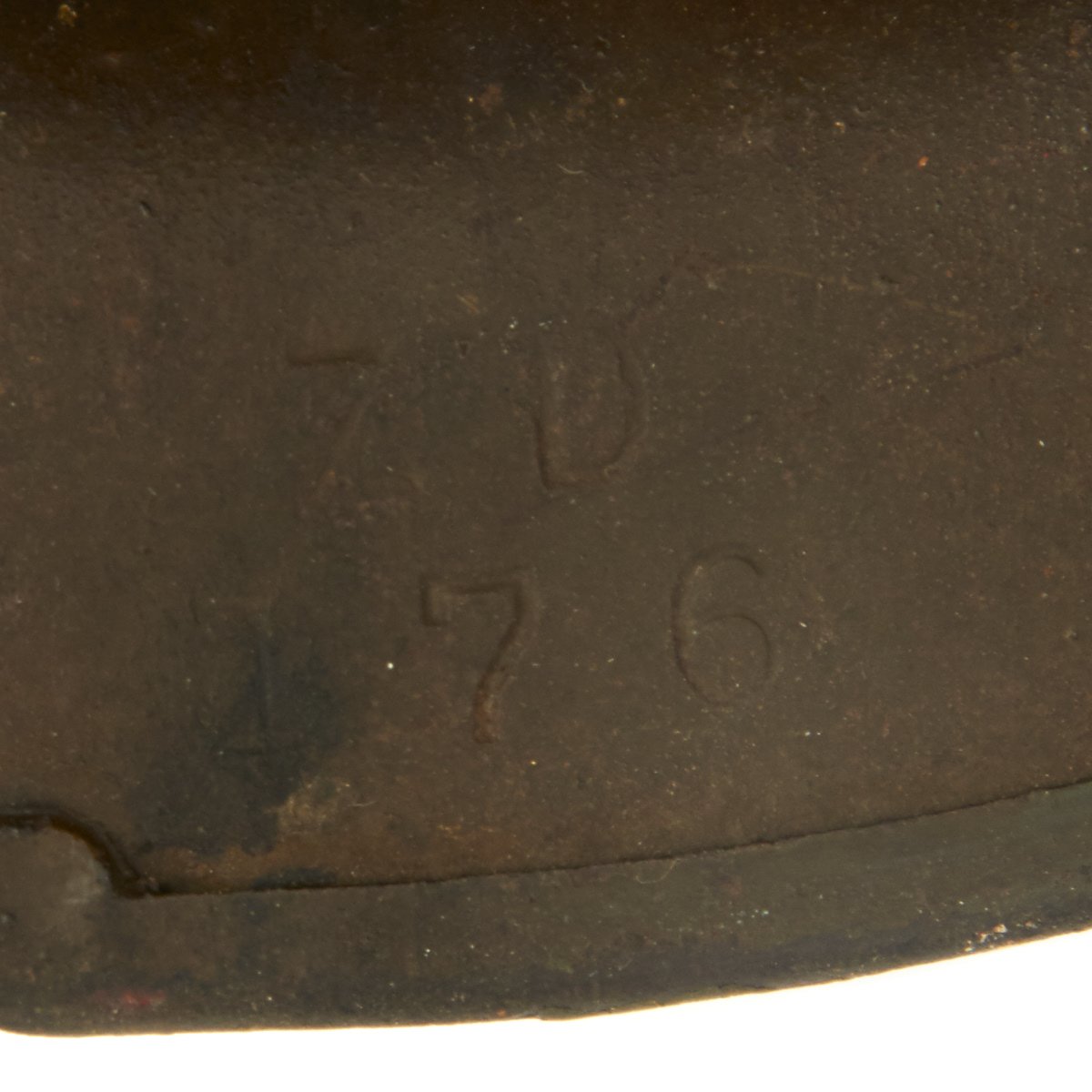Helmet is missing the liner and chinstrap. It features original paint on the underside of the shell. The shell is maker marked with the stamping on the underside of the rim ZD76.