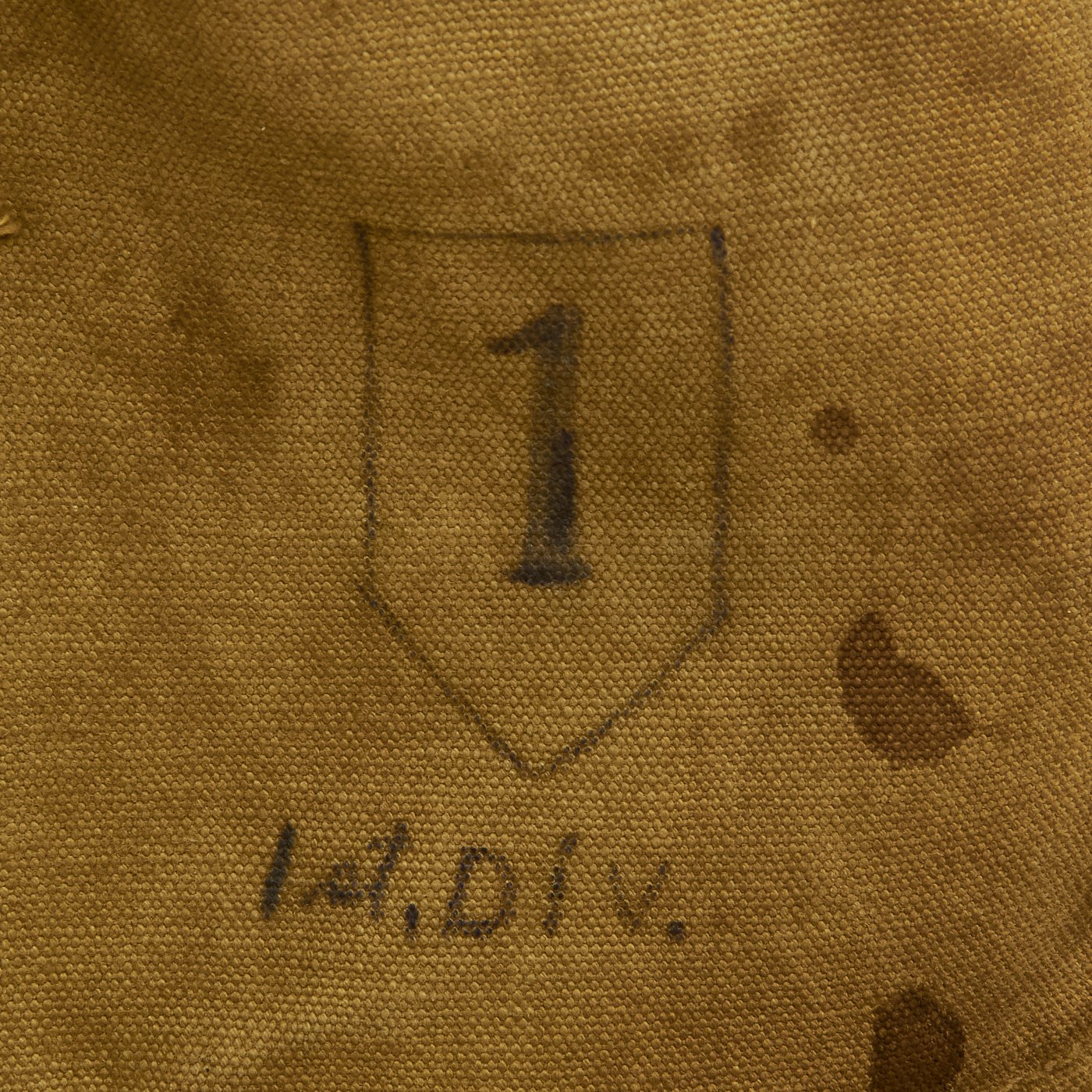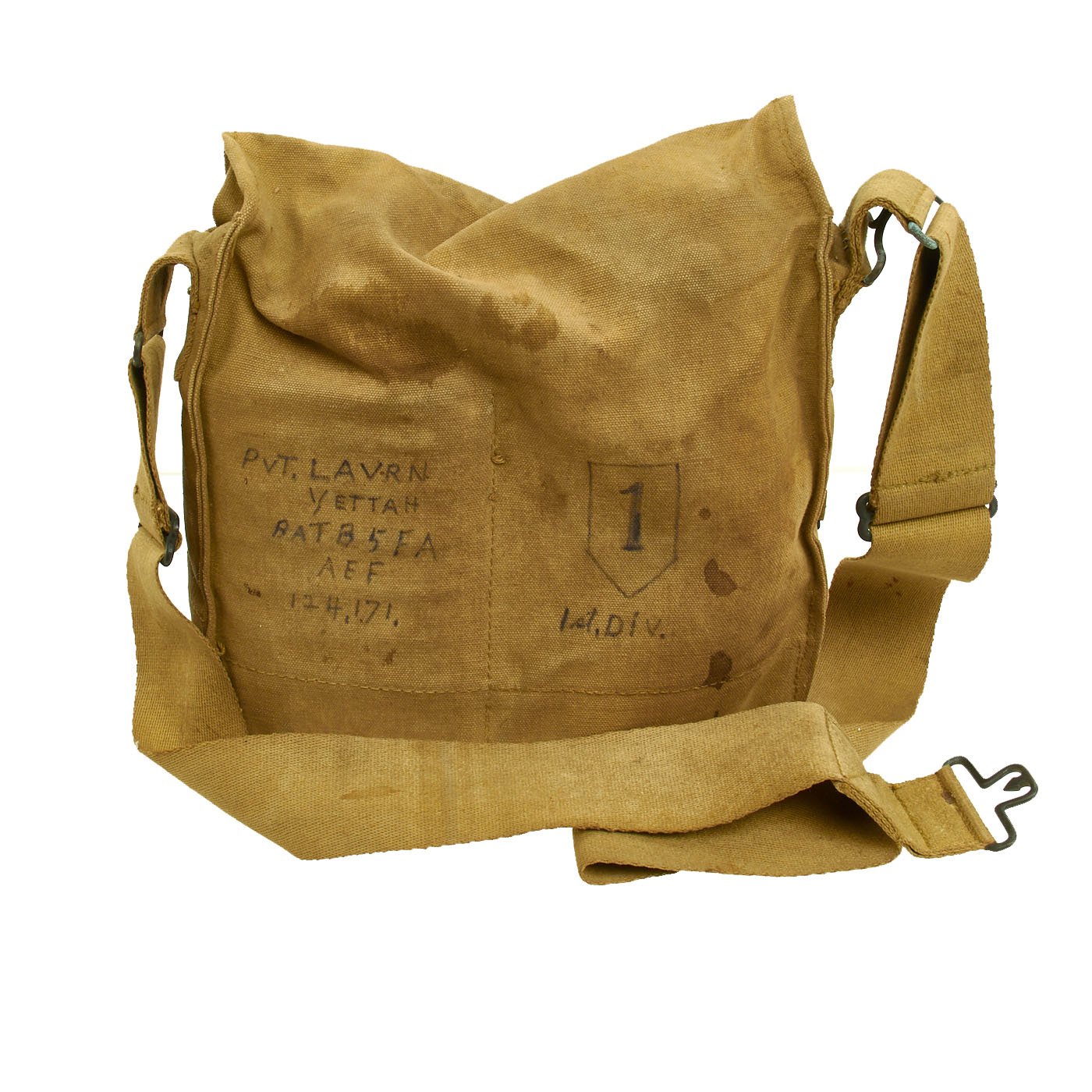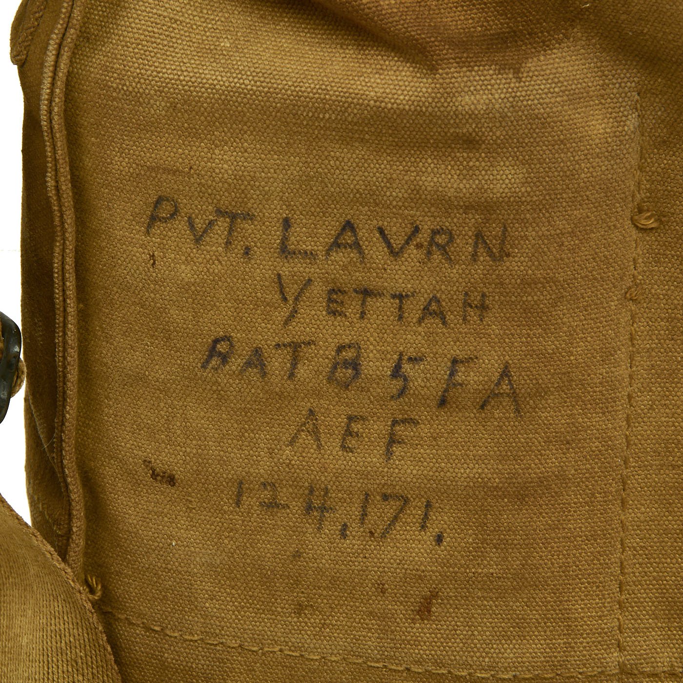 The best part about this example is definitely the markings on the back of the satchel. It has the soldiers name, regiment, and operating number on the left side: