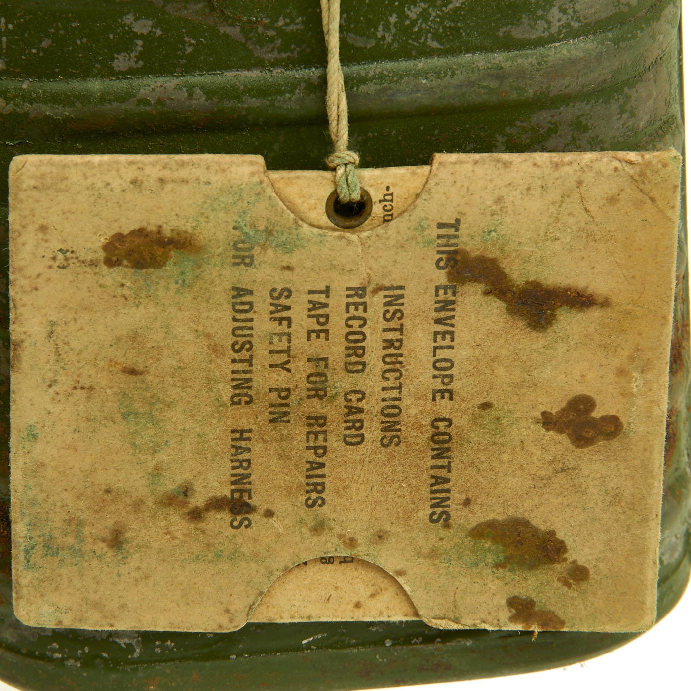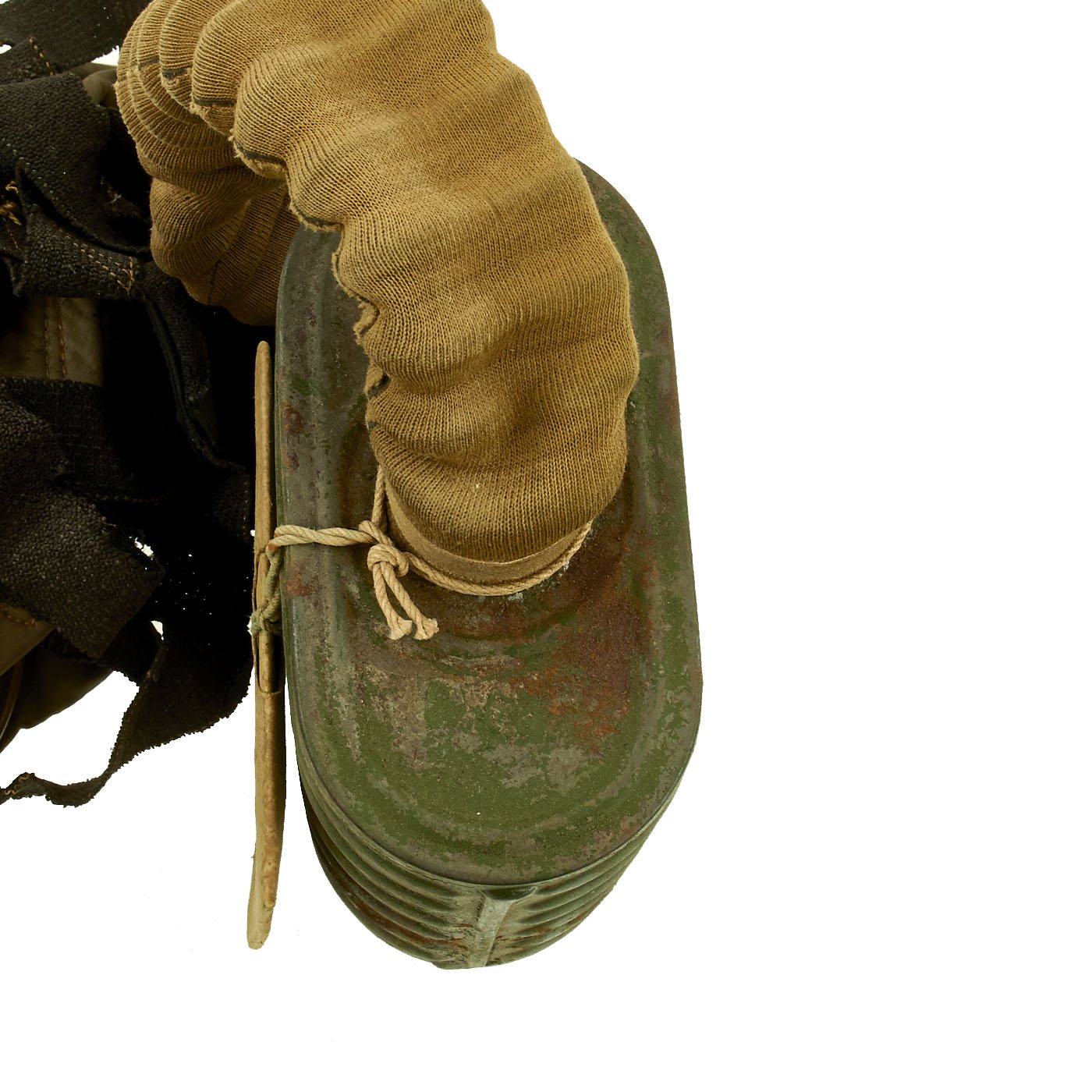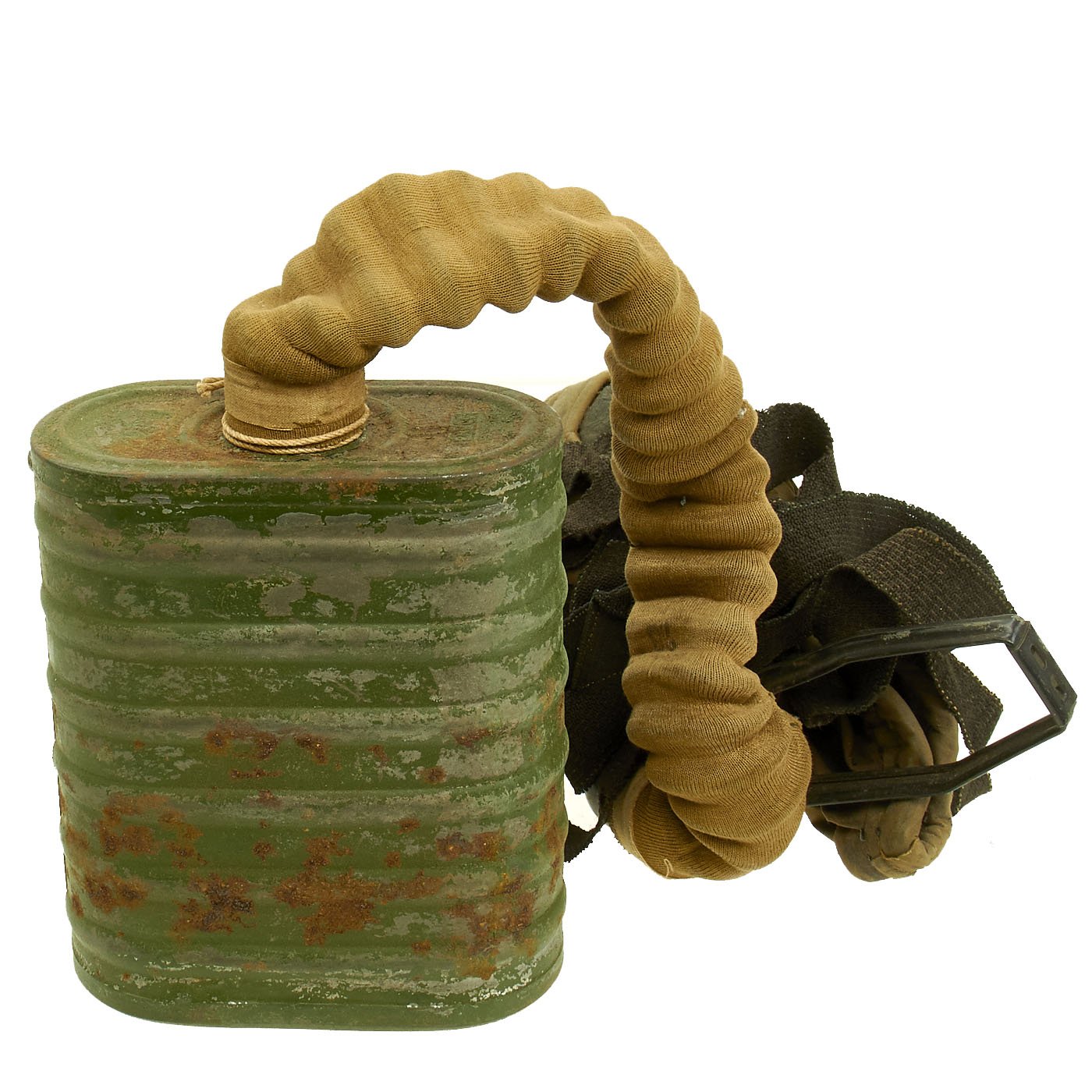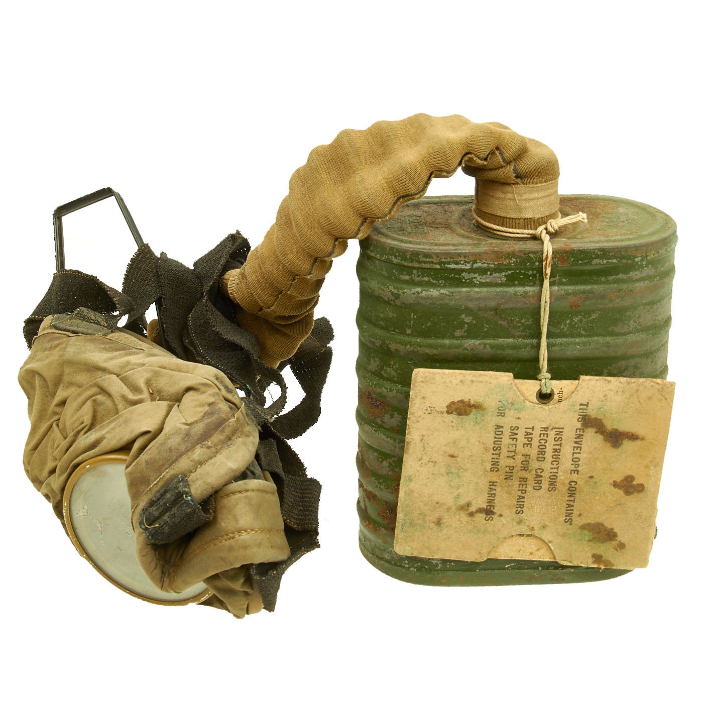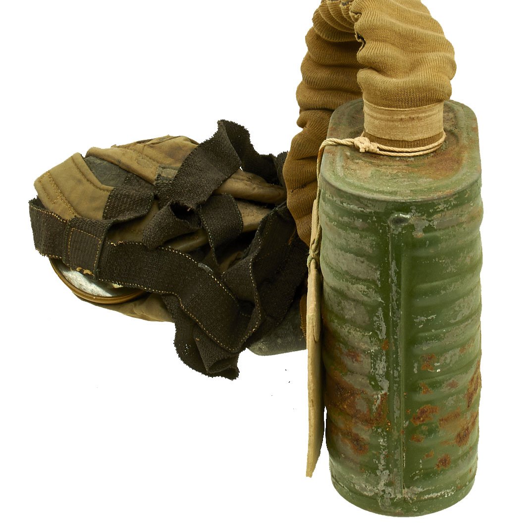 This is an very good example complete with the mask, connection hose, filter, and carry satchel. It also still has the metal "spring" in the bottom that goes under the filter, and even has the original packet containing instructions and repair tape. The mask is in good condition, though unfortunately the rubber has become quite hard, so there is no way for us to unfold it anymore. The hose is still somewhat supple, but the elastic straps are also gone. Early Rubber unfortunately is not as stable as later examples, and after 100 years virtually any type of rubber can harden.