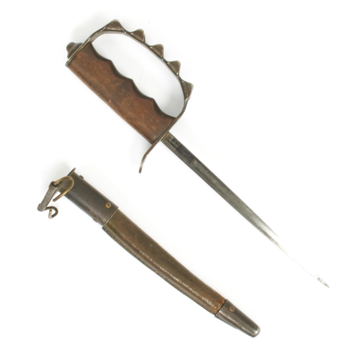 Original Item: Only One Available. Very nice condition Model 1917 trench knife with hardwood handle, triangular stiletto blade, and leather scabbard with standard belt hook attachment.