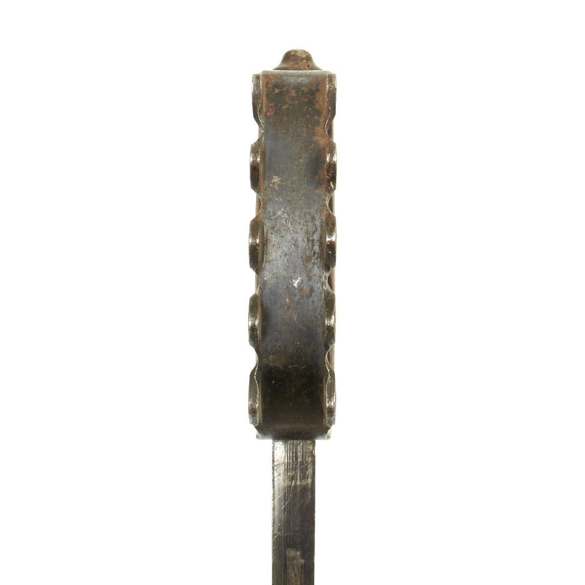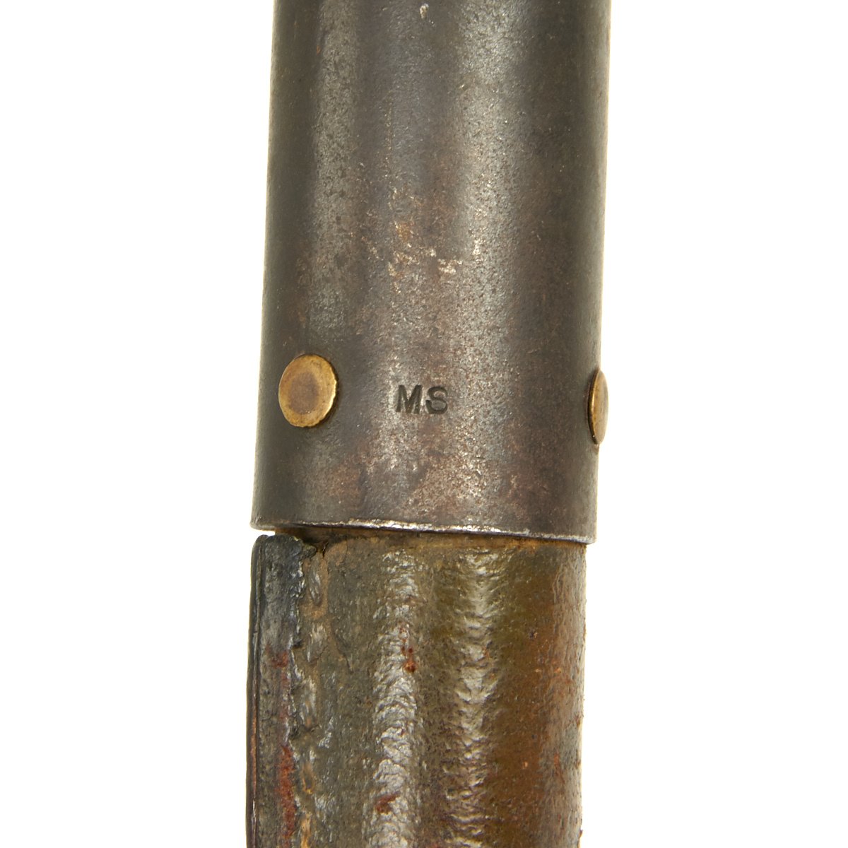 This example is in very condition, though the finish on the blade has areas of finish loss from inserting it into and extracting it from the scabbard. The scabbard is complete but one brass rivet (of two) is missing. An example that would make a perfect genuine addition to any collection.