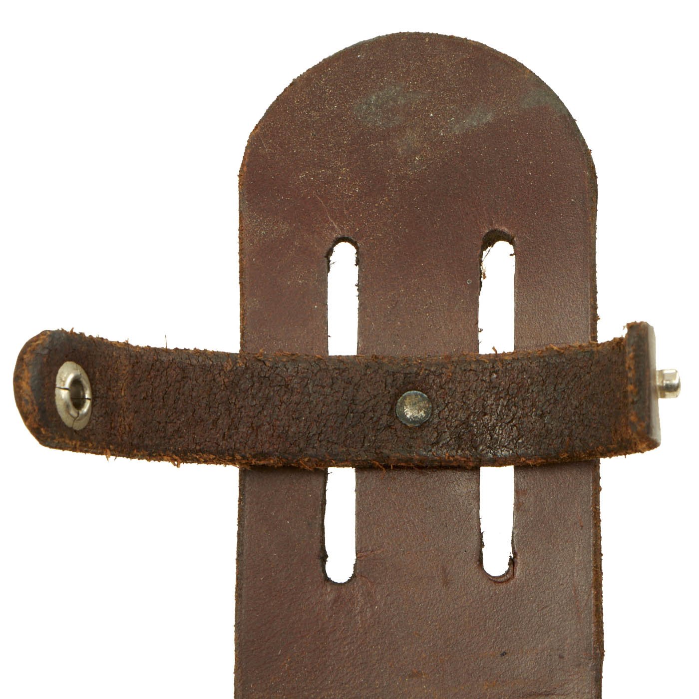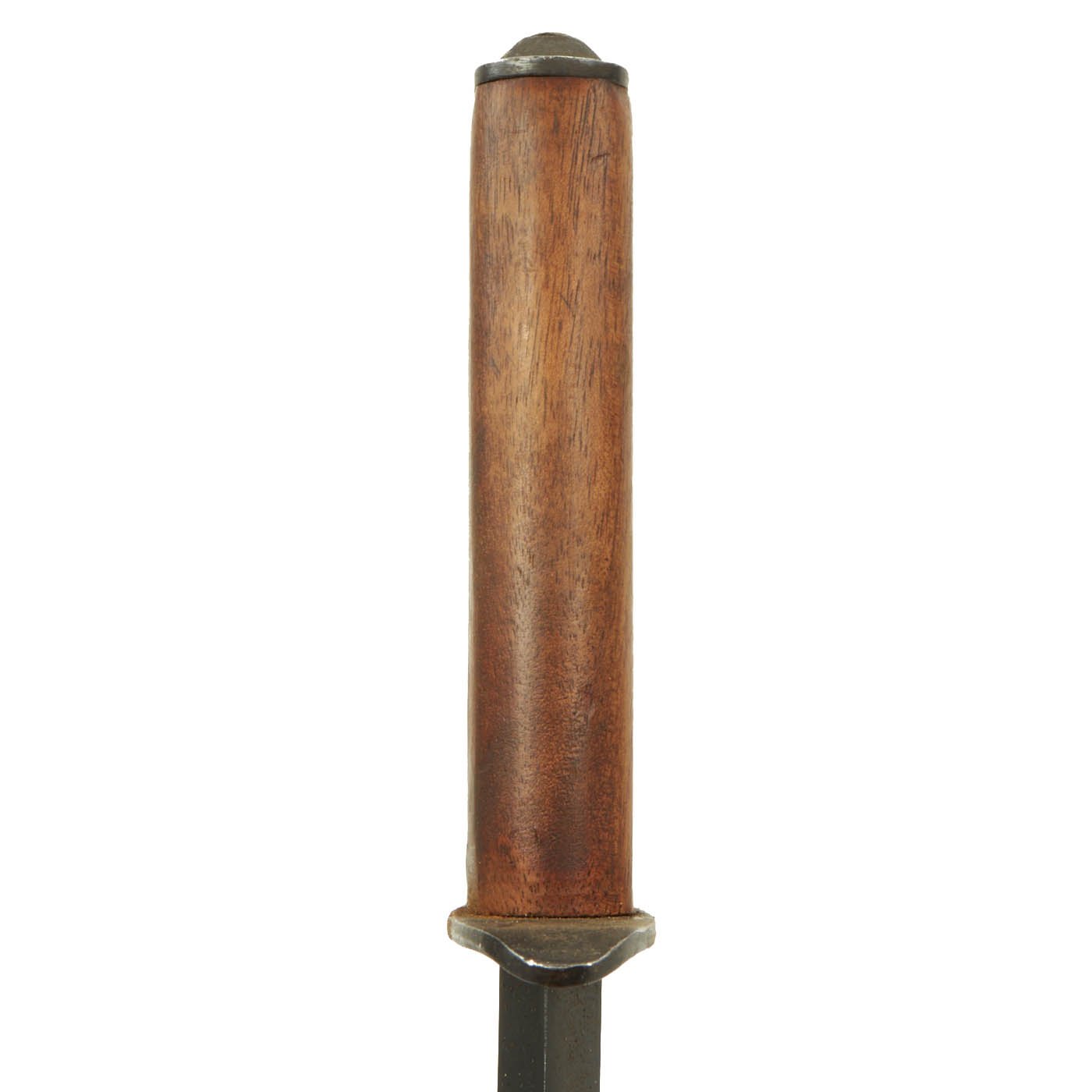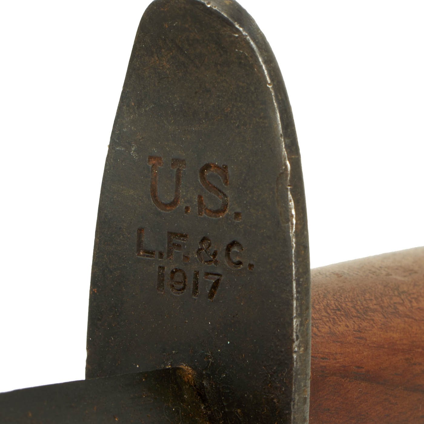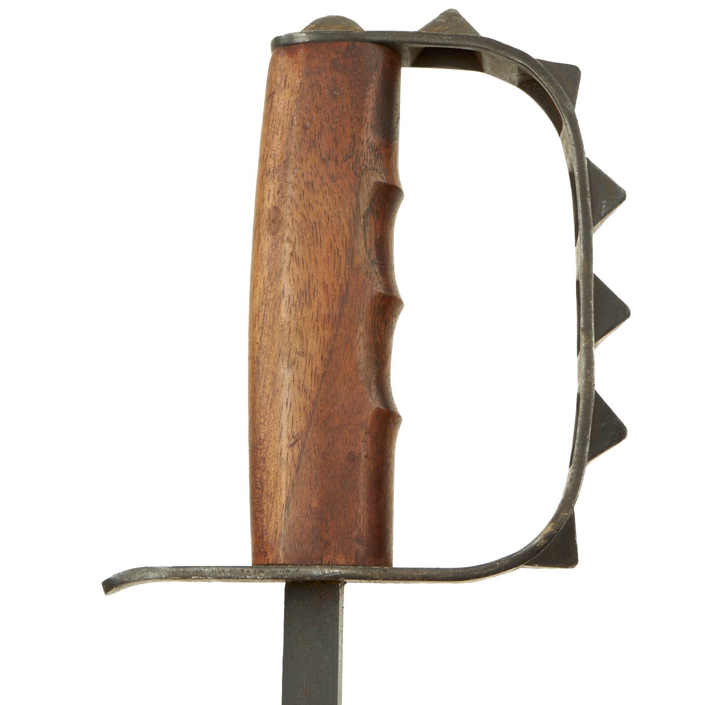 Original Item: Only One Available. This very good condition Model 1917 trench knife has a wood handle, triangular stiletto blade, and replica WWII style leather scabbard a belt loop and securing strap.