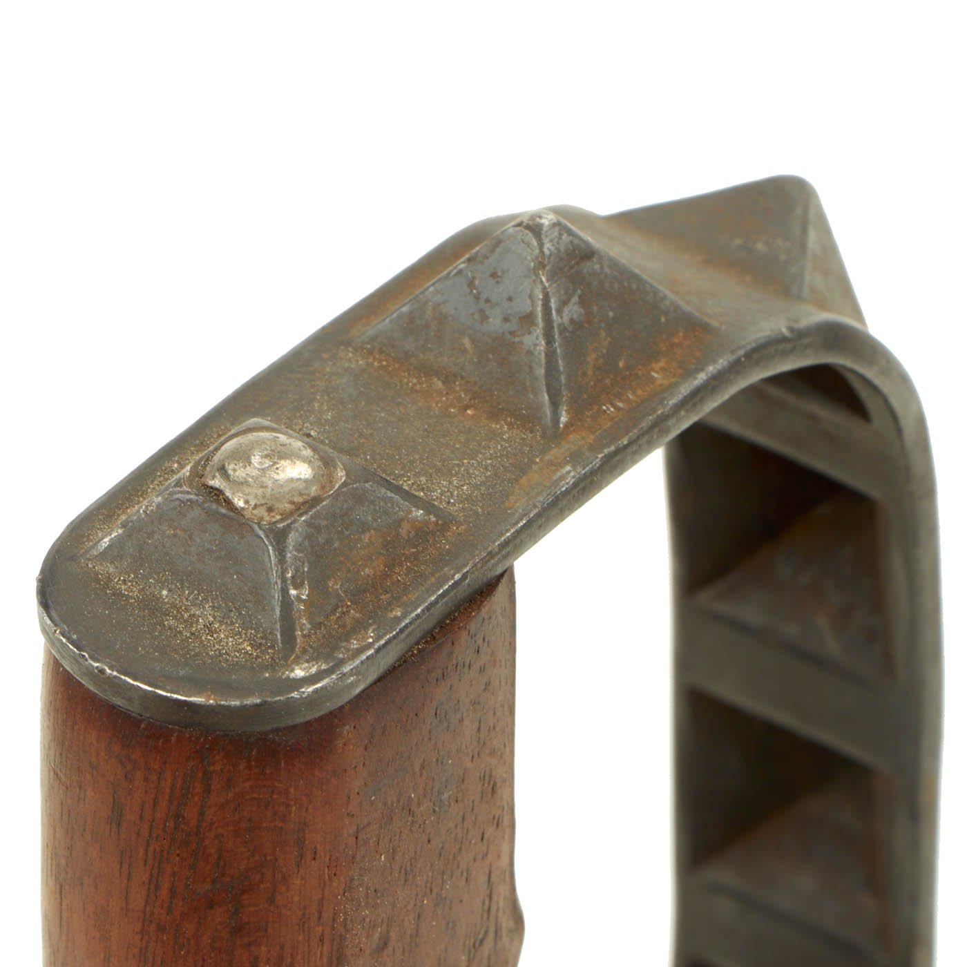 • Triangular 9" steel blade, which is in excellent condition. Definitely one of the better ones we have seen, with minimal wear on the corners, and just a bit of chipping on one side. Original finish is very well retained.
