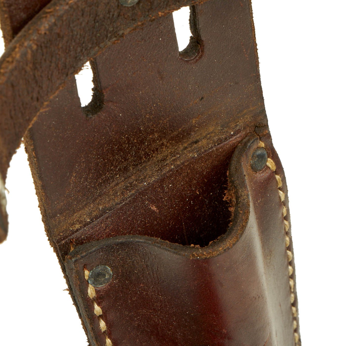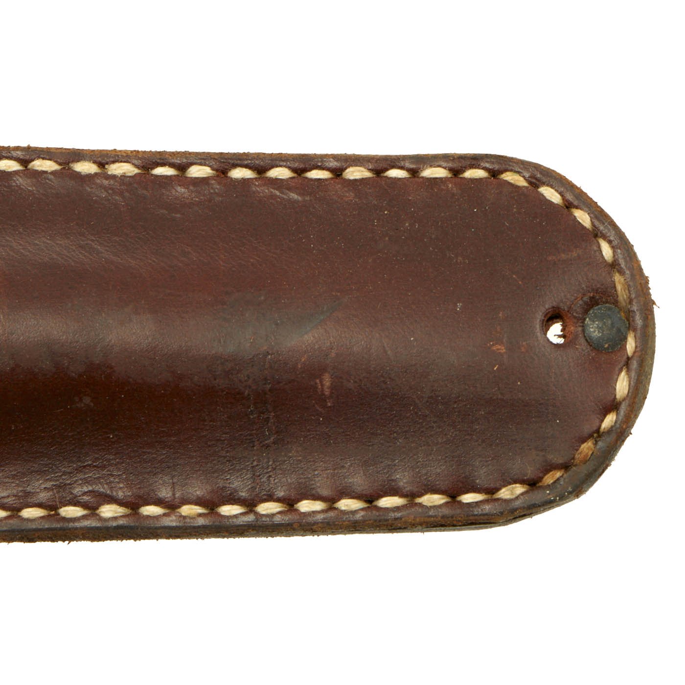 Overall condition is very good, with a great lightly worn patina. There is no play in the the crossguard or handle. It has been fitted with a very nice WWII style custom leather scabbard, which looks to be of relatively recent manufacture. The shape is definitely designed to fit this type of knife.