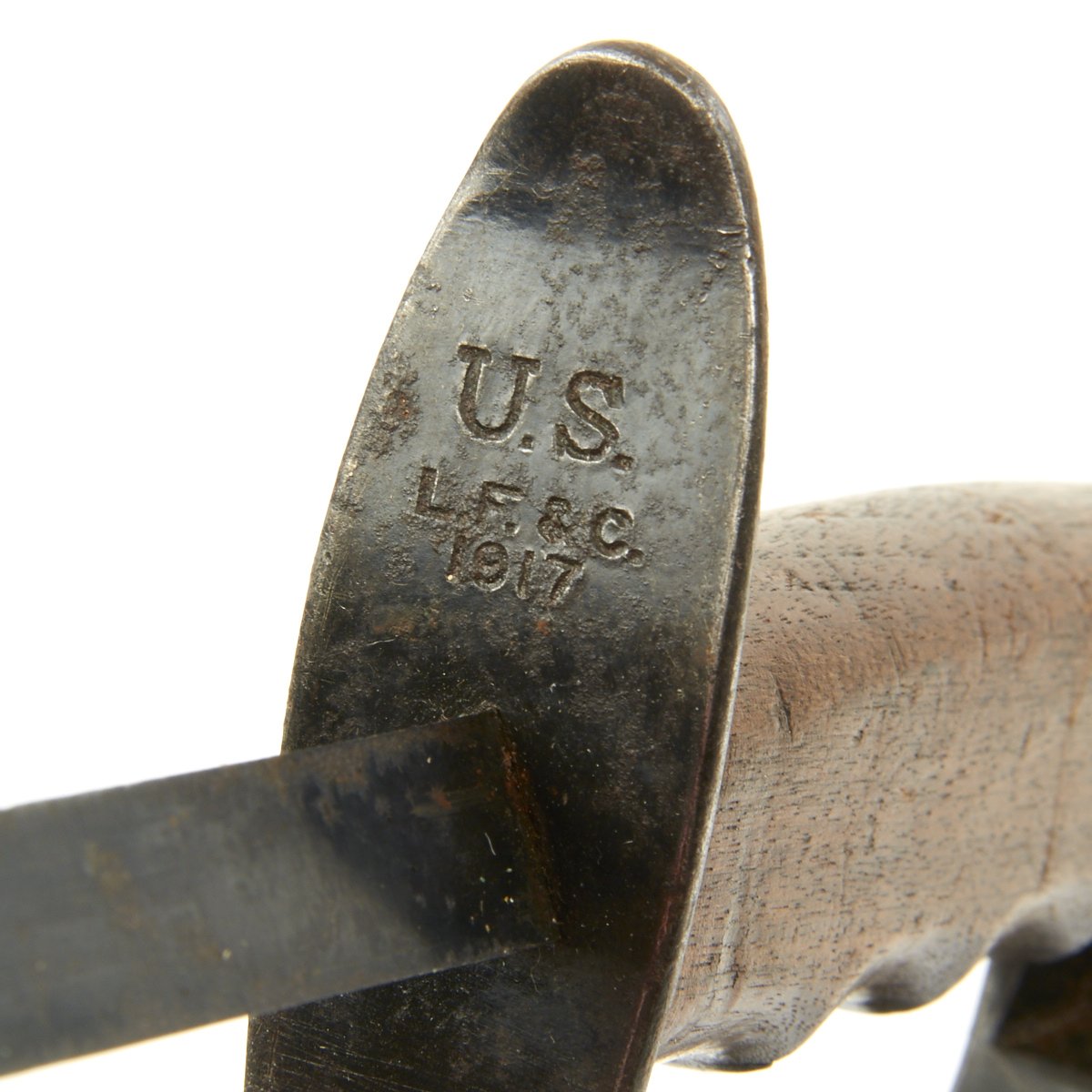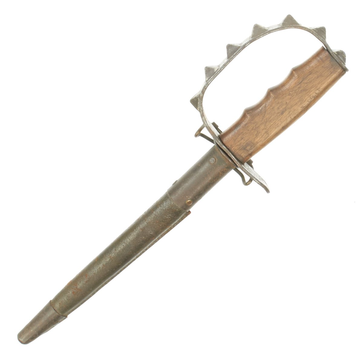 Original Item: Only One Available. This very good condition Model 1917 trench knife has a wood handle, triangular stiletto blade, and leather scabbard with standard GI Pistol belt hook attachment.