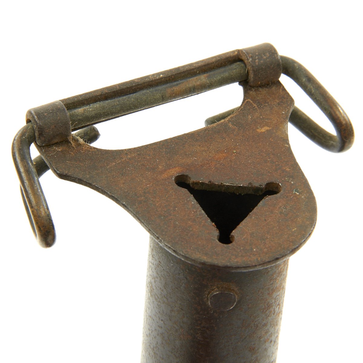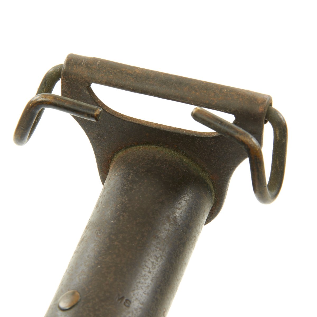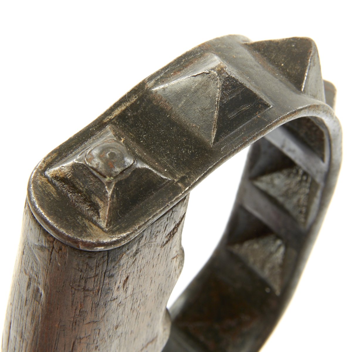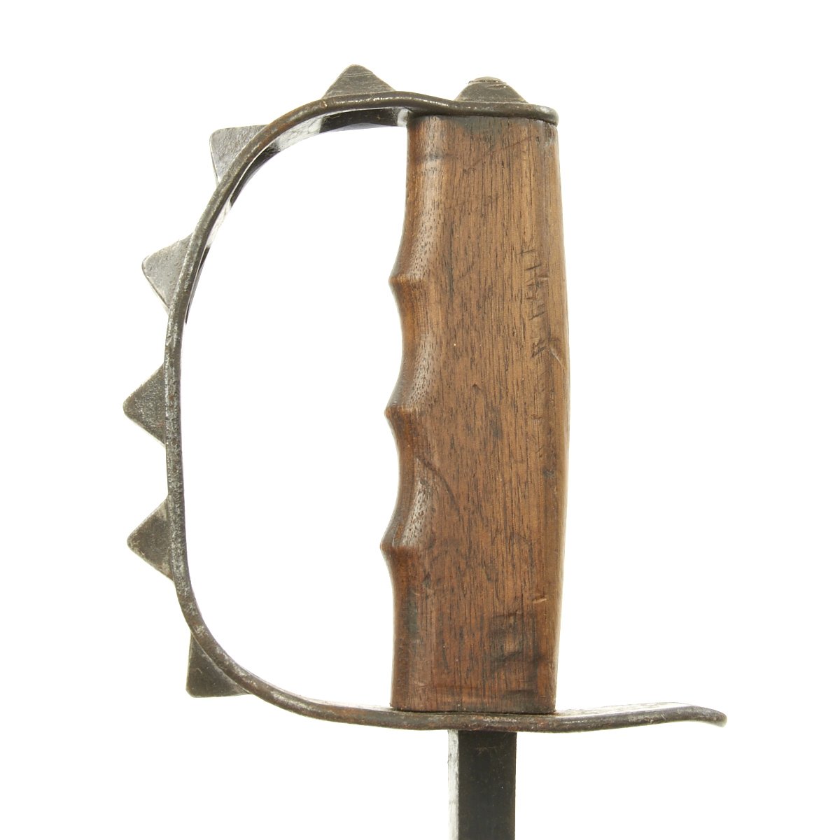 • Good condition spiked steel hand guard, with no major dents or bends. It has a good deal of the original finish, though there is oxidation in areas.