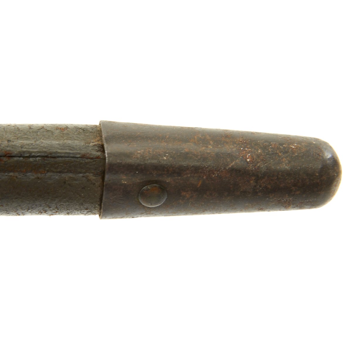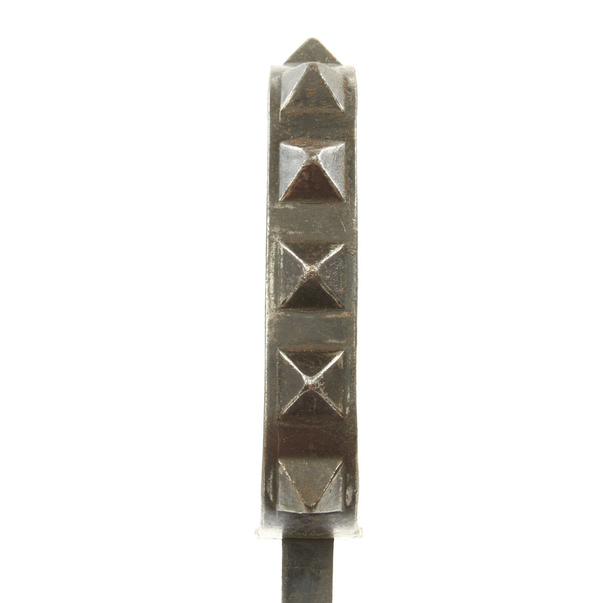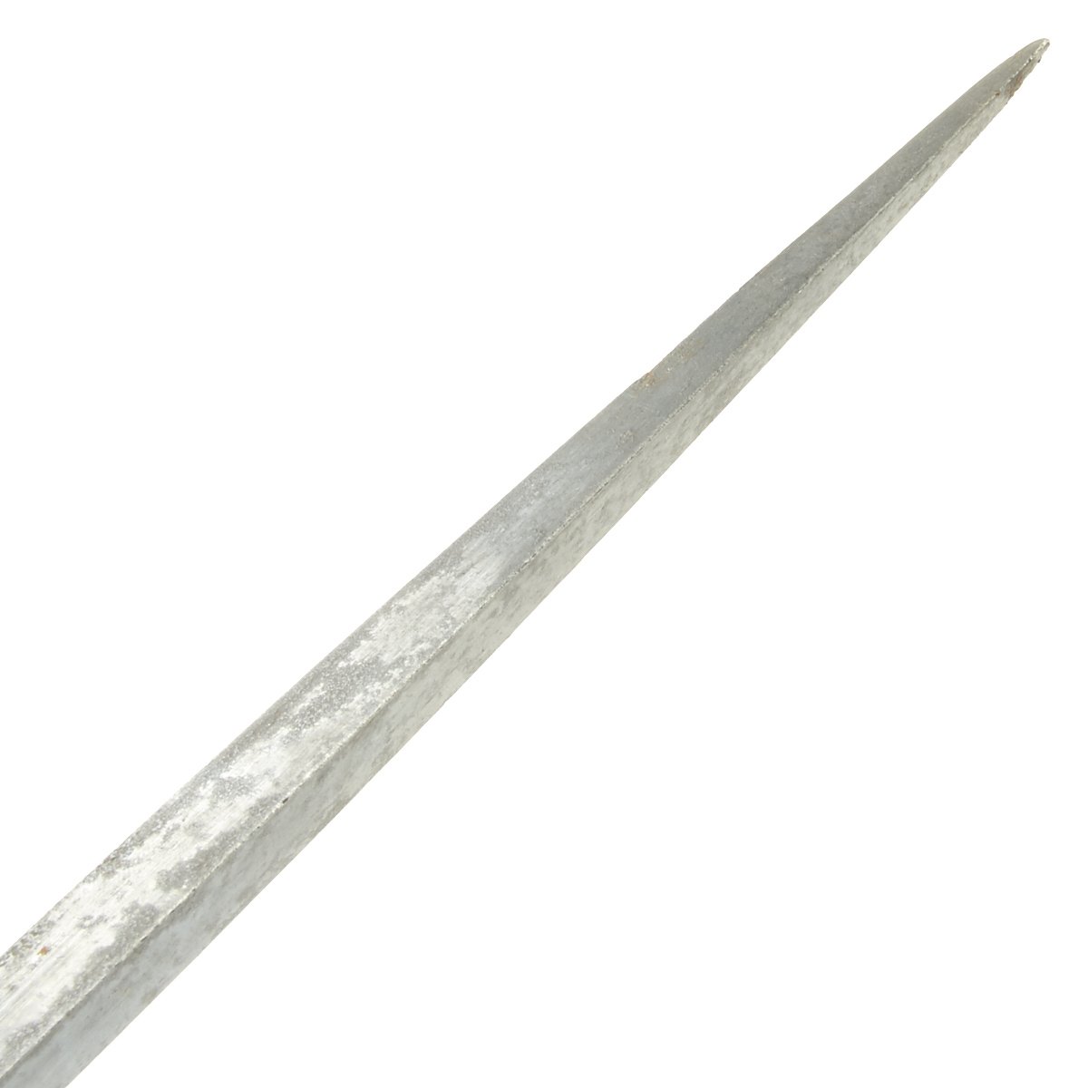 • Triangular 9" steel blade. The blade has a majority of the original finish, probably around 60%, with the usual runner wear from the scabbard. There is also surface rust on the edges, as well as near the tip of the blade, which is slightly blunted.