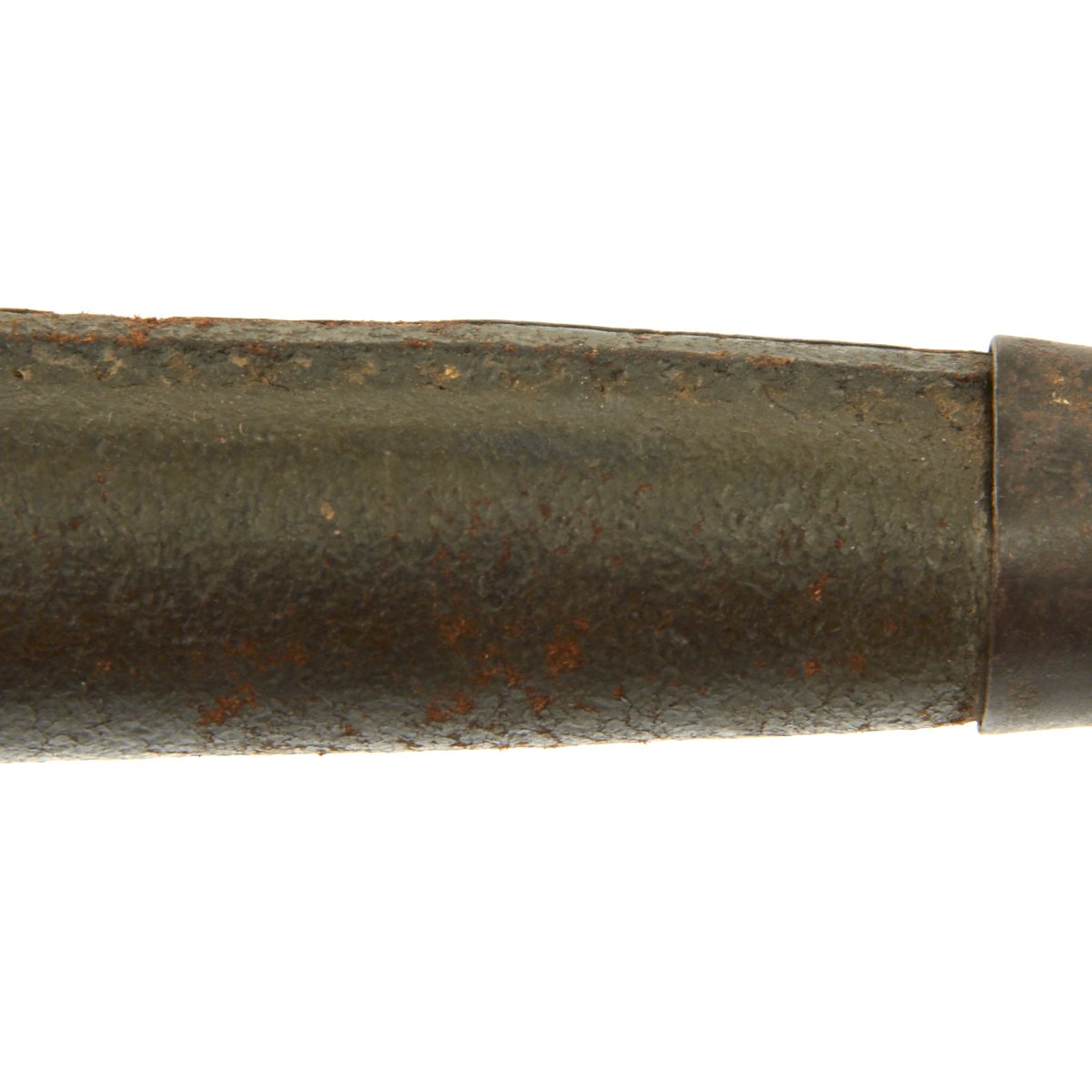 • Leather scabbard faintly marked JEWELL - 1918. Scabbard is in very good condition with nice leather that still has most of the original green painted finish. The fittings have a lot of the original finish, with some wear and oxidation, and one of the tip rivets is missing. Throat and tip are both marked MB.
