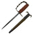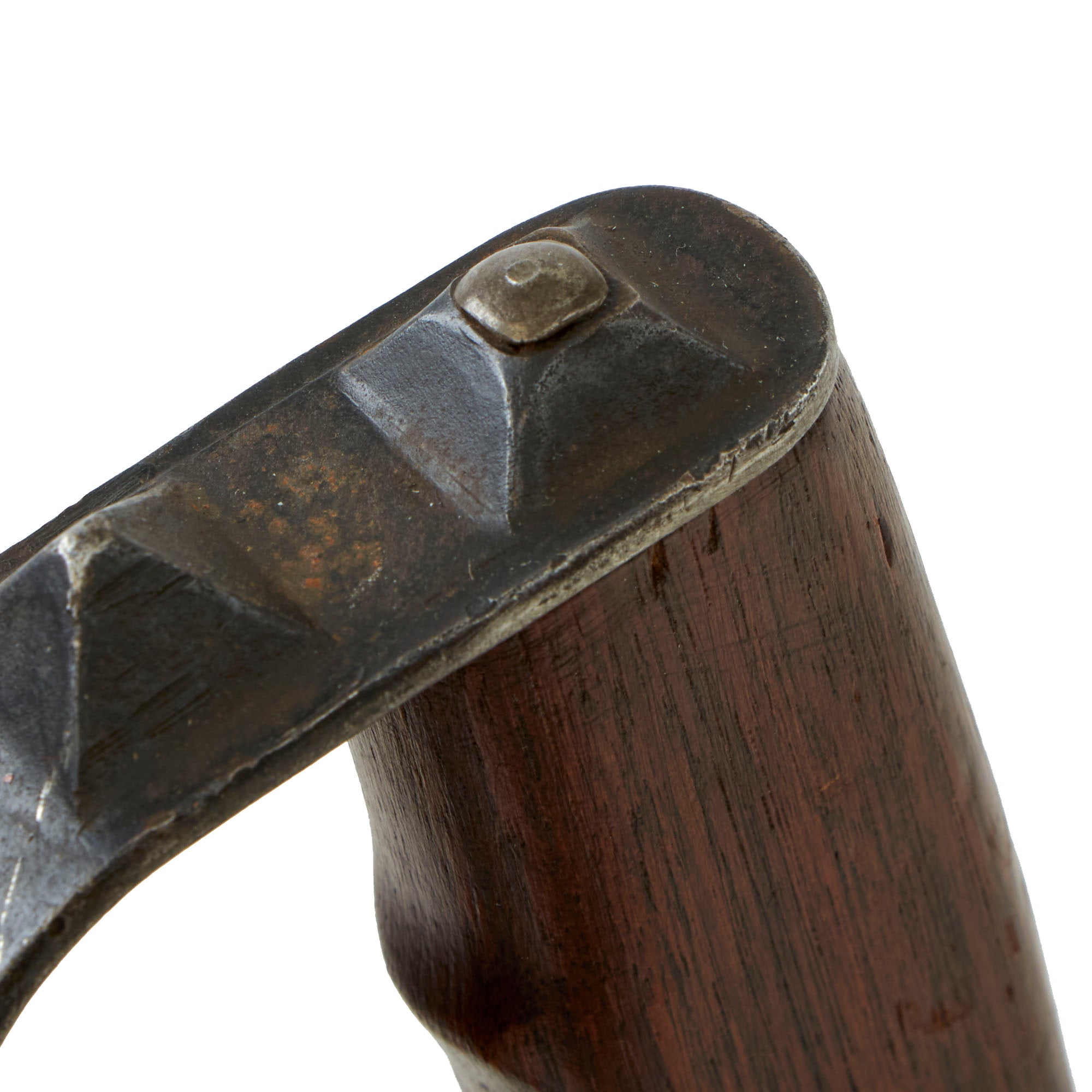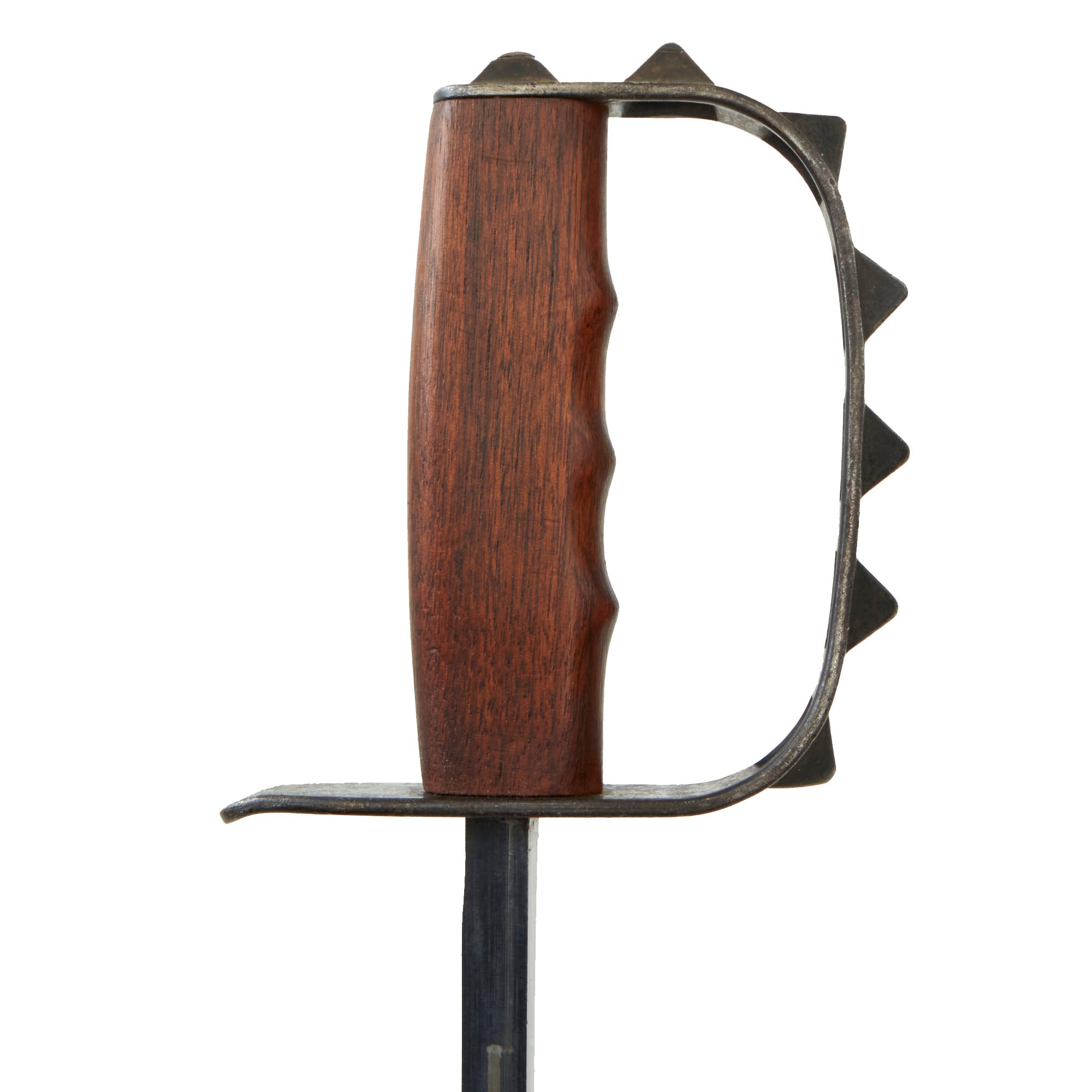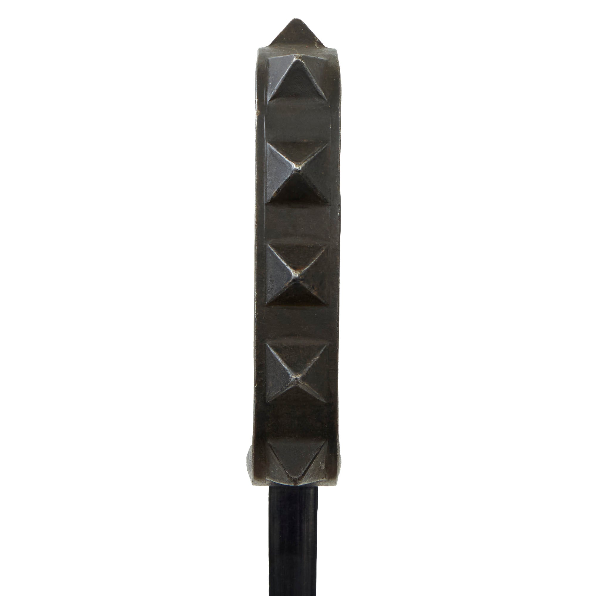 • Triangular 9" black steel blade. Blade has more than 80% of original finish, with runner marks and some wear to the point, which is slightly bent and was reprofiled slightly. The corners are still sharp, and it shows no signs of major damage.