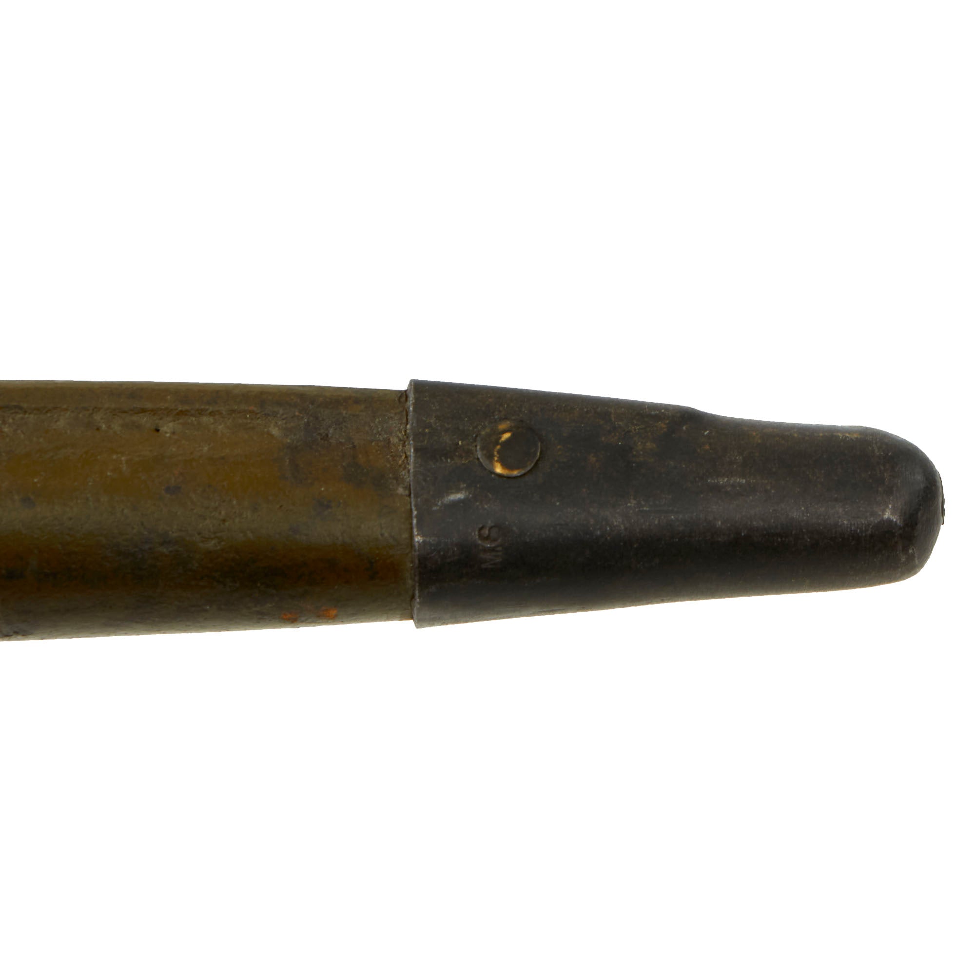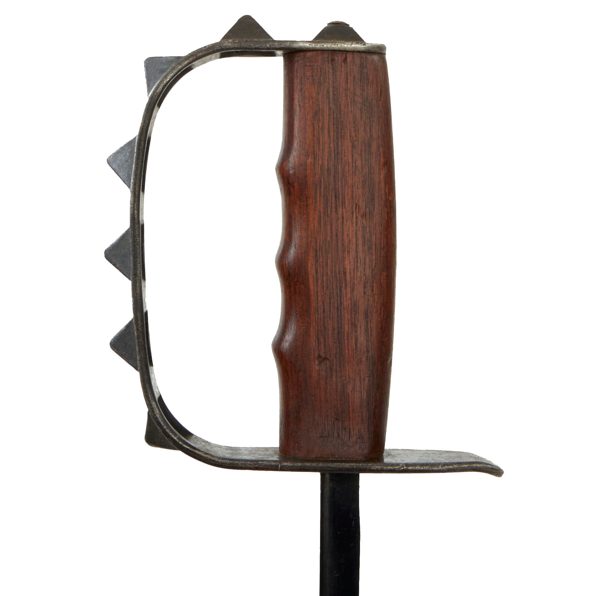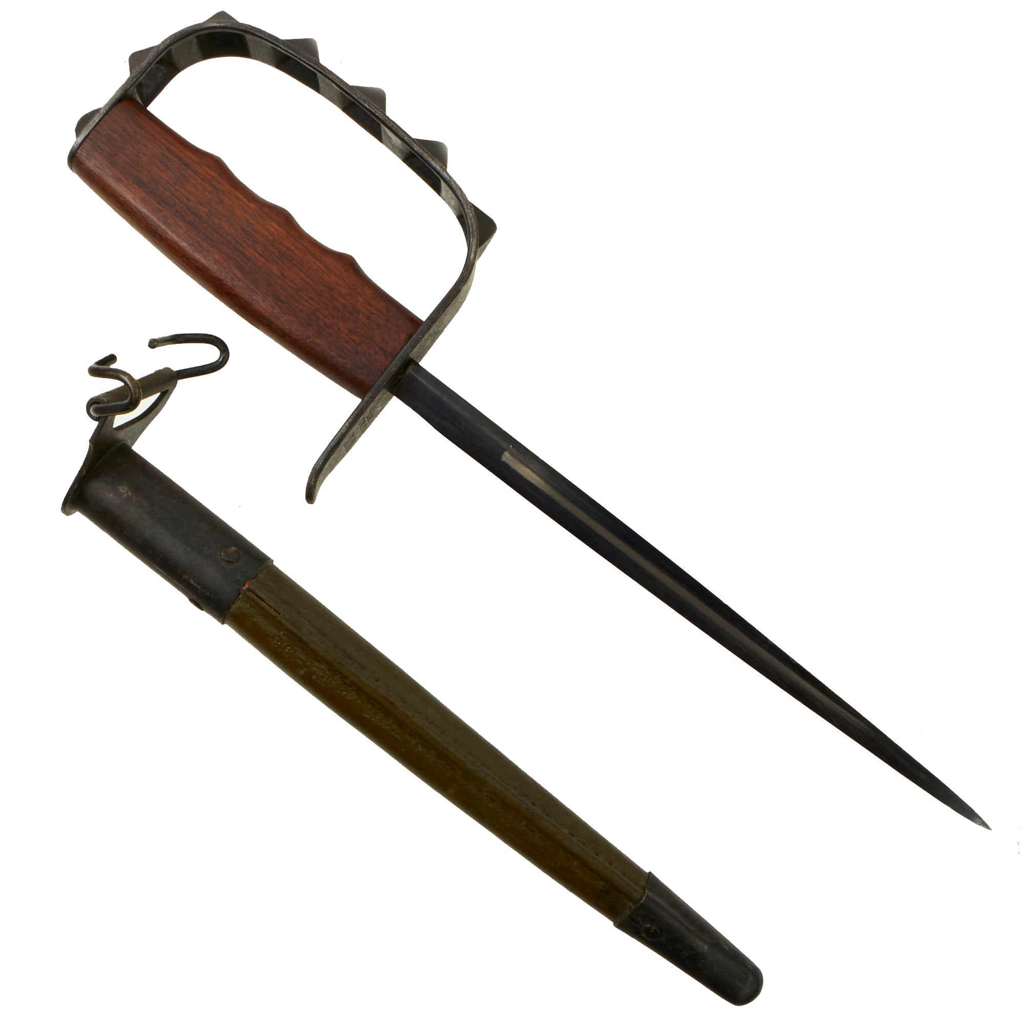 Original Item: Only One Available. This lovely lightly used condition Model 1917 trench knife has a wood handle, triangular stiletto blade, and leather scabbard with standard GI Pistol belt hook attachment.