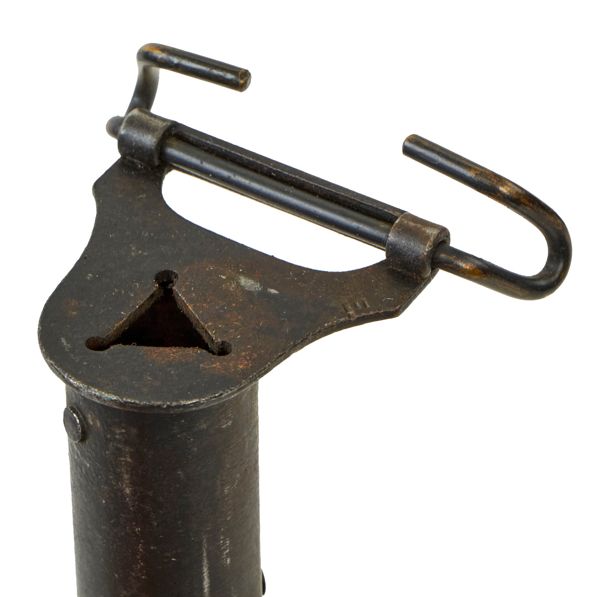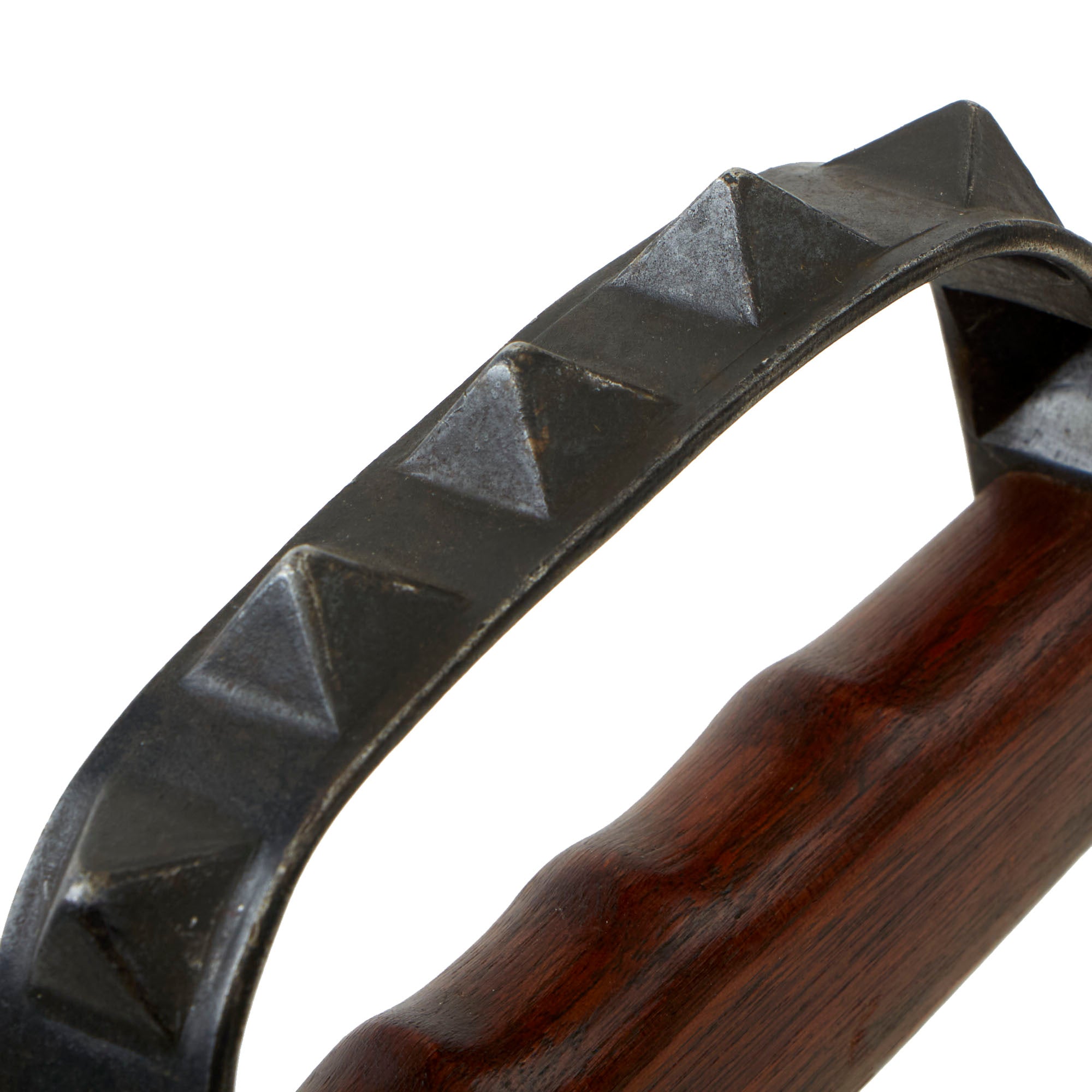 • Very good condition spiked steel hand guard, with no dents or bends we can see. There is some wear to the finish and light oxidation, but no major rust.