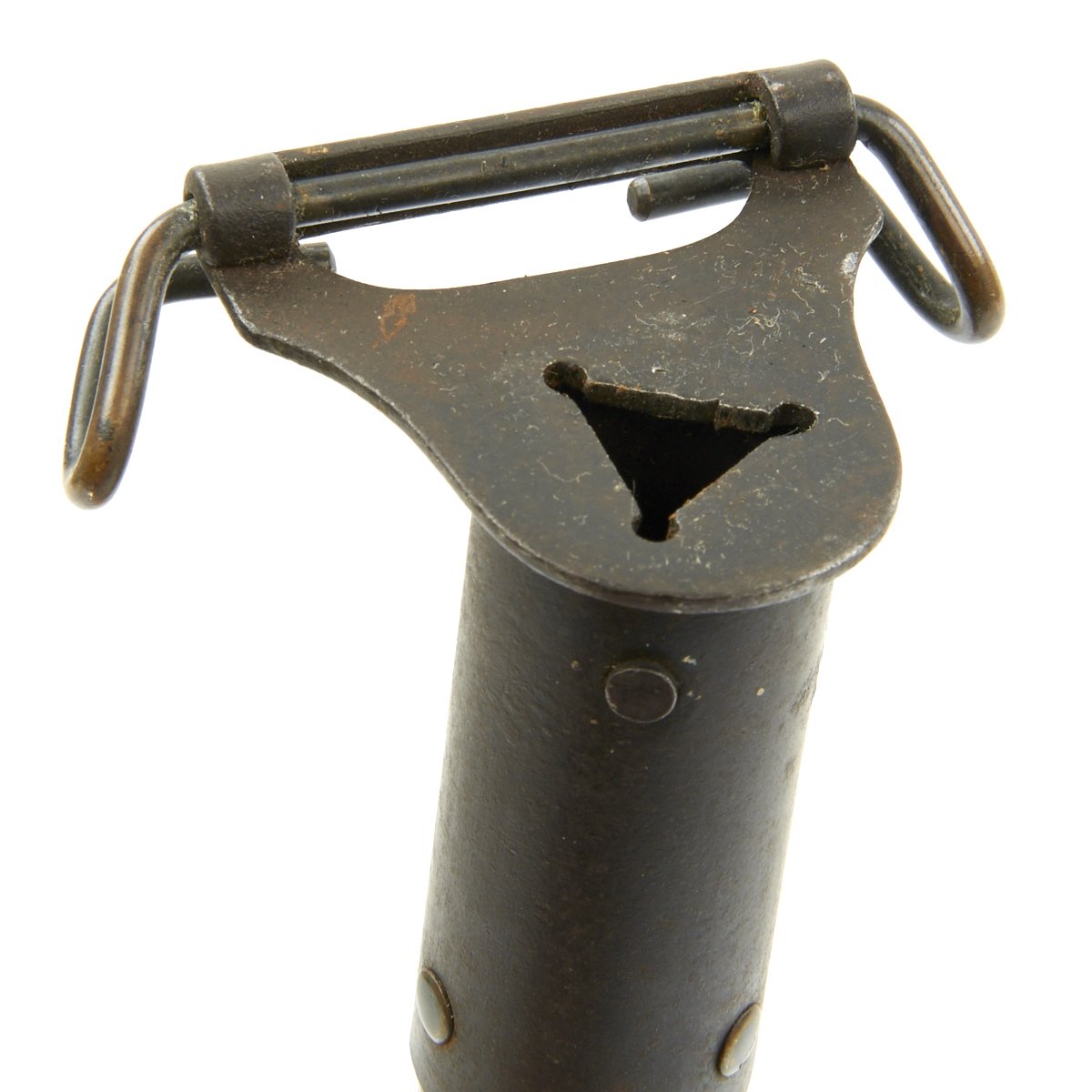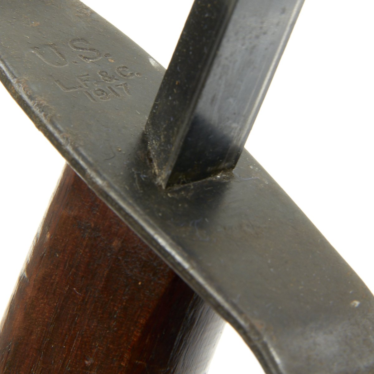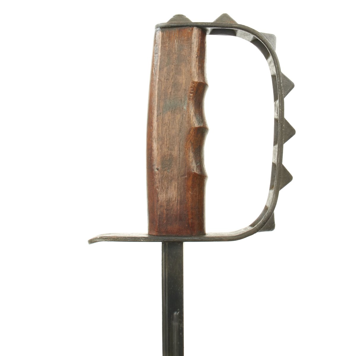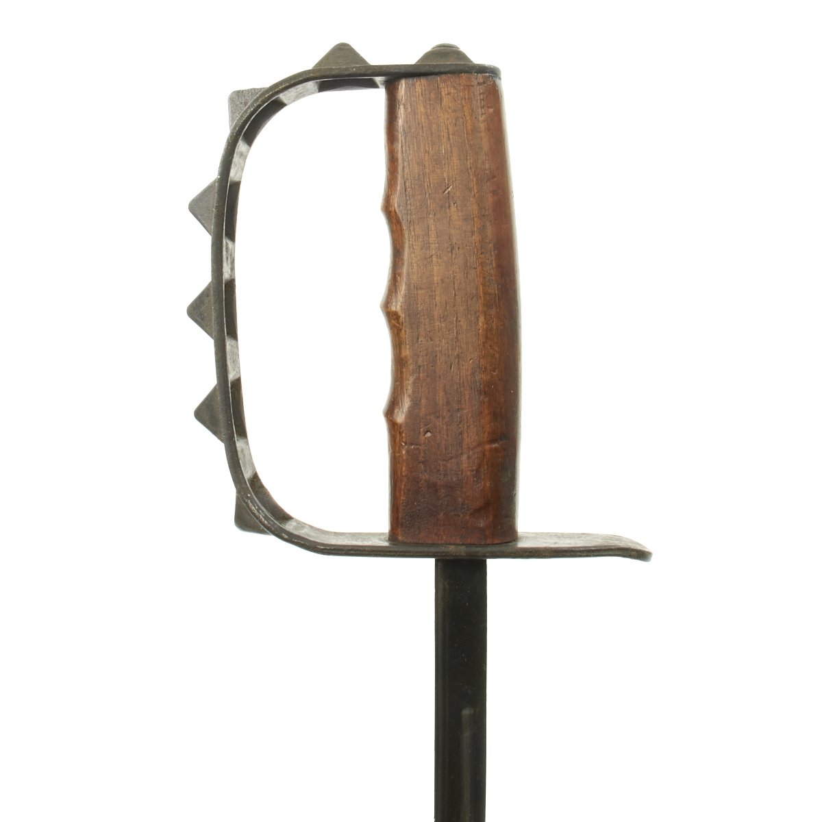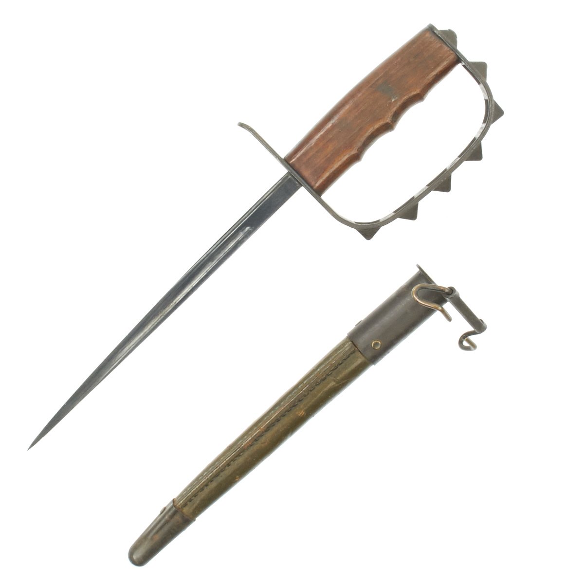Original Item: Only One Available. This very good condition Model 1917 trench knife has a wood handle, triangular stiletto blade, and leather scabbard with standard GI Pistol belt hook attachment.