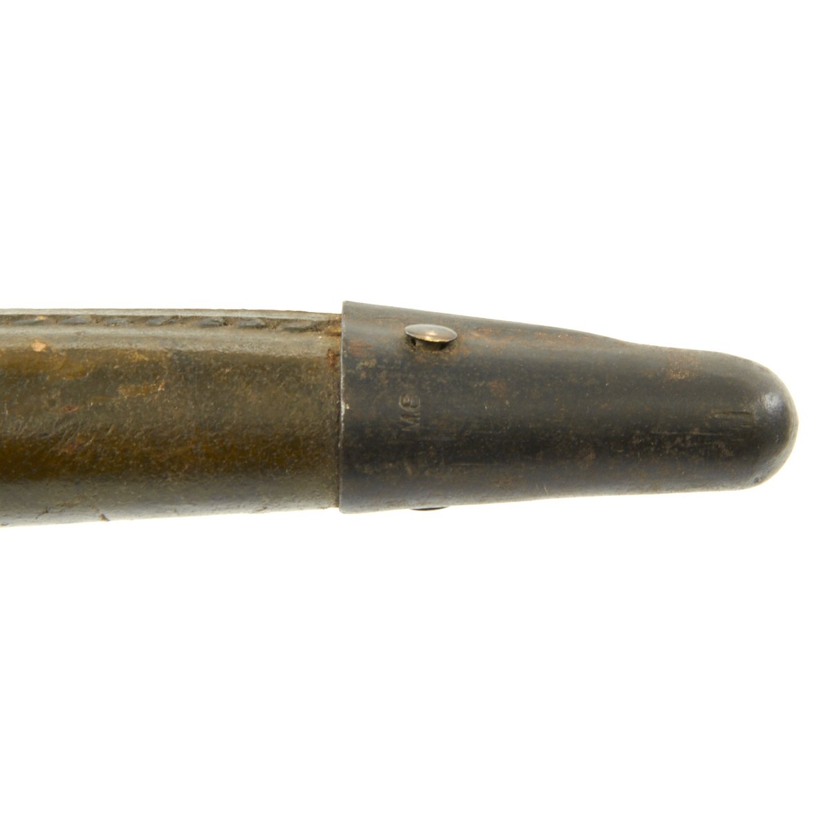 • Leather scabbard marked JEWELL - 1918. Scabbard is in very good condition with great leather that still has almost all of the original green painted finish. The fittings have a lot of the original finish, with some wear and oxidation, and all rivets are intact. Throat and tip are both marked MB.