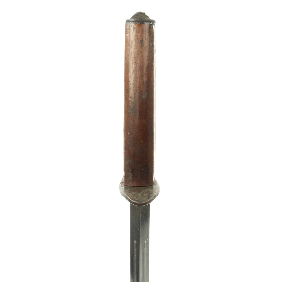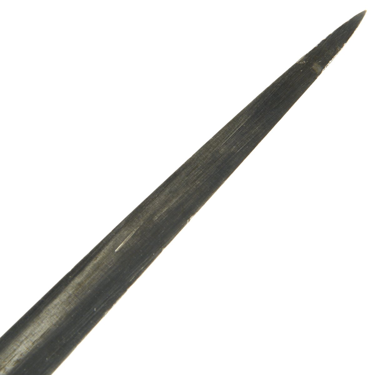 • Triangular 9" steel blade. The blade has most of the original finish, probably around 75%, with the usual runner wear from the scabbard. There are some small bits of oxidation in places, but the blade is solid, and has clean edges with a sharp point. There are just a few small dents on the corners
