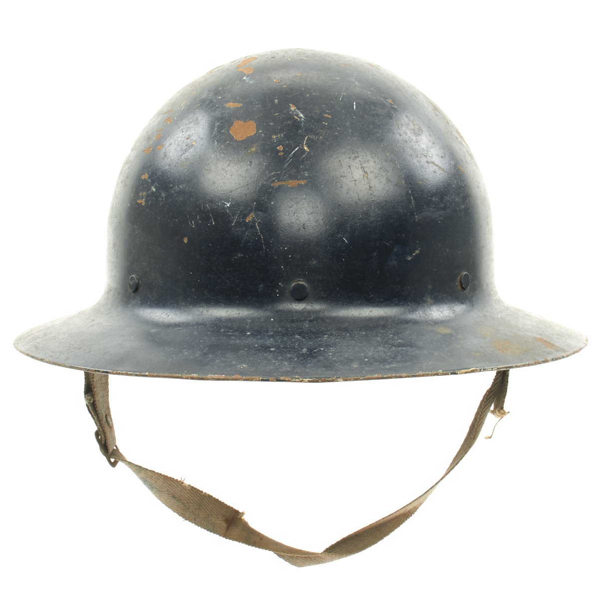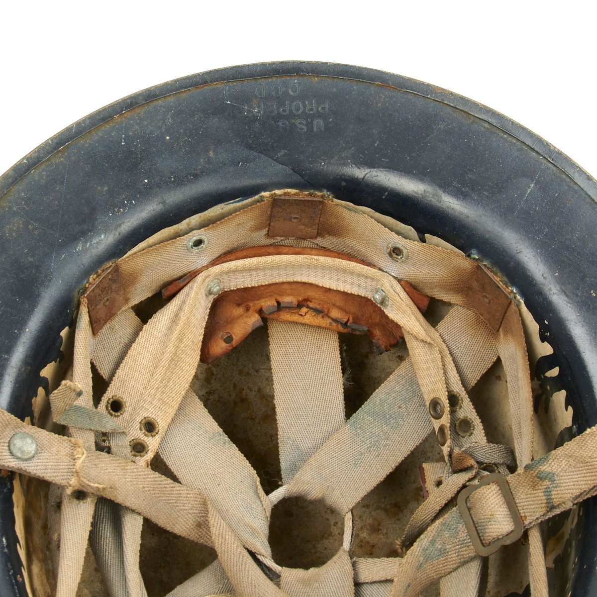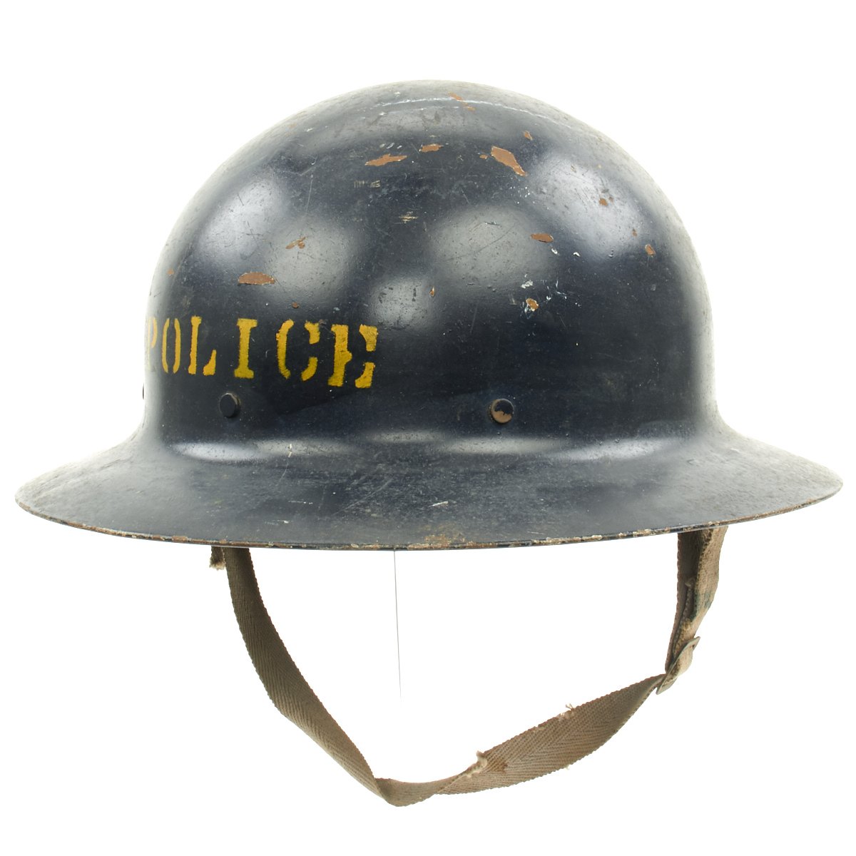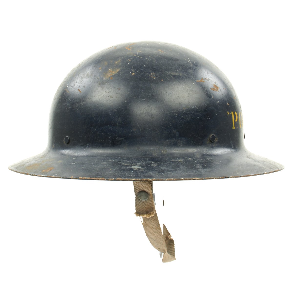 Original Item: Only One Available. This is a helmet original made for WWI that was reissued and repainted at the outbreak of WW2 for use in the Civil Defense program specifically the United States Citizens Defense Corps Auxiliary Police. It was then repainted and reissued for the City of Detroit Police Department. Overall condition is very good with original paint remaining, a WWII issue canvas chin strap and updated WW2 issue web liner.