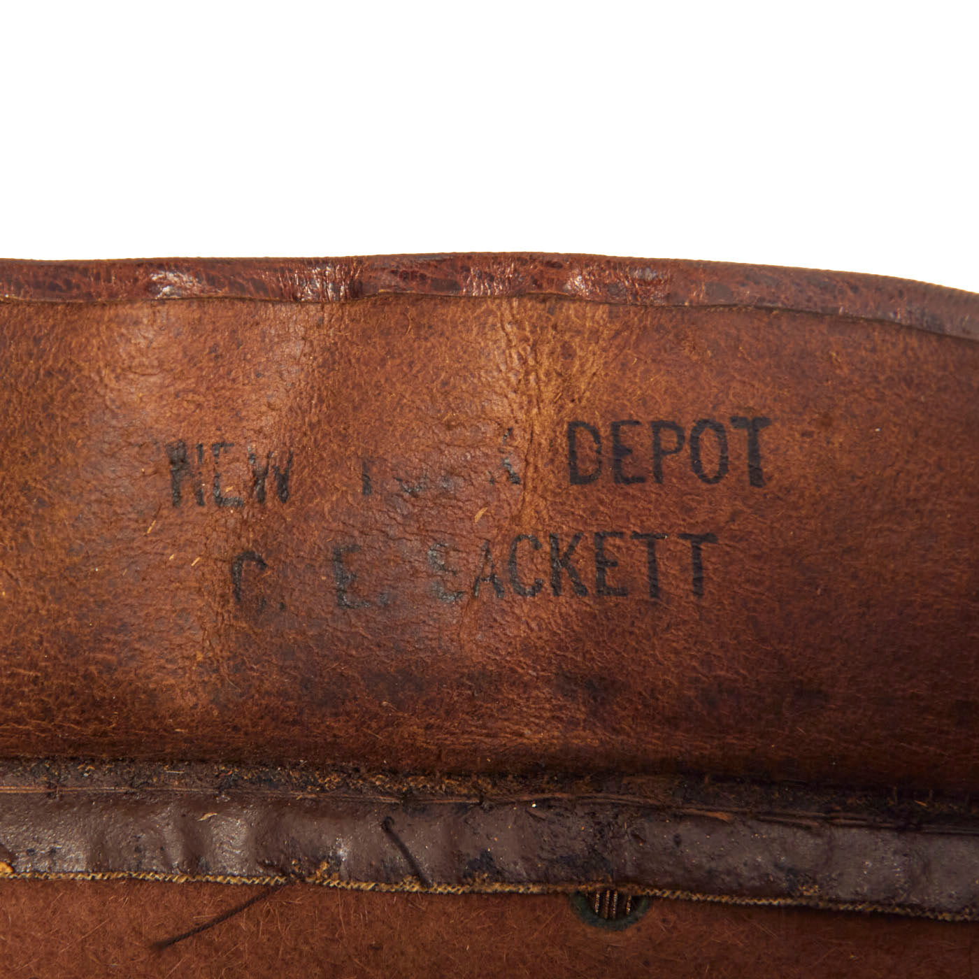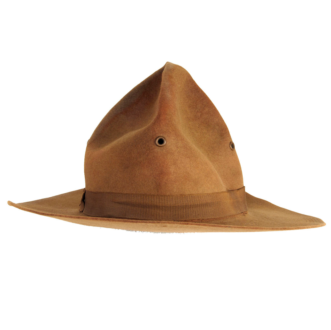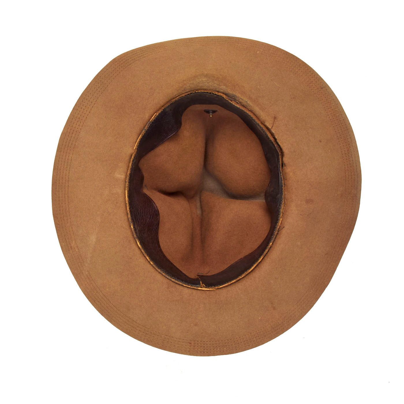 The Campaign Hat is in very good condition considering its age. The leather sweatband is loose on one side, which could easily be repaired if one so desired. There is one tear to the wool felt around the base of the headband, but they do not distract from the displayability of the hat. The original ribbon is intact on the hat, which is a rarity for hats of this age.