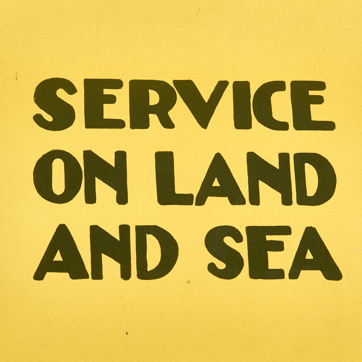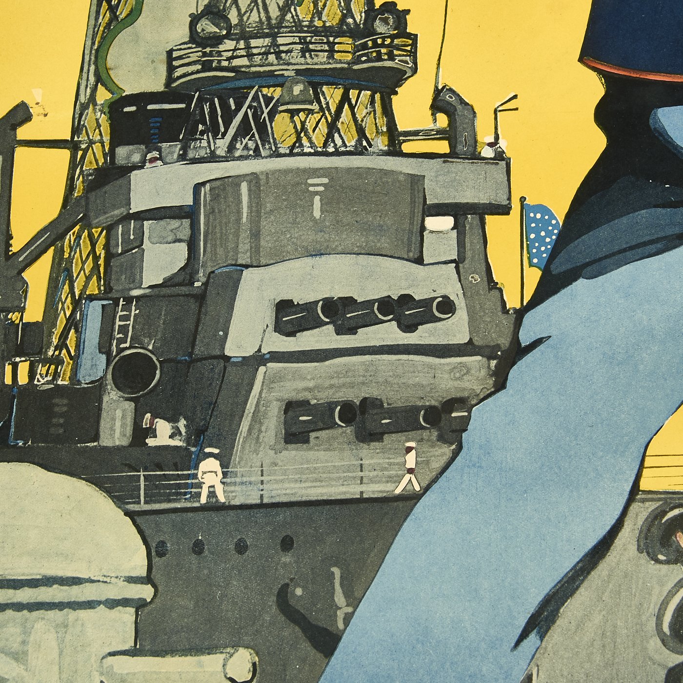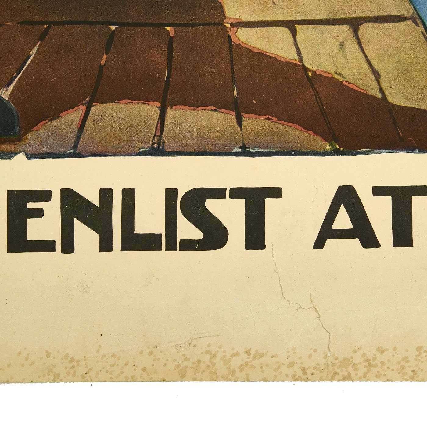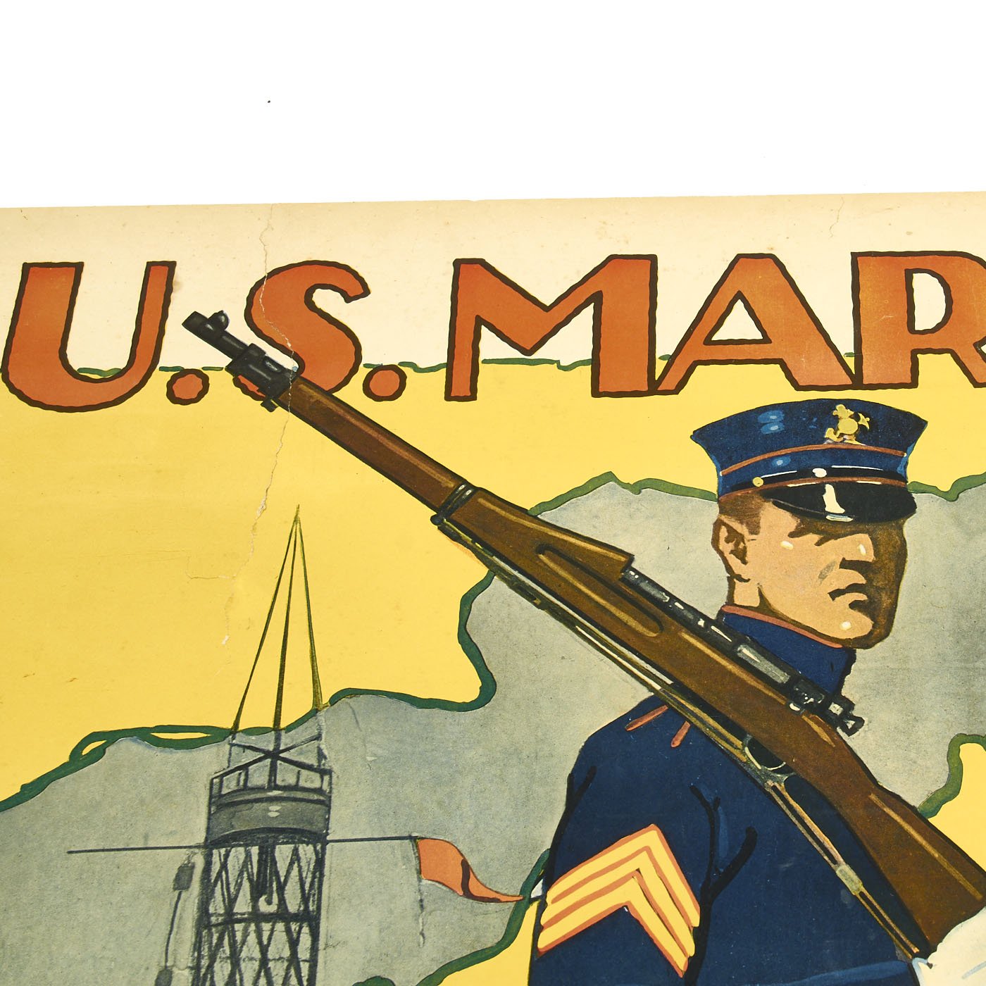 Original Item: Only One Available. Fantastic World War One very rare recruitment poster for the United States Marine Corps. Features the profile of a full-length image of a Marine in a dress uniform with a rifle on his shoulder patrolling the docks; behind him is a partial image of a battleship and a montage of buildings plus an American flag. Created in 1916 by the artist Sidney H. Riesenberg for the U.S. Marine Corps Recruiting office. Poster is mounted to a rigid foam backboard. It measures approximately 39.5" x 29.5”. Overall condition is very good to excellent with vibrant colors and little to fading.