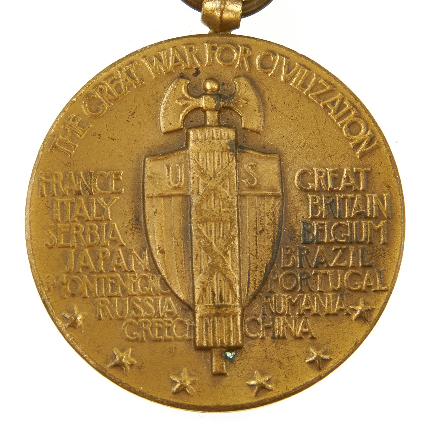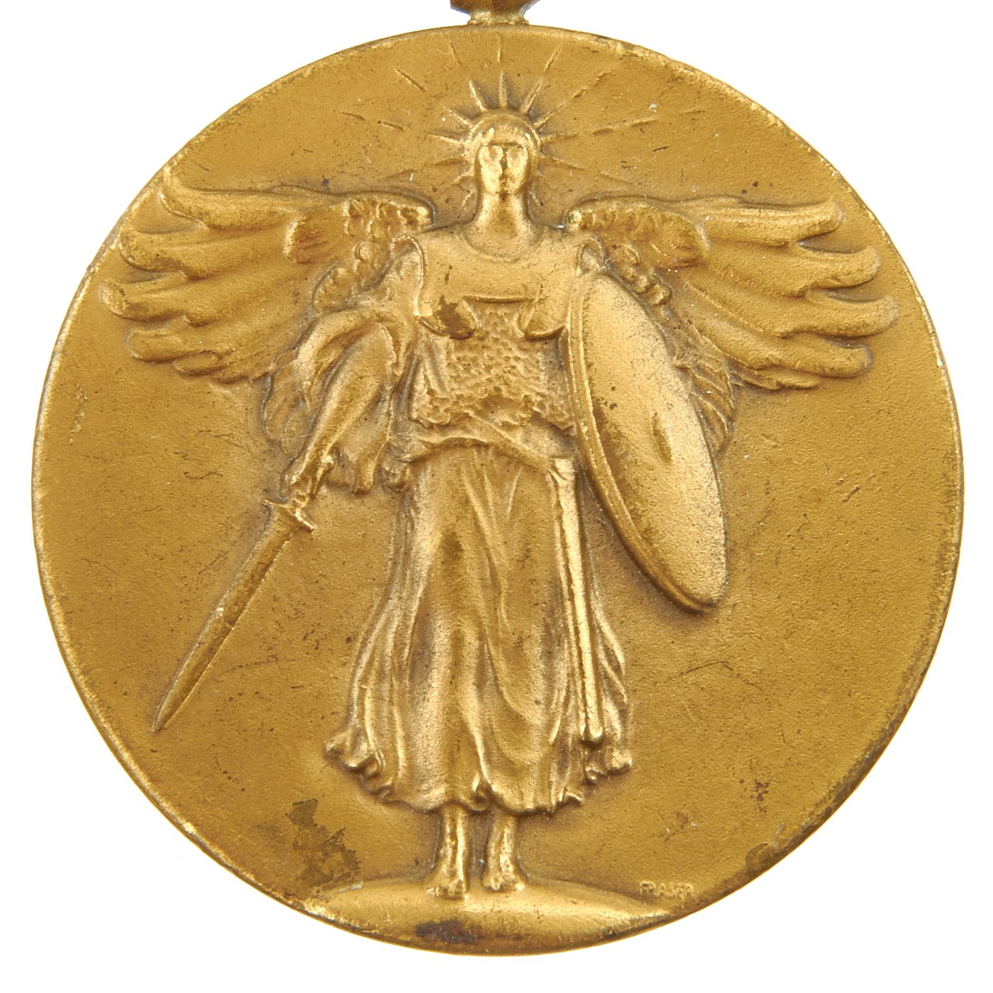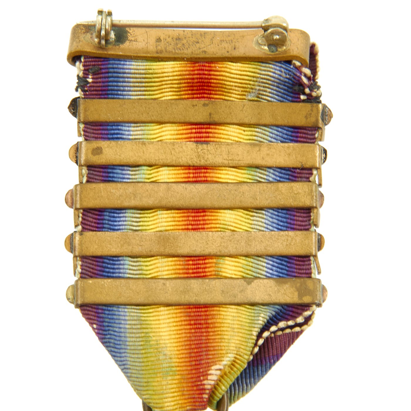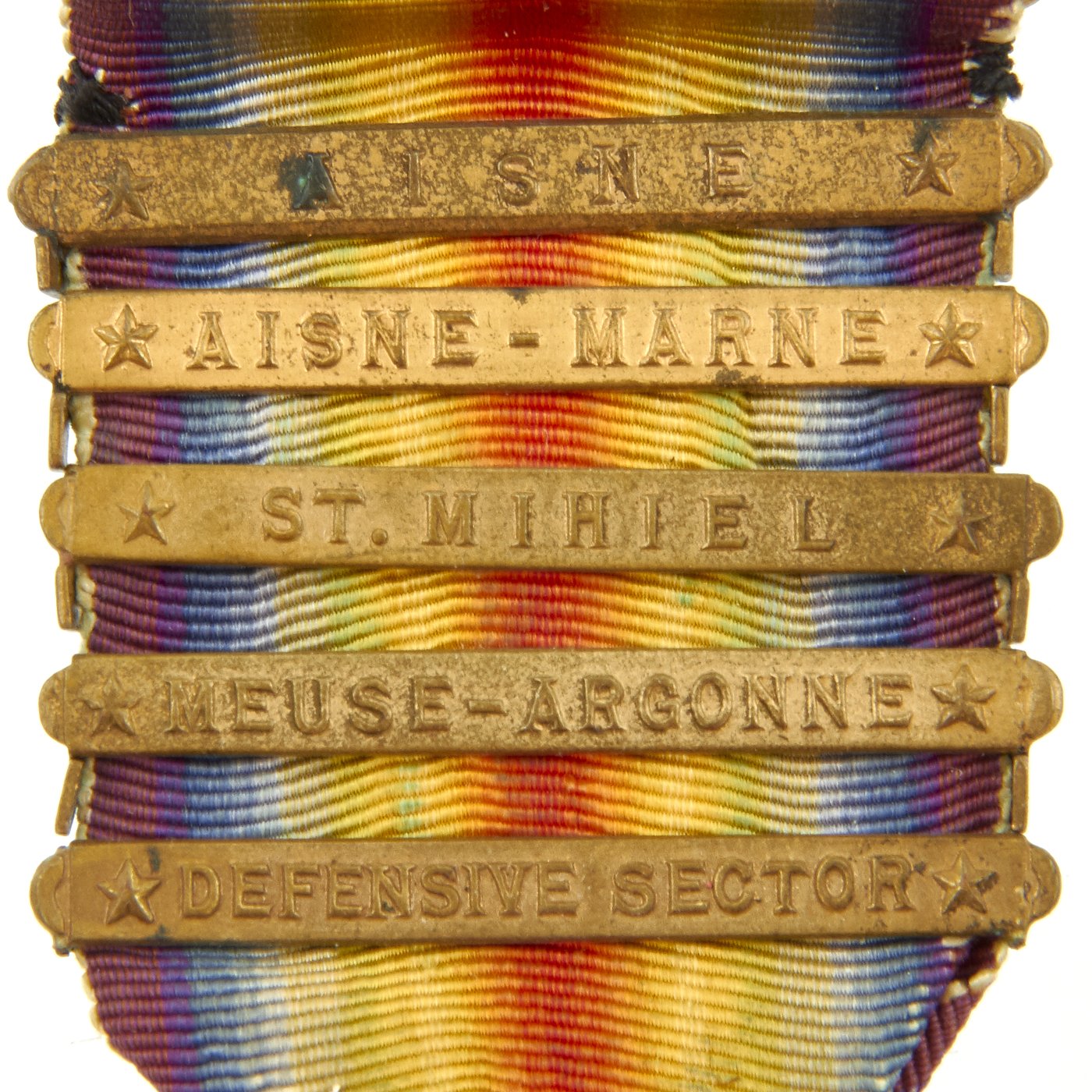 - WWI Victory Medal with Five Campaign Clasps - Aisne, Aisne-Marne, St. Mihiel, Meuse-Argonne, Defensive Sector. Offered in very good condition with functions pin back clasp.
