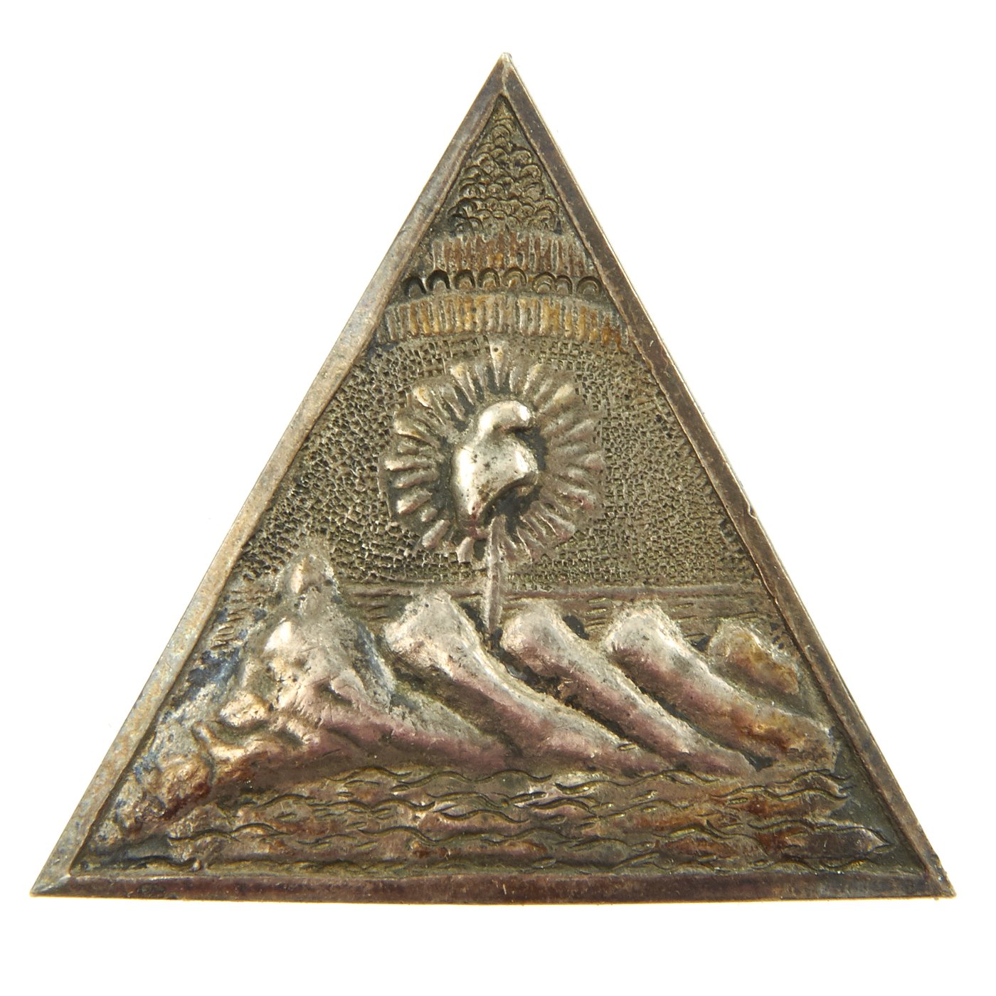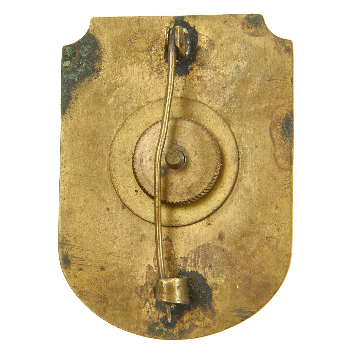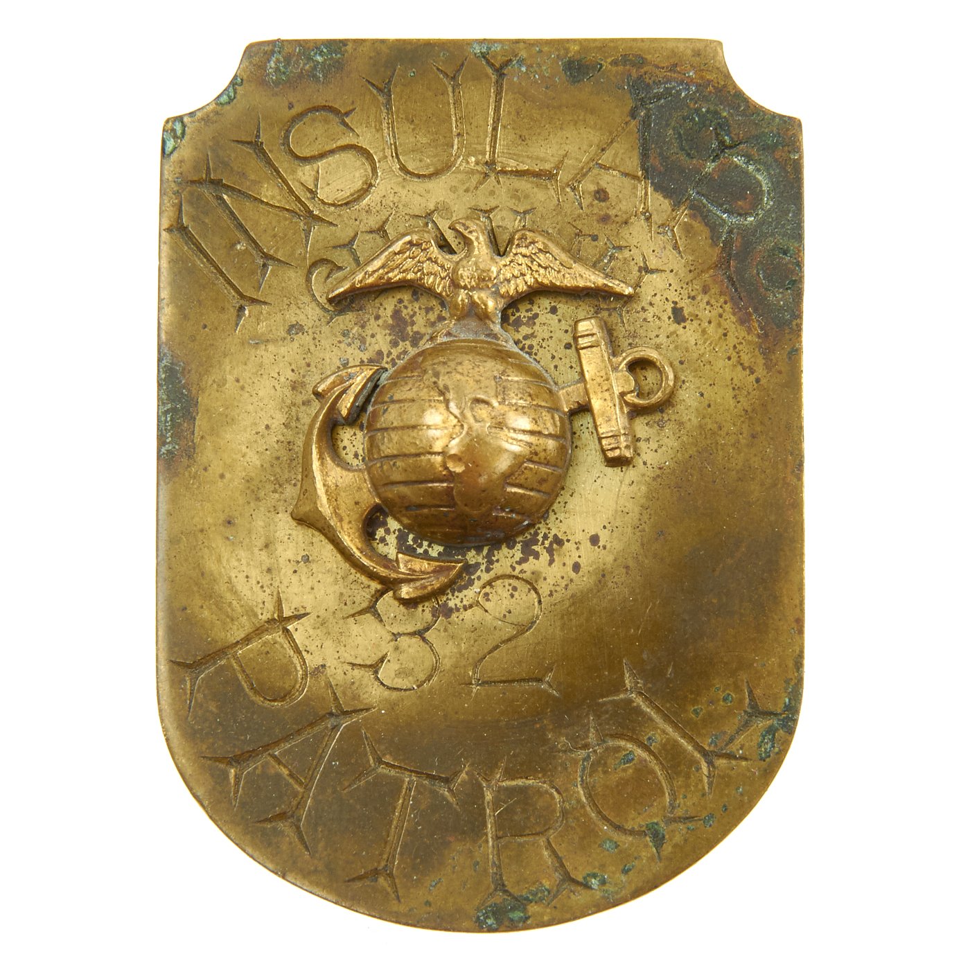 - Brass USMC finback "badge" with EGA that reads INSULAR PATROL 32. This may refer to being assigned to a station in Guam.