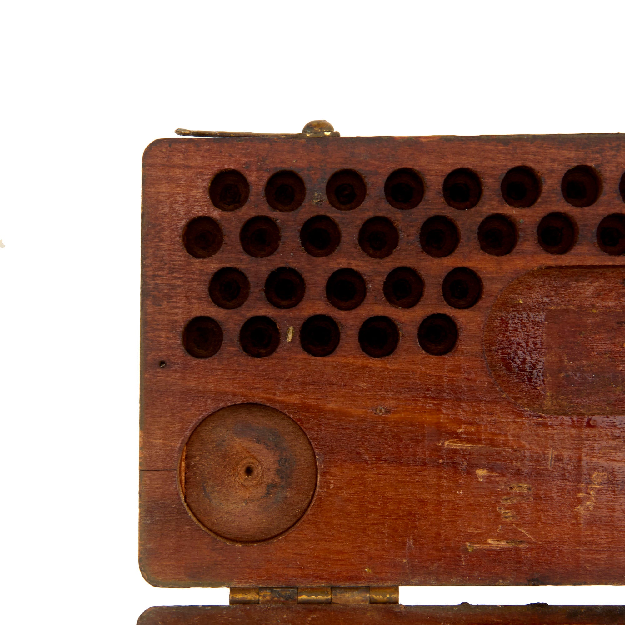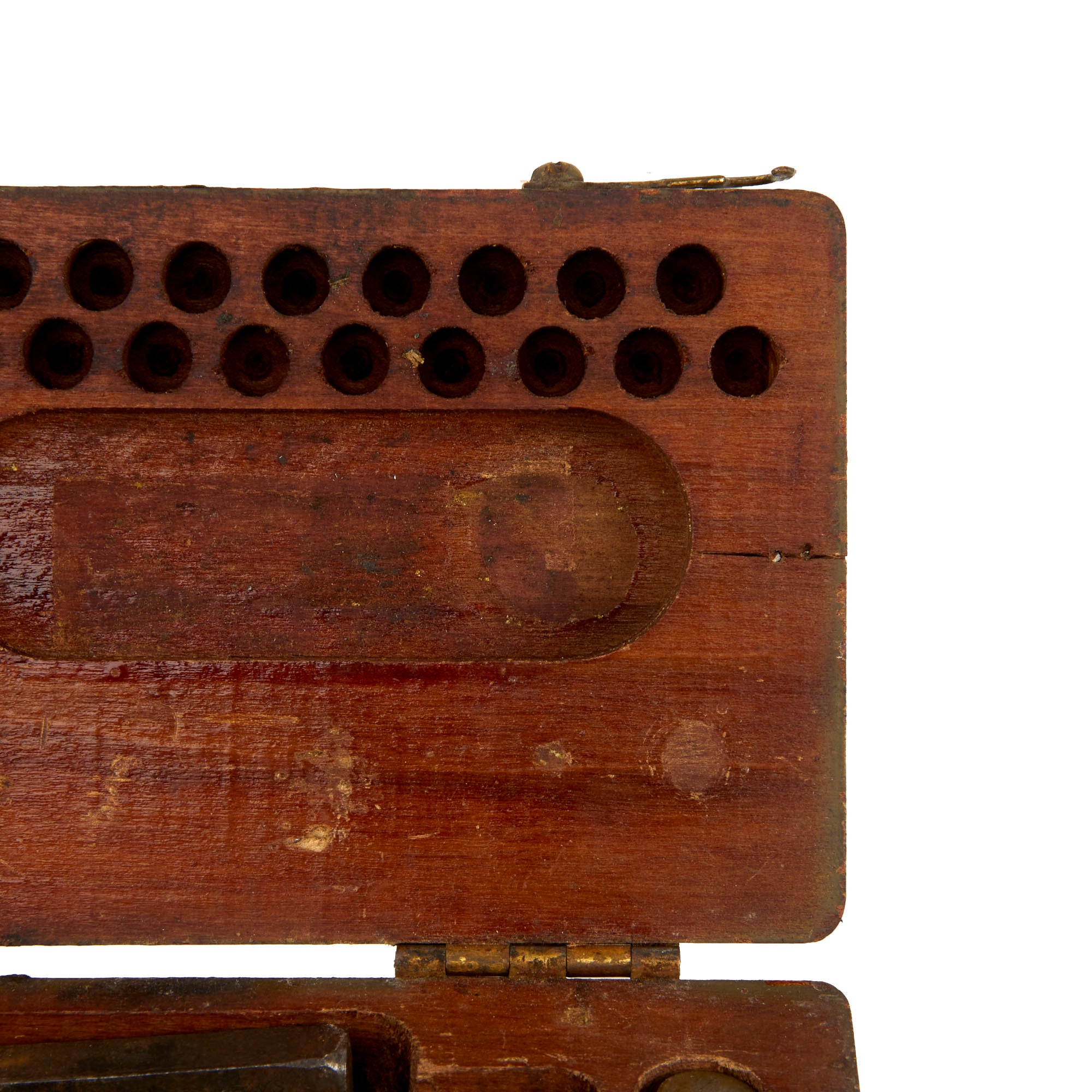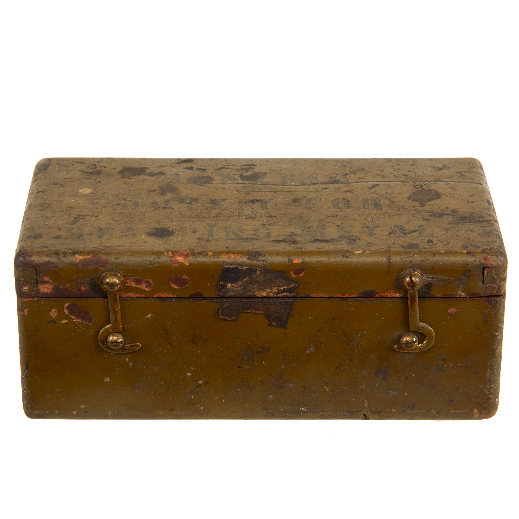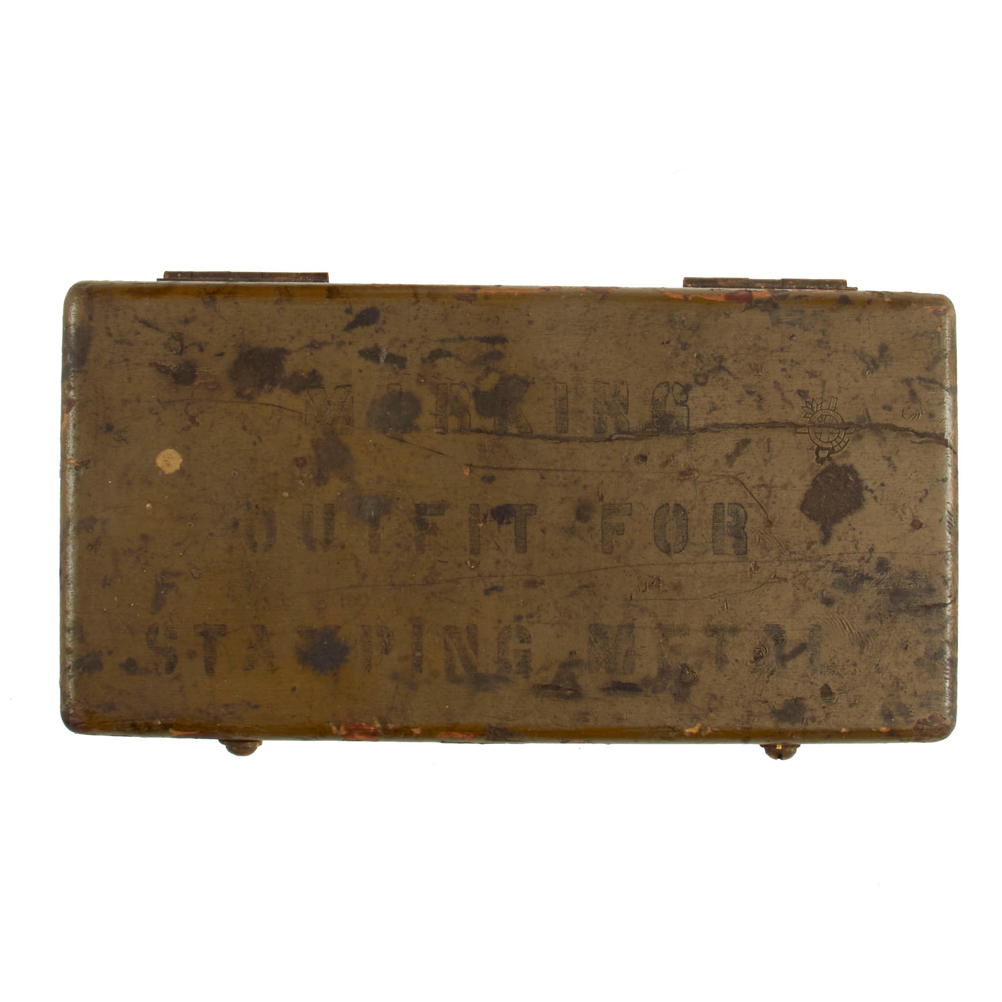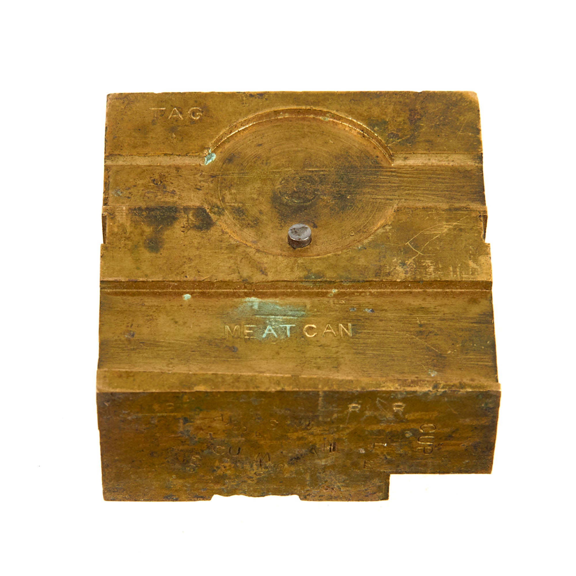 All WWI dog tags were hand-stamped. Dog tag stamping kits like this one were issued to a company’s supply sergeant and kept under tight control. This kit was used to replace and repair lost or damaged dog tags. The kit comes complete with a brass anvil, hammer, and tin plates. The individual letter stamps are all present with nearly all still able to be used, however there are a few that are too smooth to make a legible impression.