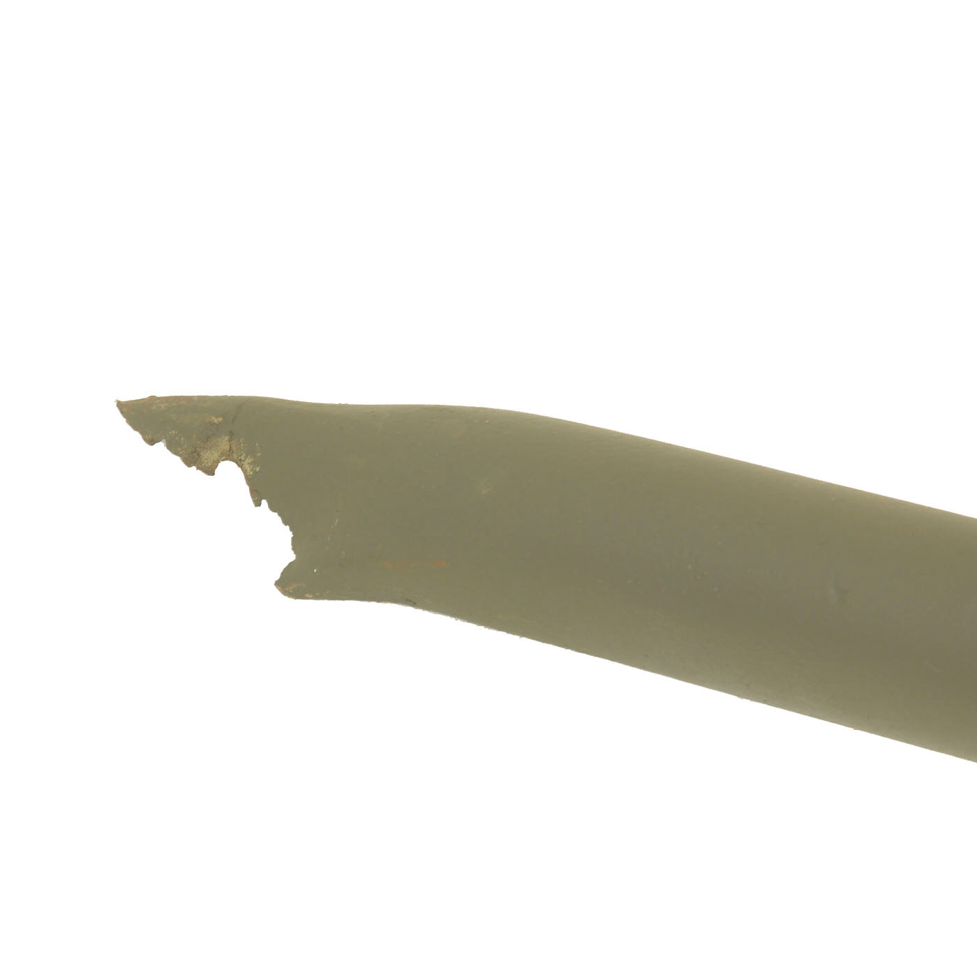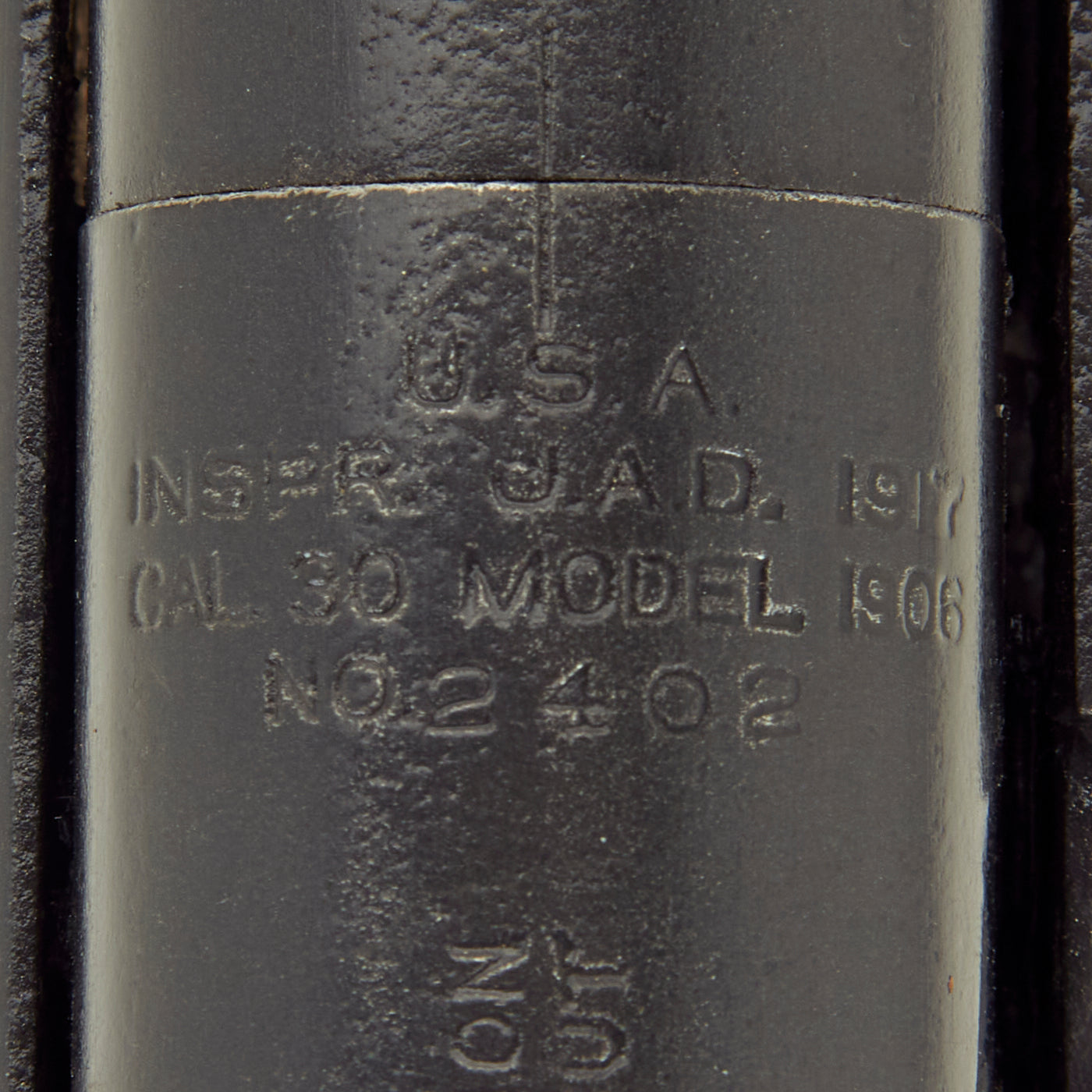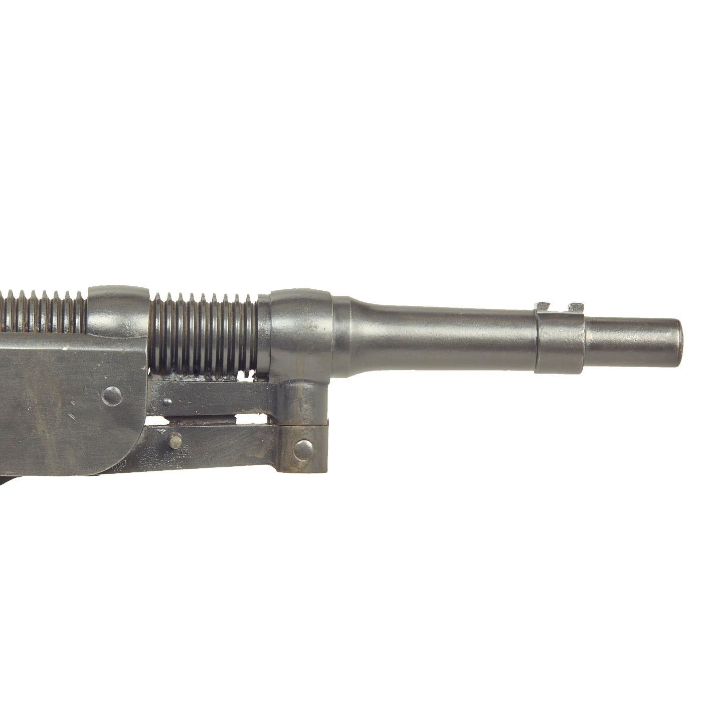This totally inert BATF non-firing display example is built on an original re-welded receiver, with a 20% section replaced by solid steel bar stock. It was then re-painted with our "gunmetal gray" paint to give it a nice finish. The gun has serial number 2402 on the receiver and barrel. It was manufactured in 30-06 Cal. with a 28″ barrel. It is marked on top of receiver as well as on matching barrel with the maker name and address:
