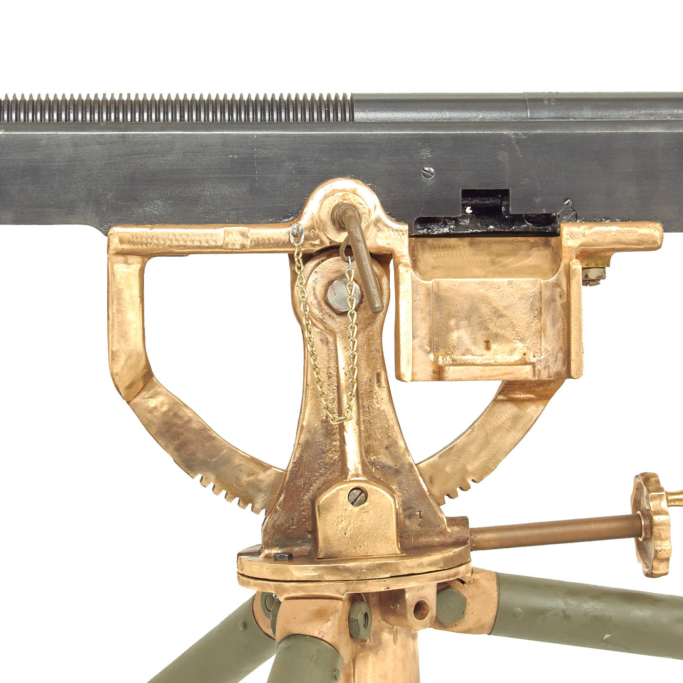 This Marlin potato digger comes on an original brass tripod with steel legs, which is in very good condition, though the rear foot is missing, something we often see. Unlike the two front legs, it is not tipped with brass, and would rust out when displayed for a long time. It was also converted to a static display, so the traverse and elevation mechanisms have been immobilized.