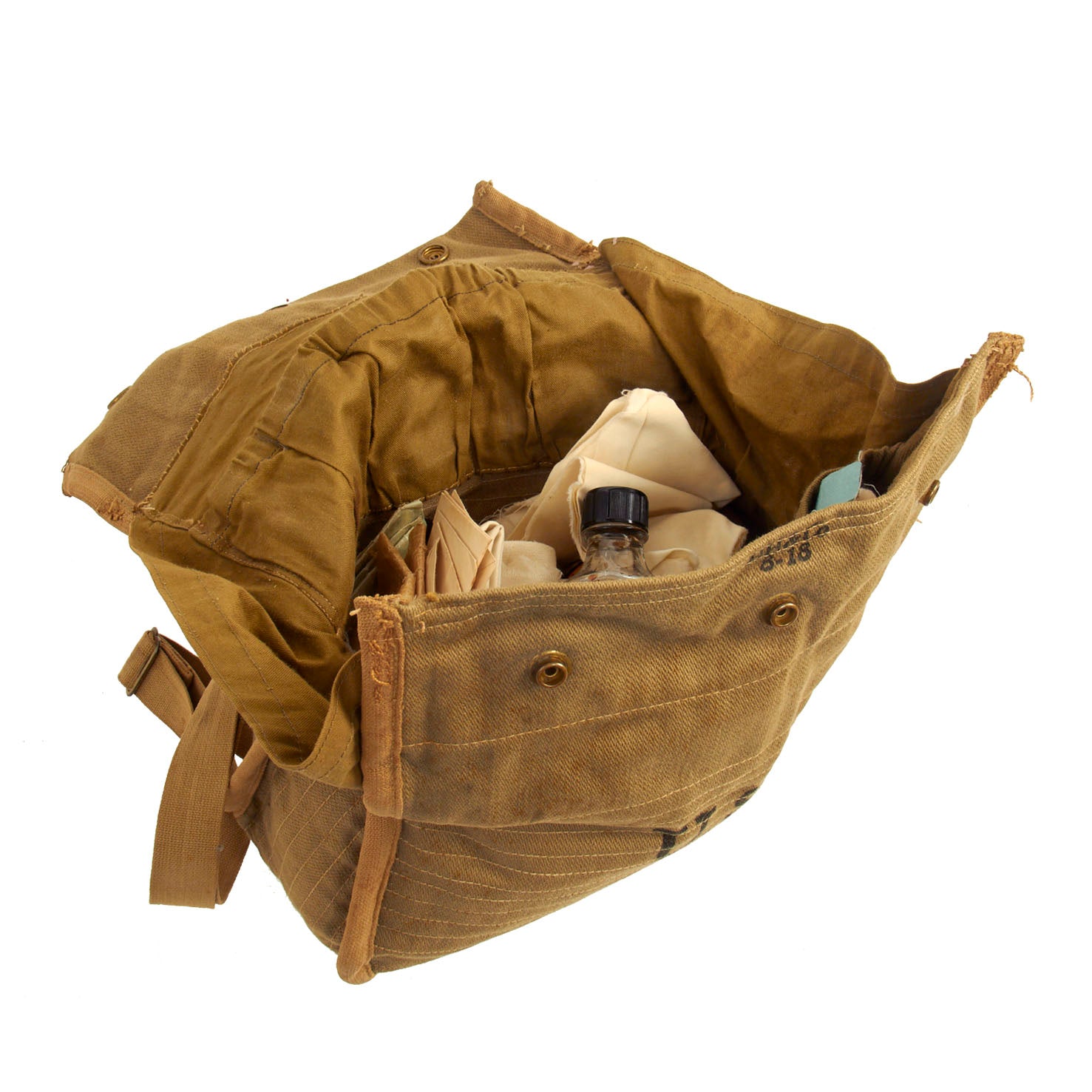 Original Item: One of a Kind. WWI Medic’s Aid Bag Loaded with original period medical supplies. Absolutely perfect for a Great War medical display! The bag itself is a U.S. Issue Grenade Bag which was modified by a soldier to fit his needs as a medical satchel. During WWI Medics and Corpsmen were issued rather cumbersome belts to carry their supplies. The only bag that was issued in relatively small numbers was the Model 1904, which was nearly useless for carrying any amount of supplies. It makes sense that a WWI US medic would devise something like this.