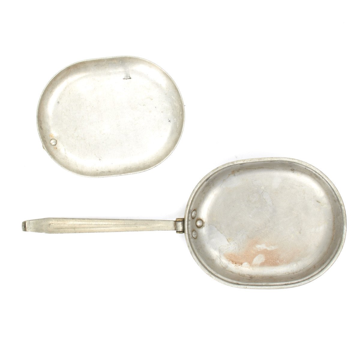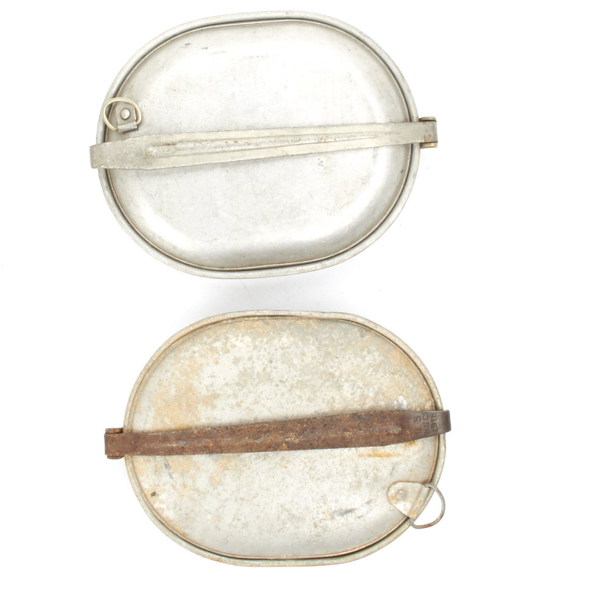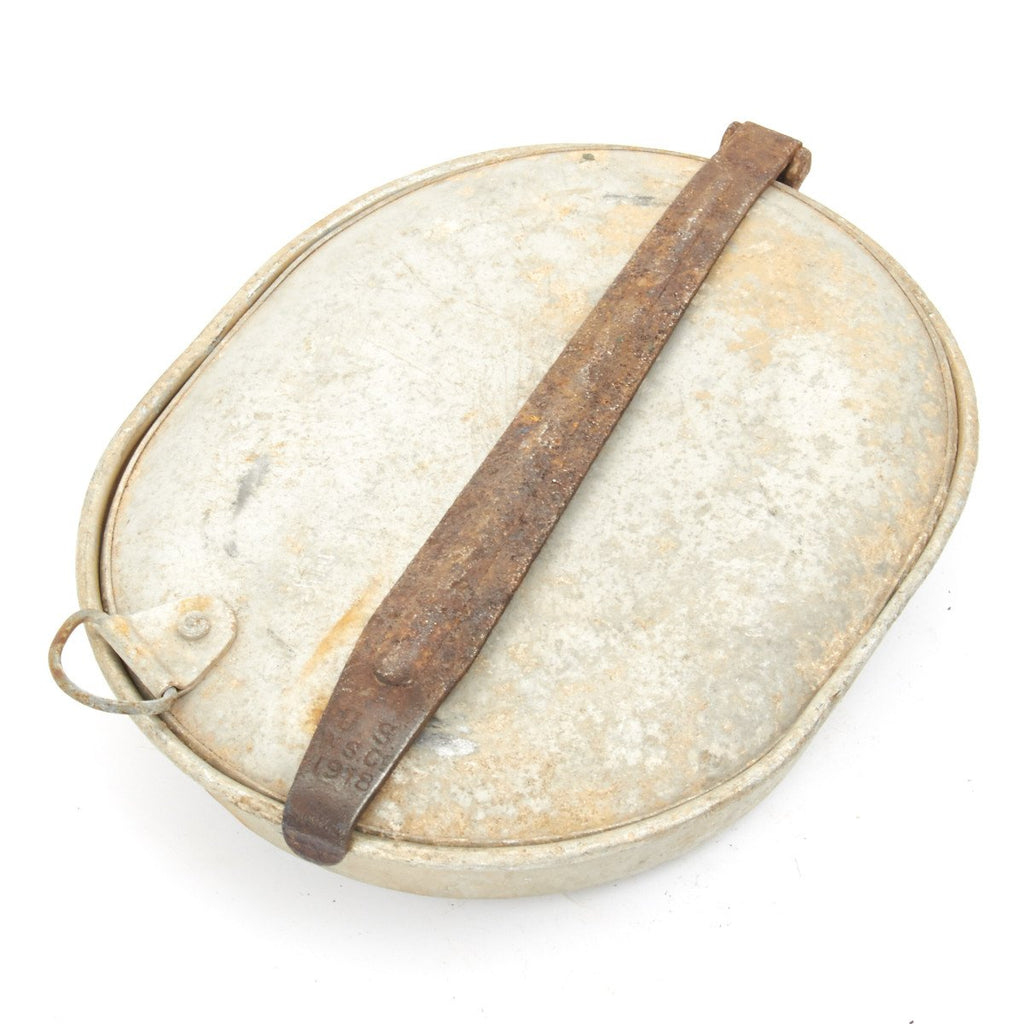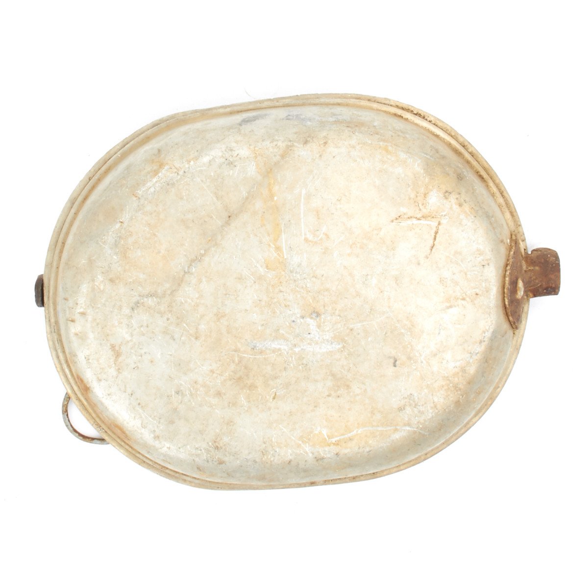 Each is comprised of an upper and lower section- an oval lid held to the lower pan by a riveted steel handle that folds over to lock the lid in place. Quite different from the US WW2 issue, these mess tins have become quite scarce on today's market. Every set is fully marked and almost 100 years old!