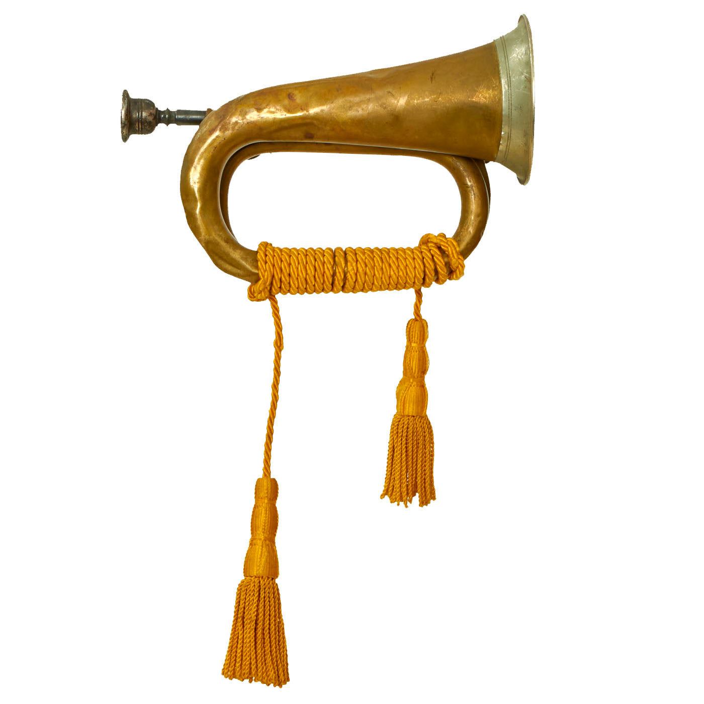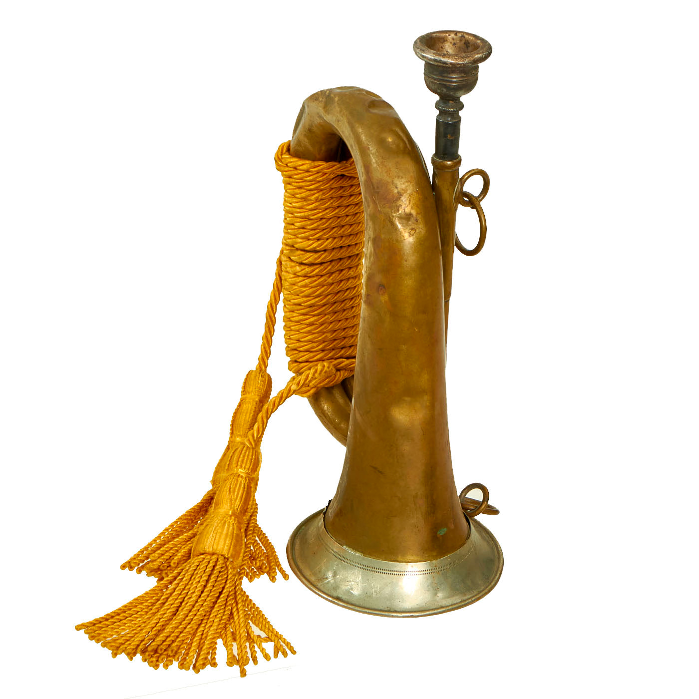 Original Item: Only One Available. This is a very nice U.S. WWI Military Bugle, complete with a yellow cavalry tassel, most likely added later. It does have a mouthpiece, but it looks to actually be an early trombone mouthpiece by the famous H.N. White company, which would go on to become King Musical Instruments, still in existence today.