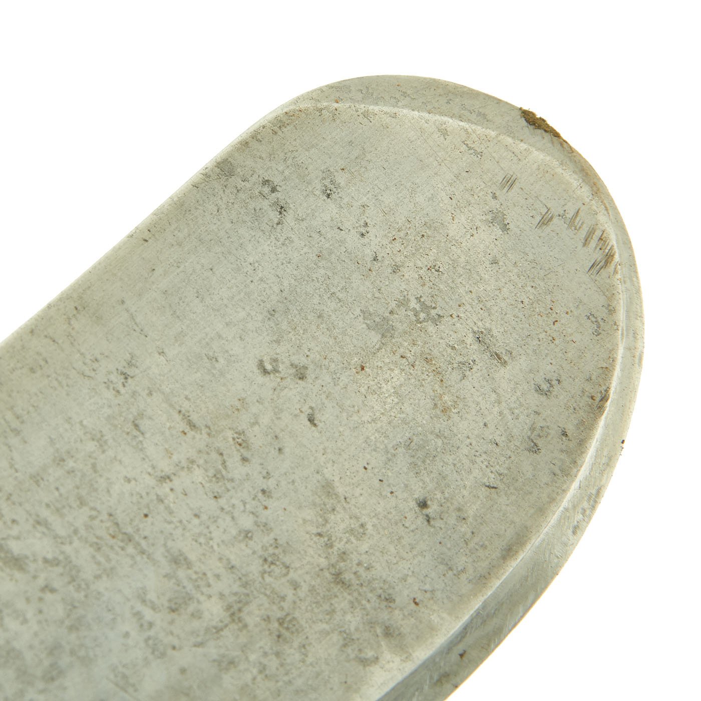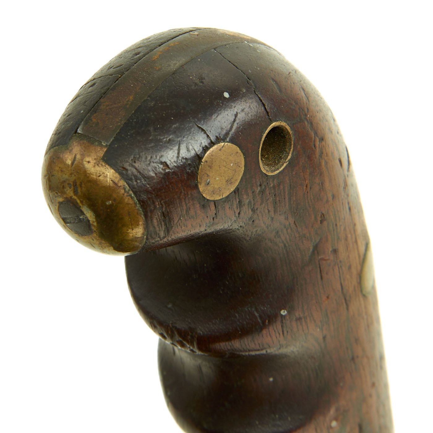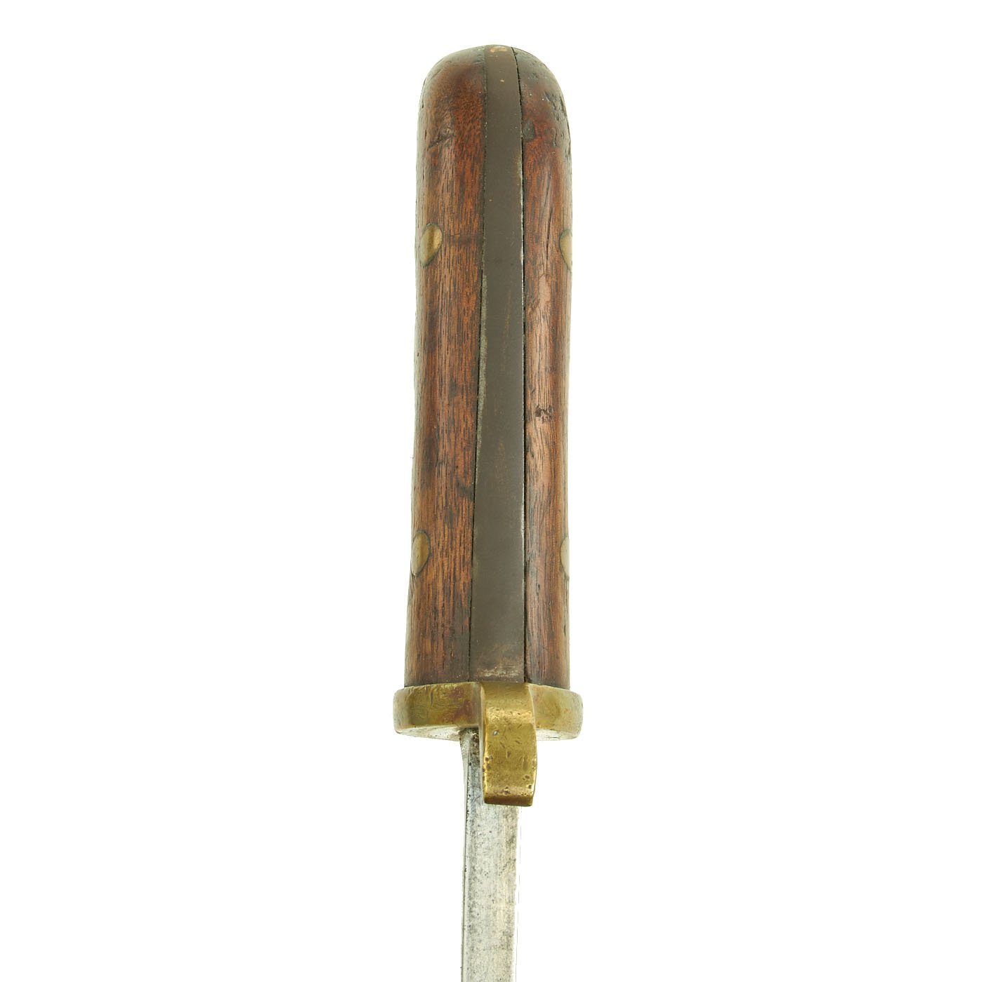 This example looks to have seen serious use in the field, as it has been sharpened several times at least, which has somewhat altered the profile of the blade. It was sharpened correctly, only from one edge, and has only light staining, so it was well cared for. The wooden handle has a beautiful color, and is free from any major defects, with the brass rivets and end cap still secure.