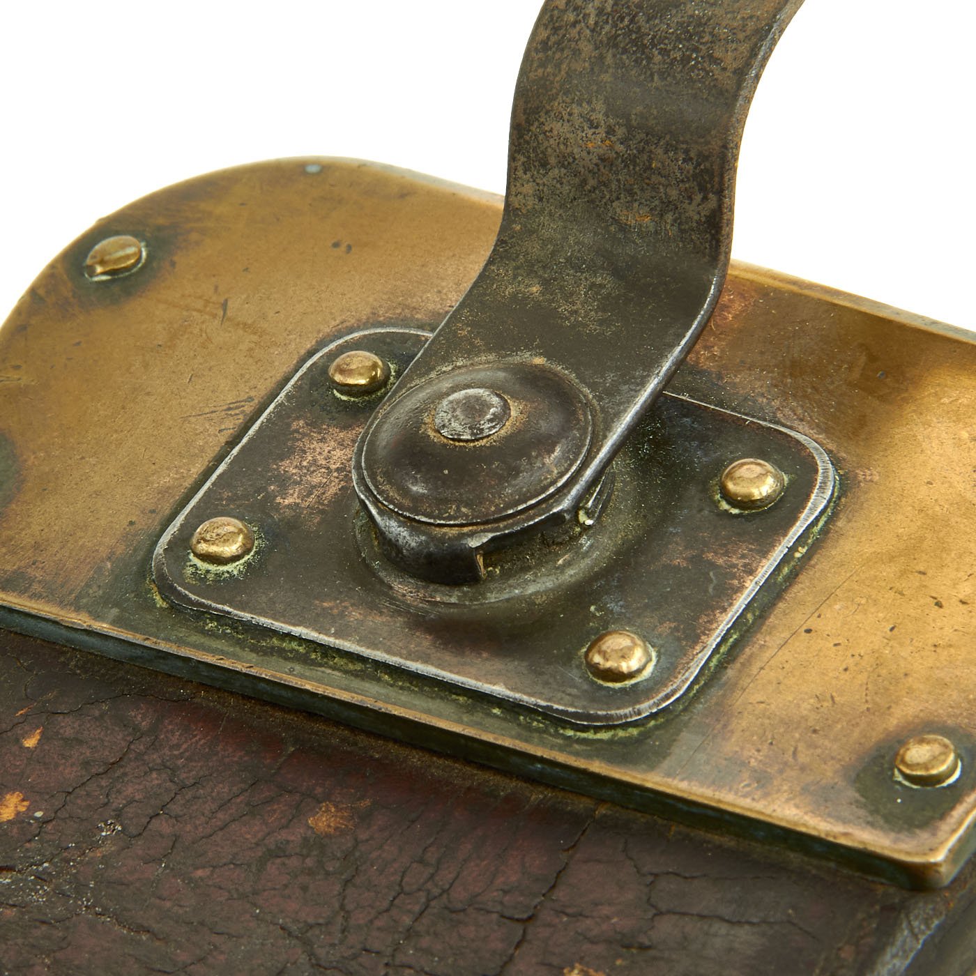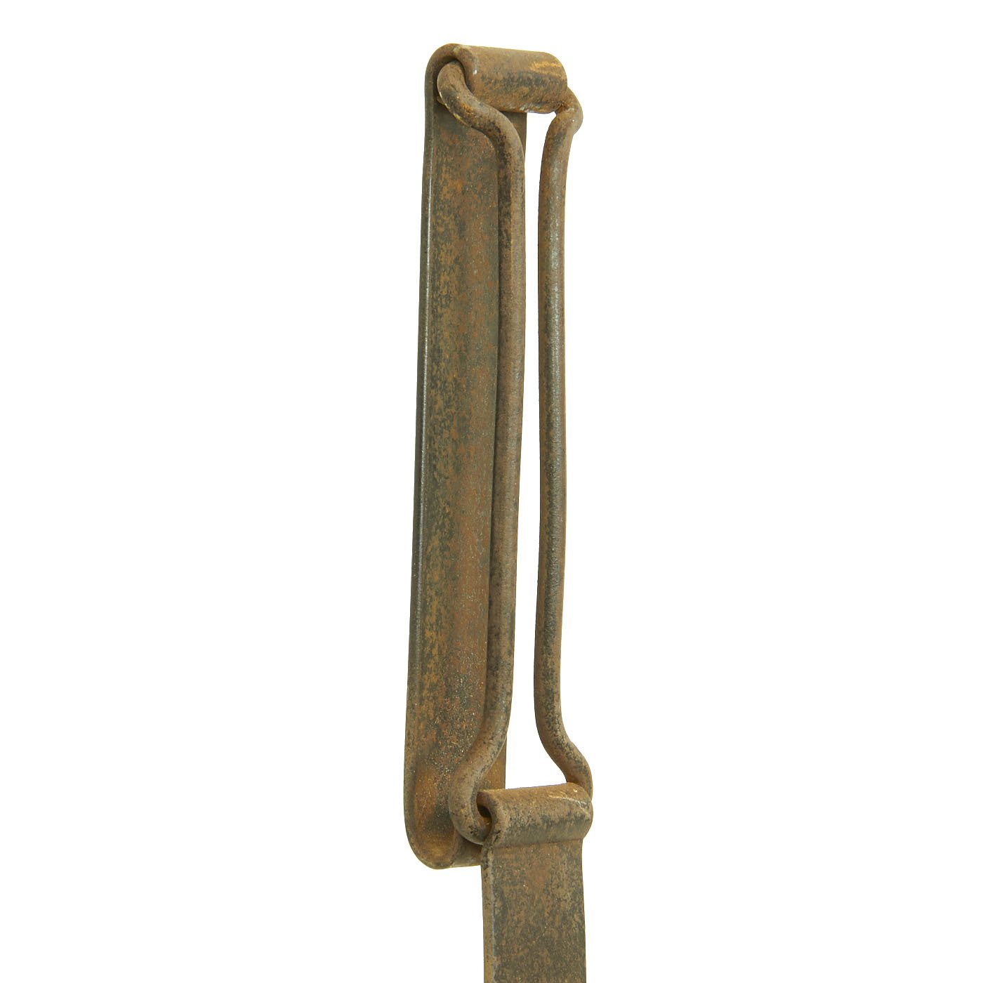 The original scabbard is also in good condition, and is probably rarer than the Bolo Knife itself. This example unfortunately has leather surface deterioration on the back, so the original markings cannot be read. This is a later version of the scabbard, as earlier ones had a leather belt loop. This has the Springfield/Krag style metal belt loop clip with swivel, attached to a sturdy aluminum throat. The stitching is almost entirely intact, and the leather is still mostly soft, with some finish cracking and wear on th ereverse.