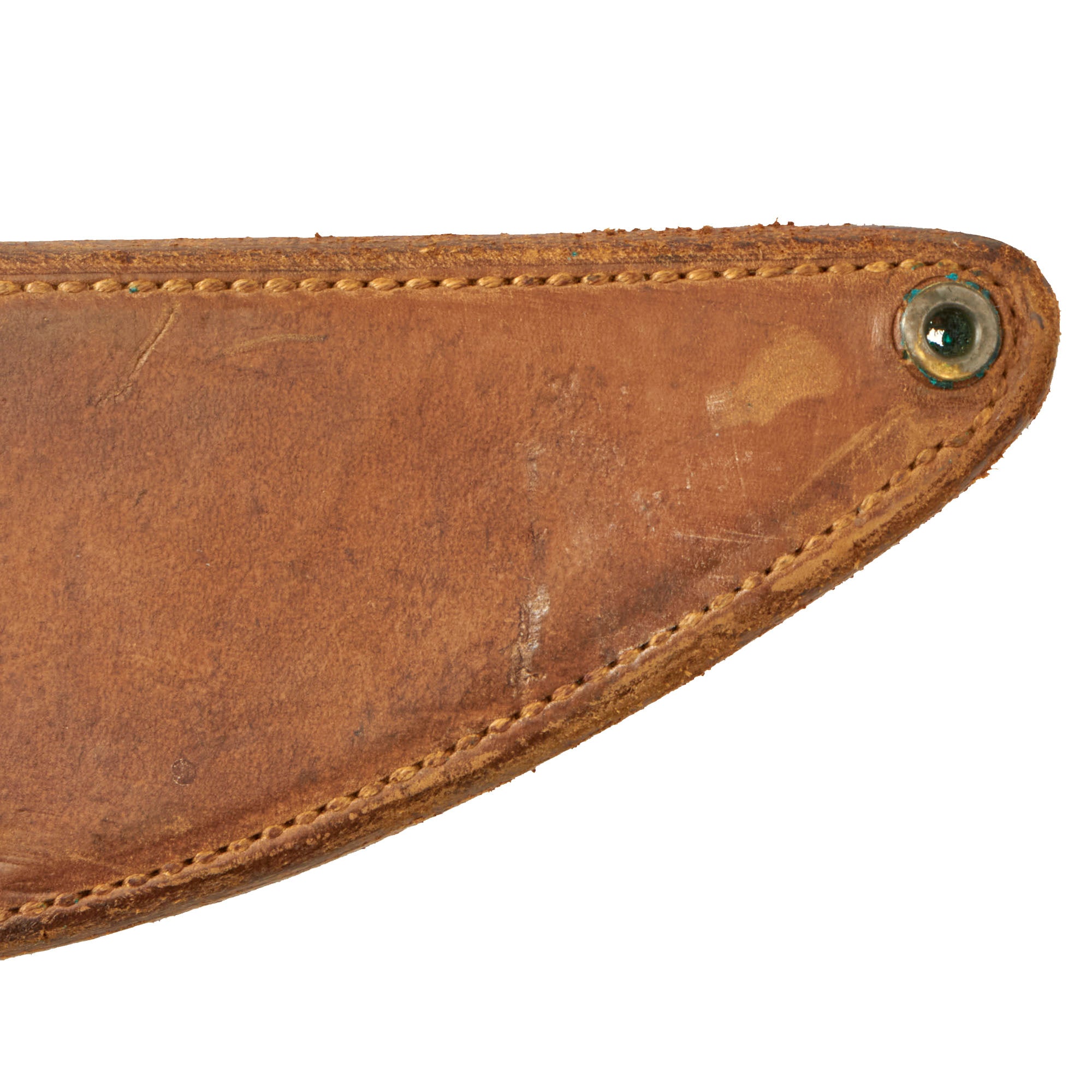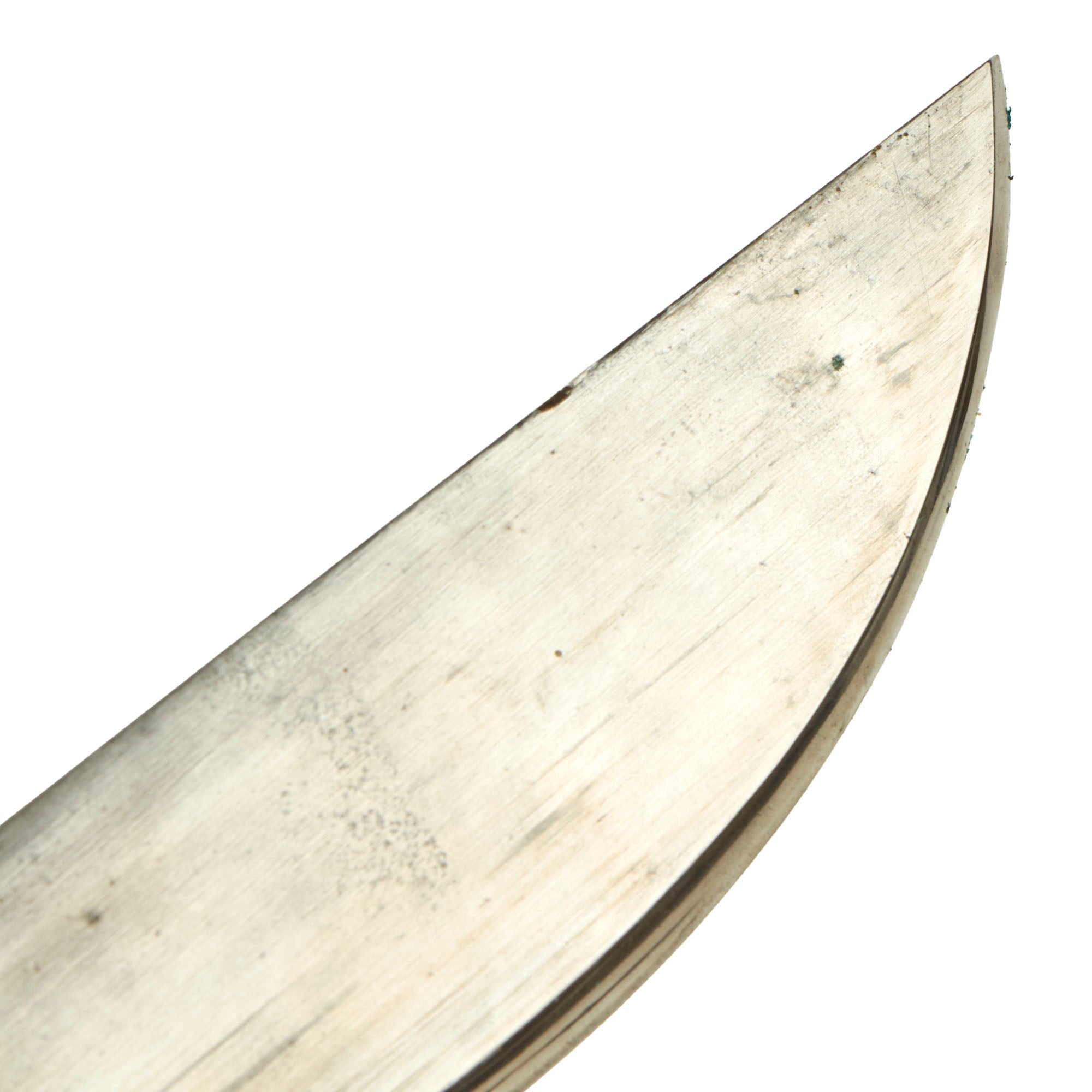 The M-1909 features a 13 1/2" heavy straight back blade, with a curved cutting edge with a big belly near the tip. The heavy ended blade made these very effective for clearing brush and jungle debris, as well as making them excellent hand weapons in close combat. The edge is single beveled, which helps with strength and ease of sharpening.