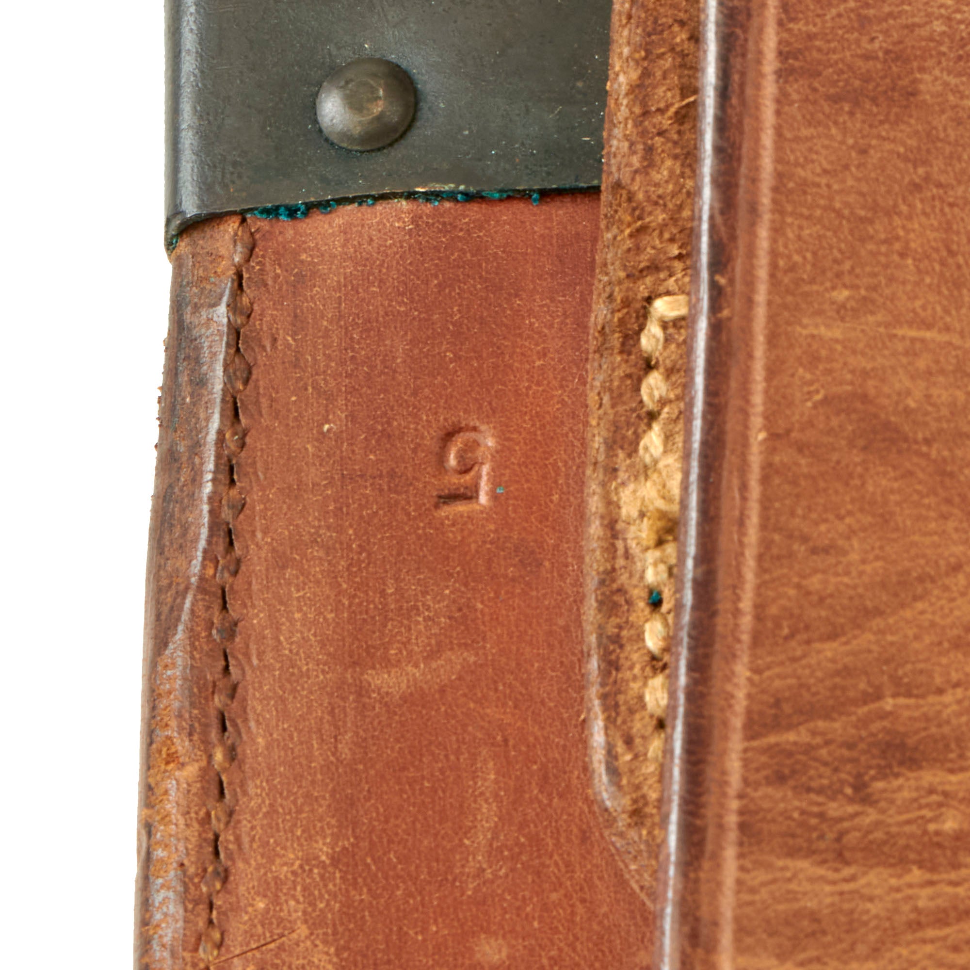This example is absolutely fantastic, the best we have ever seen, with very little wear to the blade or scabbard. The wooden handle has a beautiful color, and is free from any major defects, with the brass rivets still secure. The blade is marked near the cross guard with PLUMB / PHILA / FLAMING BOMB / 1917 on one side, and U.S. / 55790 on the reverse. This is the latest dated example we’ve seen.