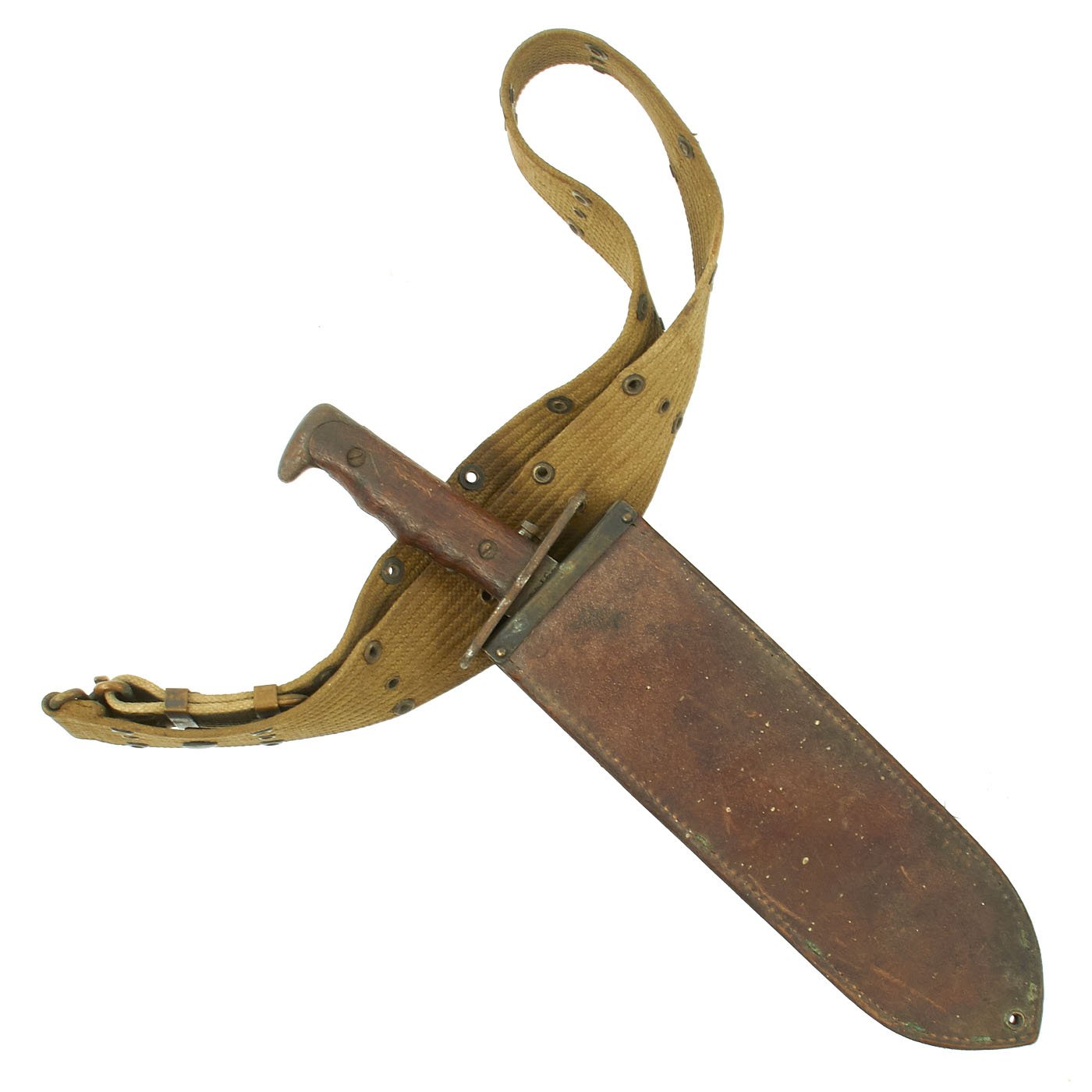 The M-1910 Bolo Knife was adopted to be used for clearing brush and foliage from fields of fire or for cutting through jungle growth. The M-1910 Bolo Knife was produced at the Springfield Armory between 1910 and 1917, and official armory records indicated just under 60,000 were produced. Many of these were refurbished for use in WW2 and parkerized, but this knife is still in the WW1 configuration.