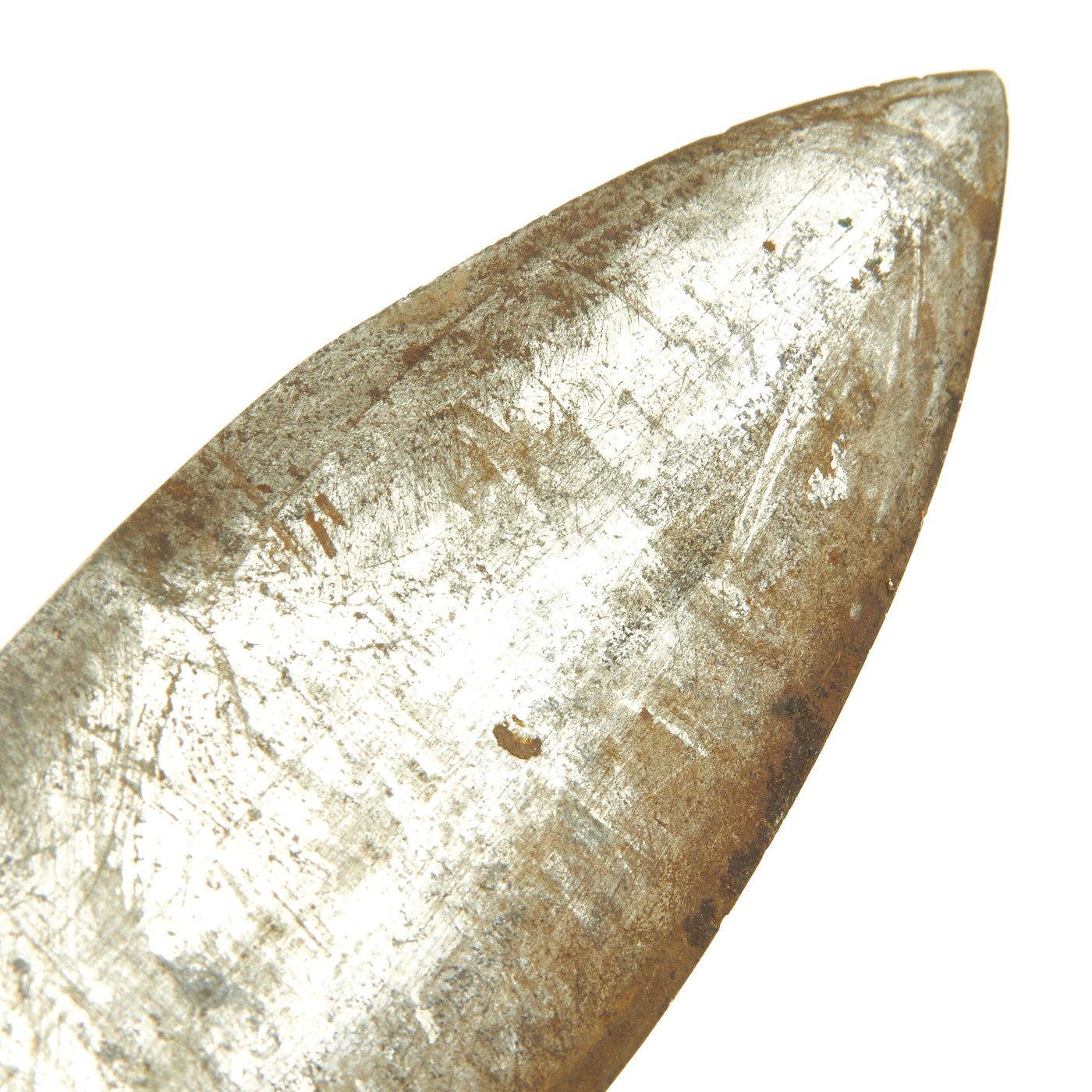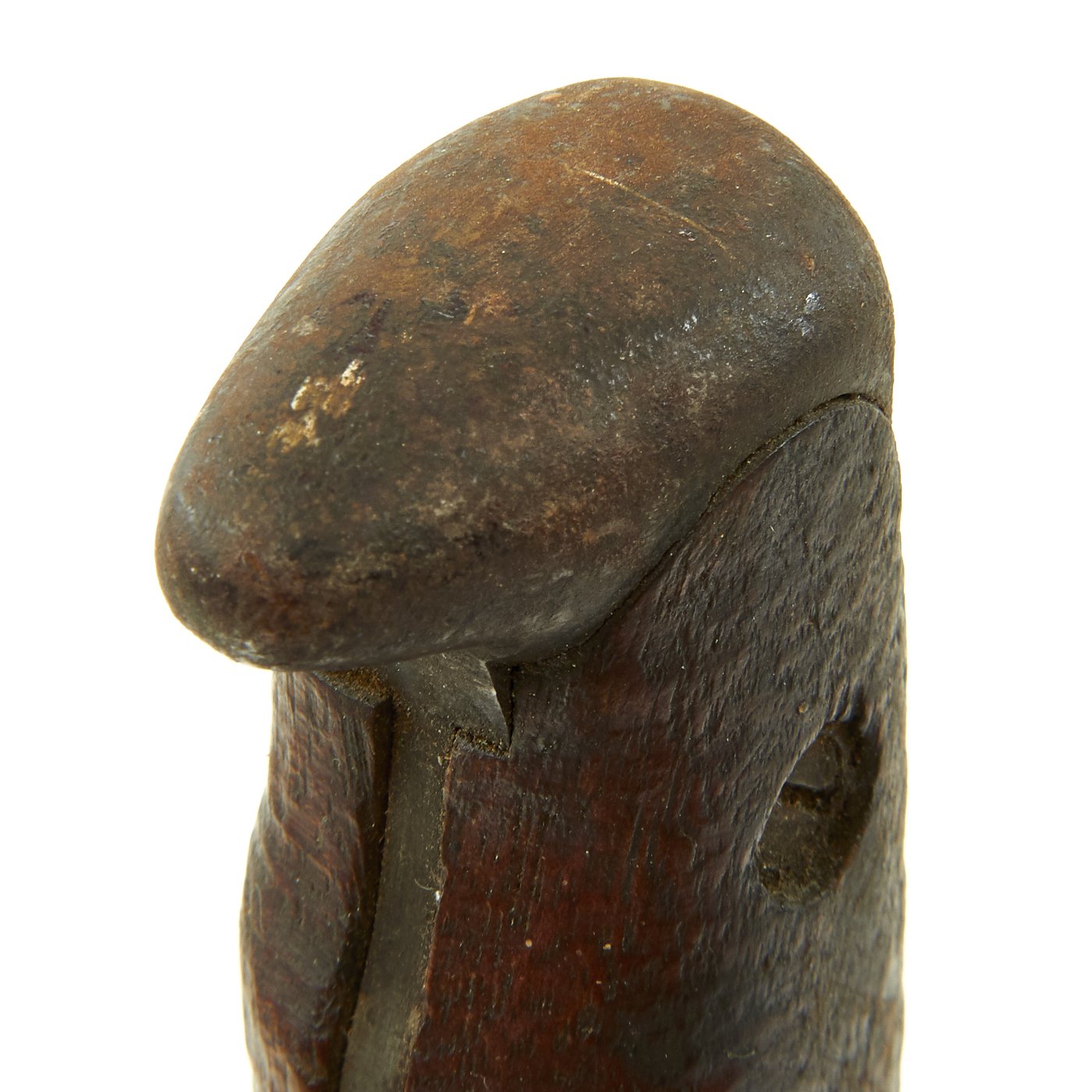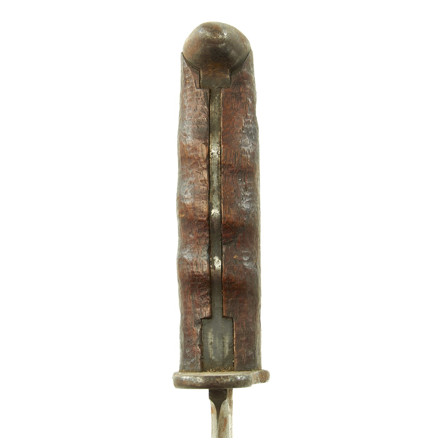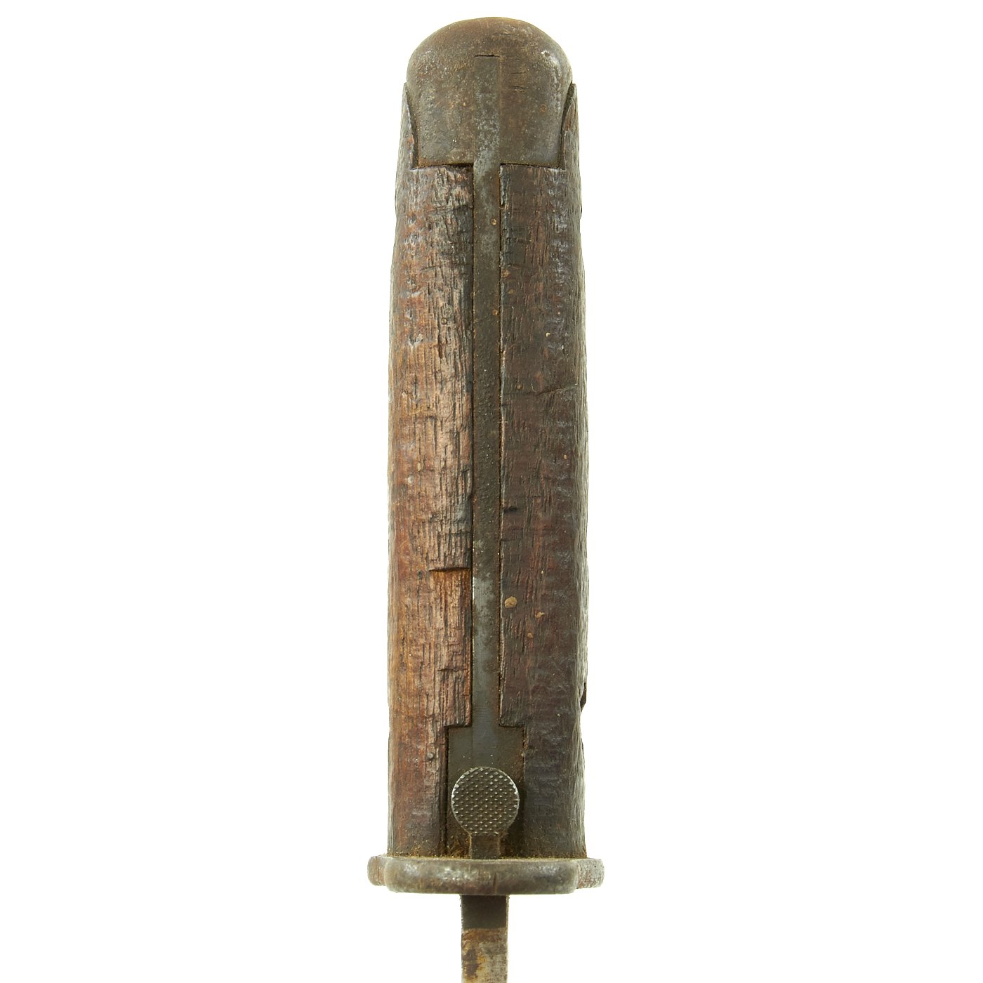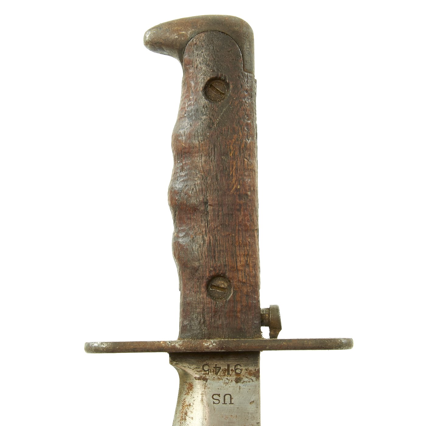 The grip and ricasso show some browning due to corrosion, but the original blued finish is still mostly complete. The blade does have some areas of rusting, most likely due to long term contact with the leather scabbard. As it is bright steel, it has no protection against corrosion, while bluing or parkerizing does provide a little. The knife definitely shows use, with sharpening and wear to the blade, with some scratches and nicks. The wood grips are totally original and mostly chip/crack free, with a great worn in look.