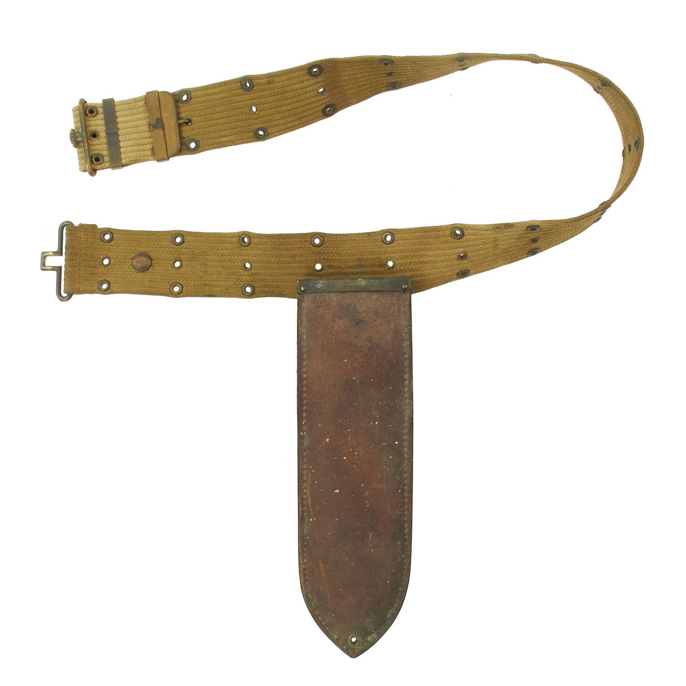 The M1936 Pistol belt is in good service worn condition. It is fully functional and intact, with the expected wear and dirt on the brass fittings. It definitely completes the look of a well-used set.