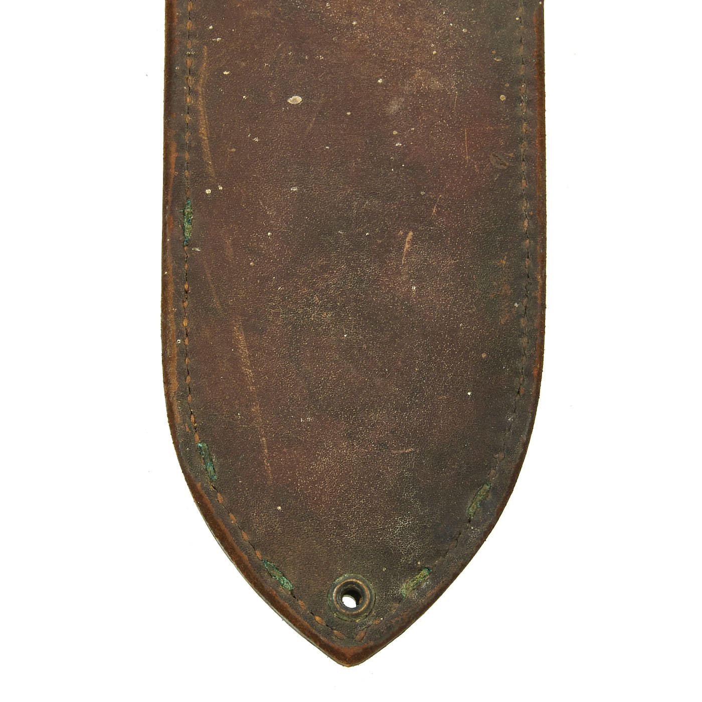 The Medical Corpsman scabbard is the standard heavy leather construction with a brass throat. The back is marked on the belt hanger with U S / BOYT / 42, indicating 1942 manufacture by Boyt Harness Co of Des Moines Iowa, a major leather goods supplier during WWII. They made various slings, holsters, scabbards, and other items for the war. Interestingly, most of these corpsman scabbards are marked USMC, but this one is not.