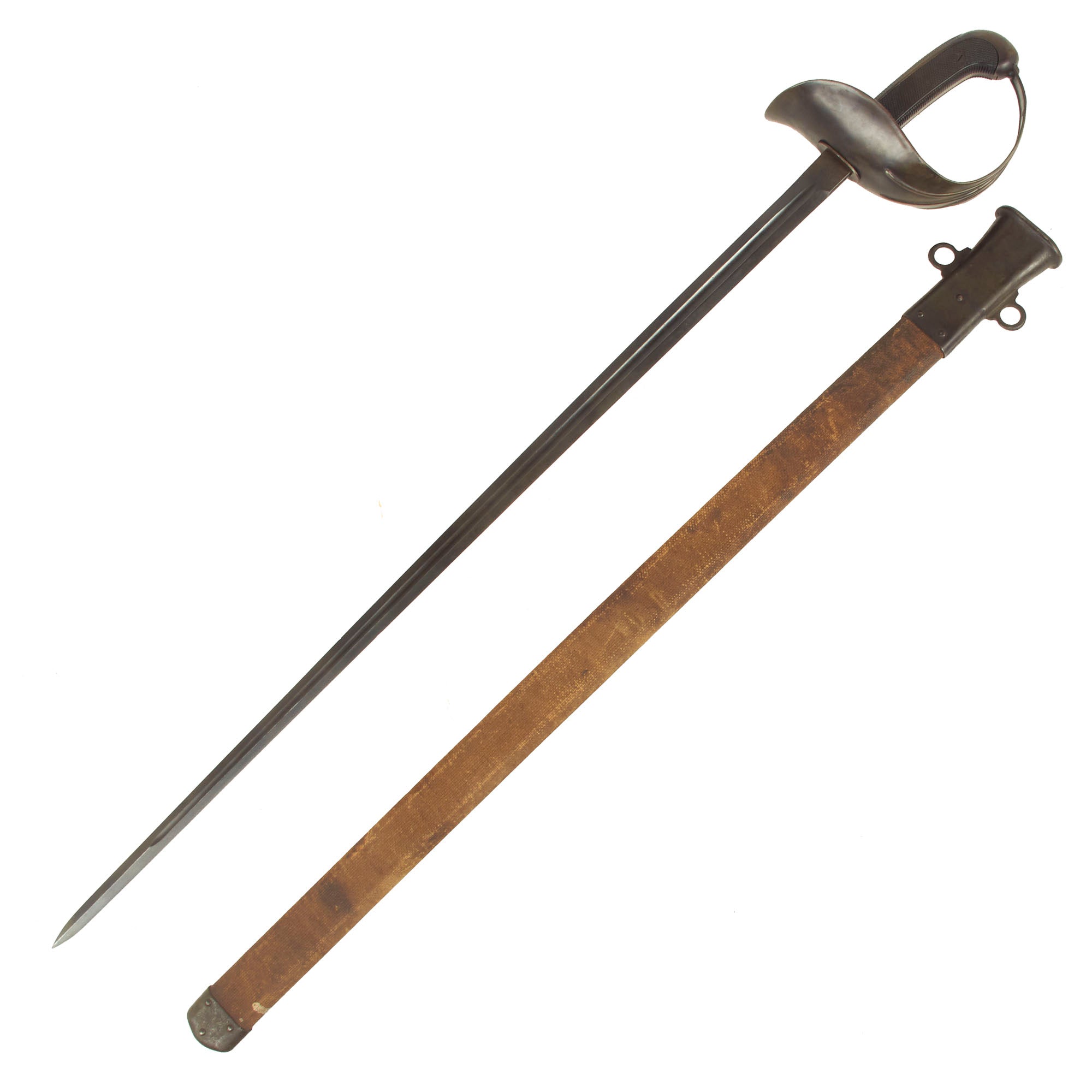 Blade condition is very good, with a wonderful patina, and only a few nicks on the edge though it does appear to have been cleaned and blued. Minor pitting but no other major corrosion, just the usual light staining from age. Canvas on the scabbard is intact with staining from age. The heavy steel guard is in great shape, as is the grip, which shows only light dents and a few paint marks.