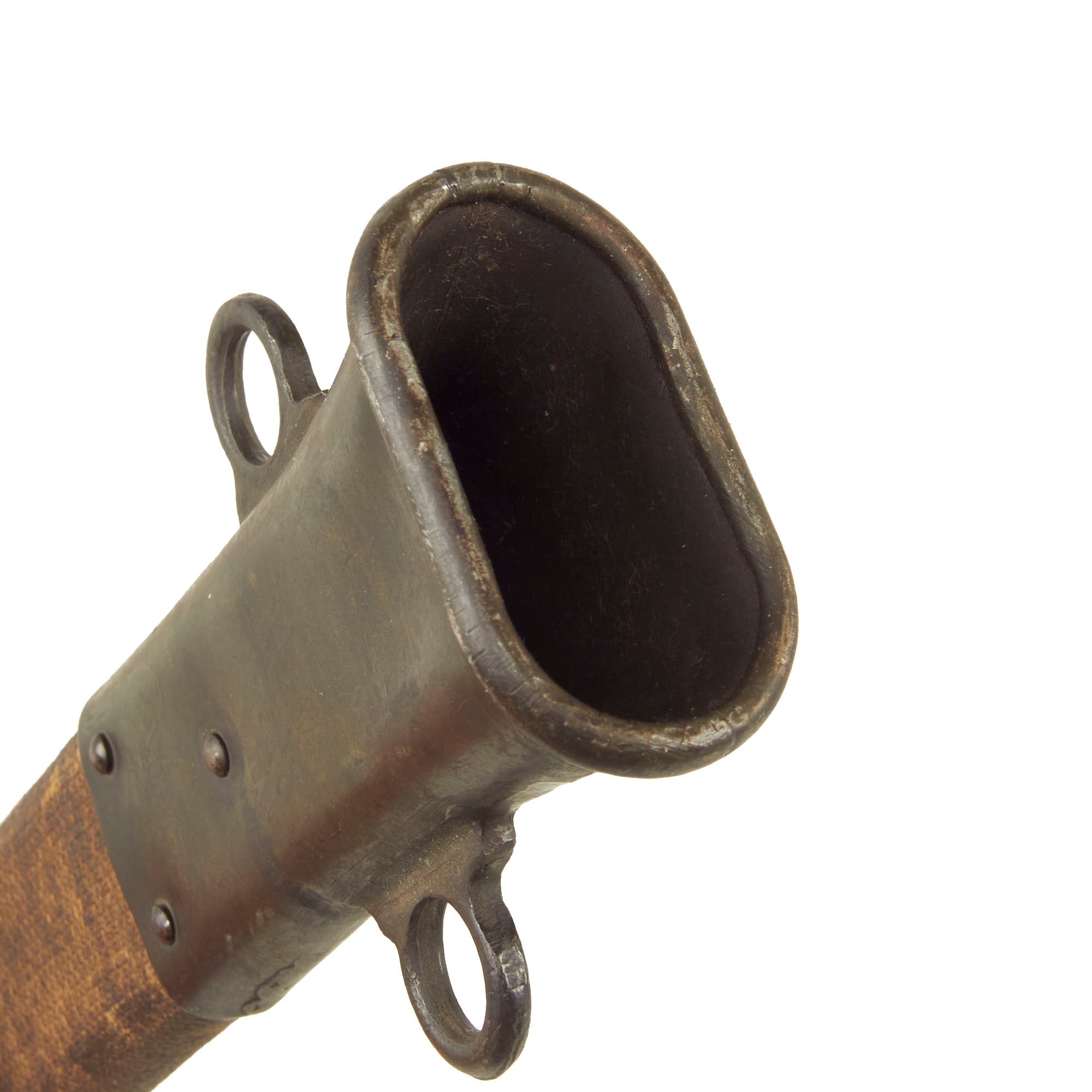 The scabbard has a wooden body covered in khaki canvas with a large wide steel throat and a plain drag both of which are darkened like the grip. Canvas covering is in excellent condition. One area is about 6.00 inches up from the drag and meas. approx. 2.00 inches long. The other is on the opposite side about 9.00 inches below the throat and measures. approx. 3.00 inches.