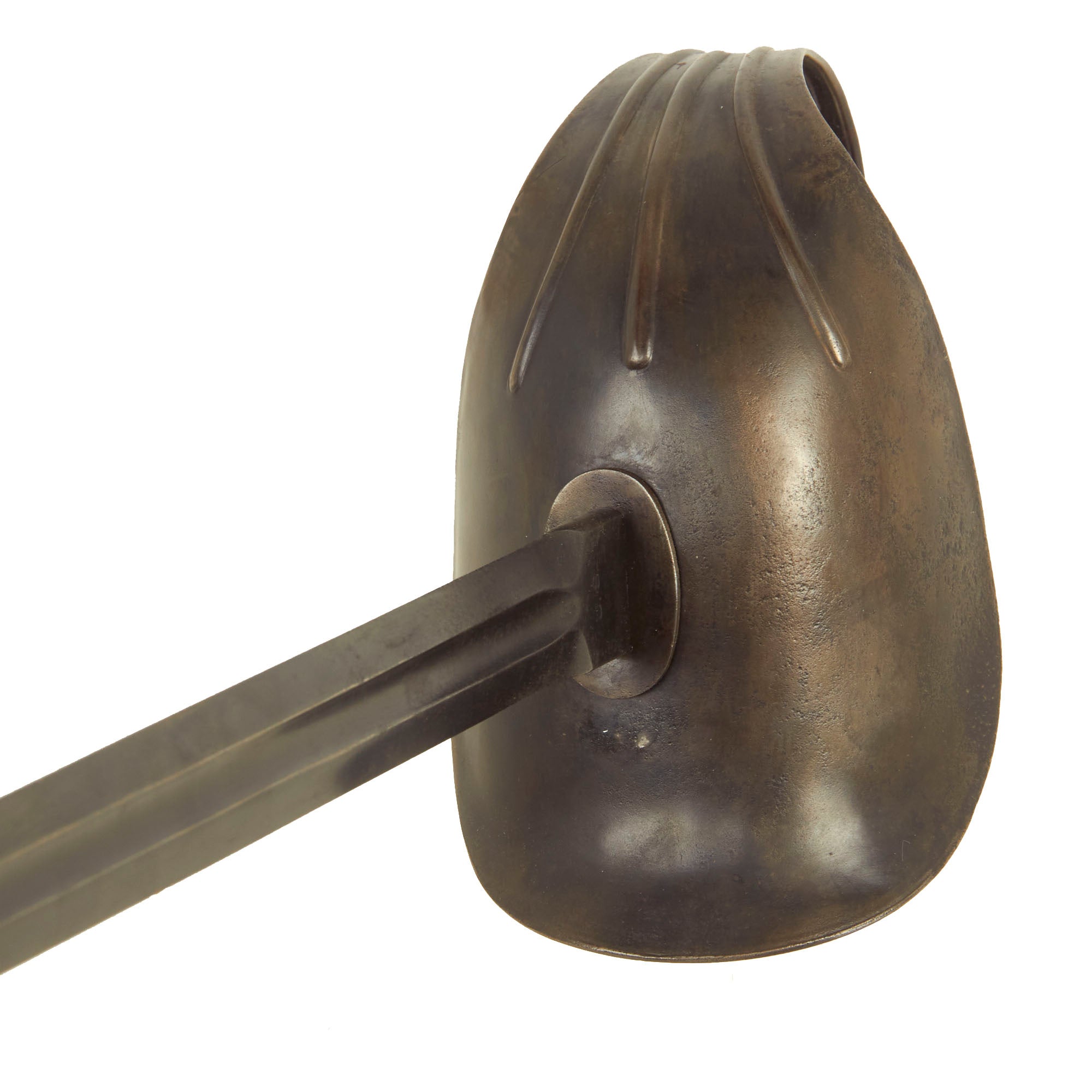 This sword features a 35 inch long blade that tapers toward the point with a deep central fuller running from the ricasso to within approx. 5.00 inches of the point. The blade is double-edged and in good condition with some mottling to be seen. Edges are free of nicks.