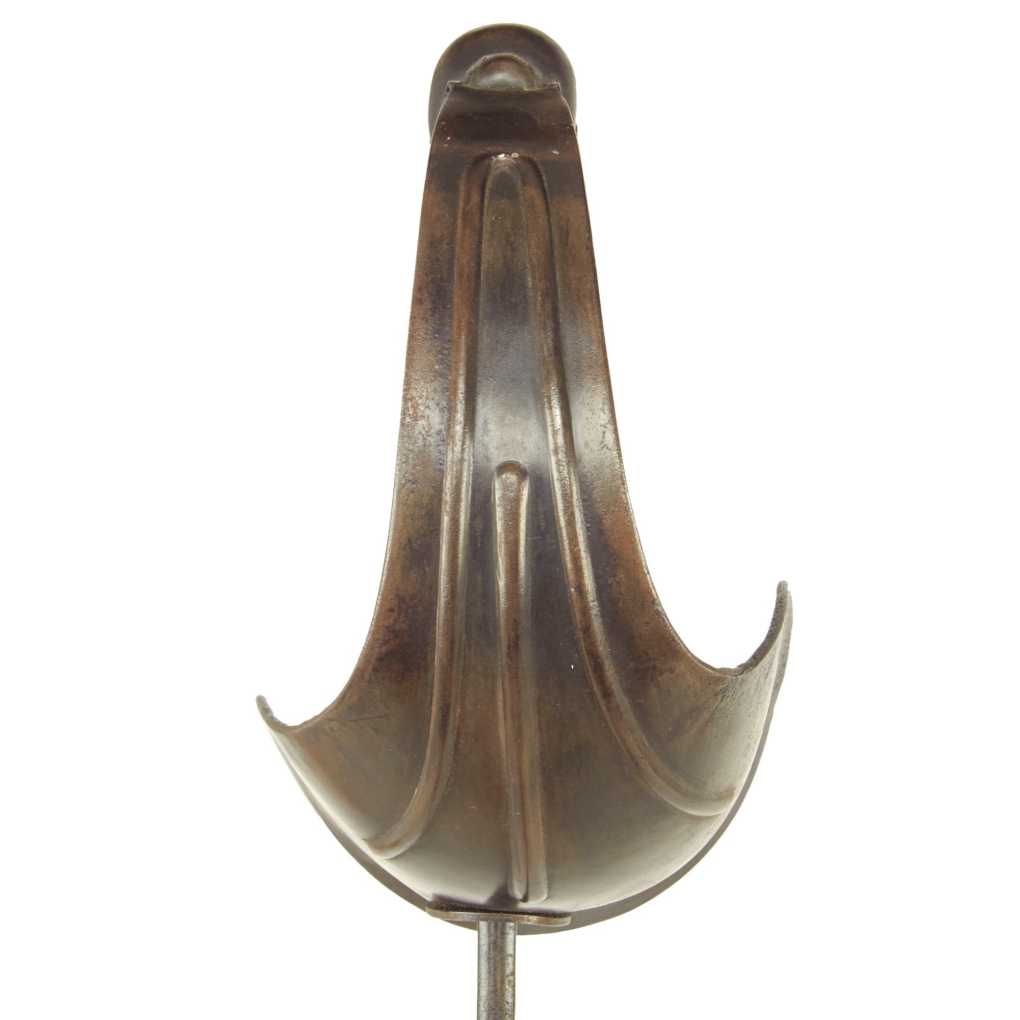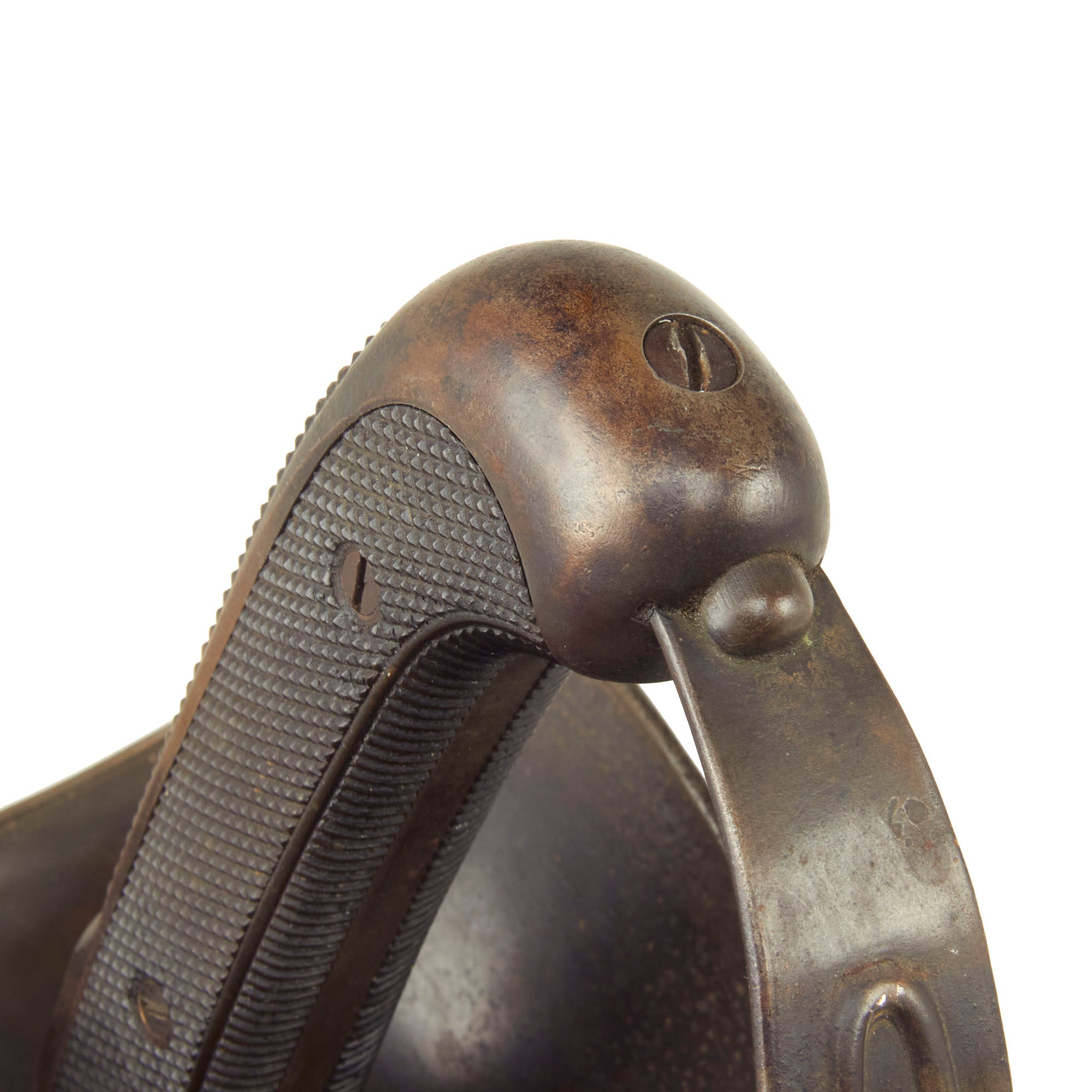 The grip is made of steel with a crosshatched surface for better grip. The top of the grip just behind the guard has a recessed area for resting the thumb. The pommel is smooth and convex. There is a screw through the pommel cap and two lateral screws holding the grip together. The guard is made of a single heavy sheet of steel molded into a full basket with three ridges in the area of the knucklebow. Both the grip and the guard are blackened. All is in excellent condition.