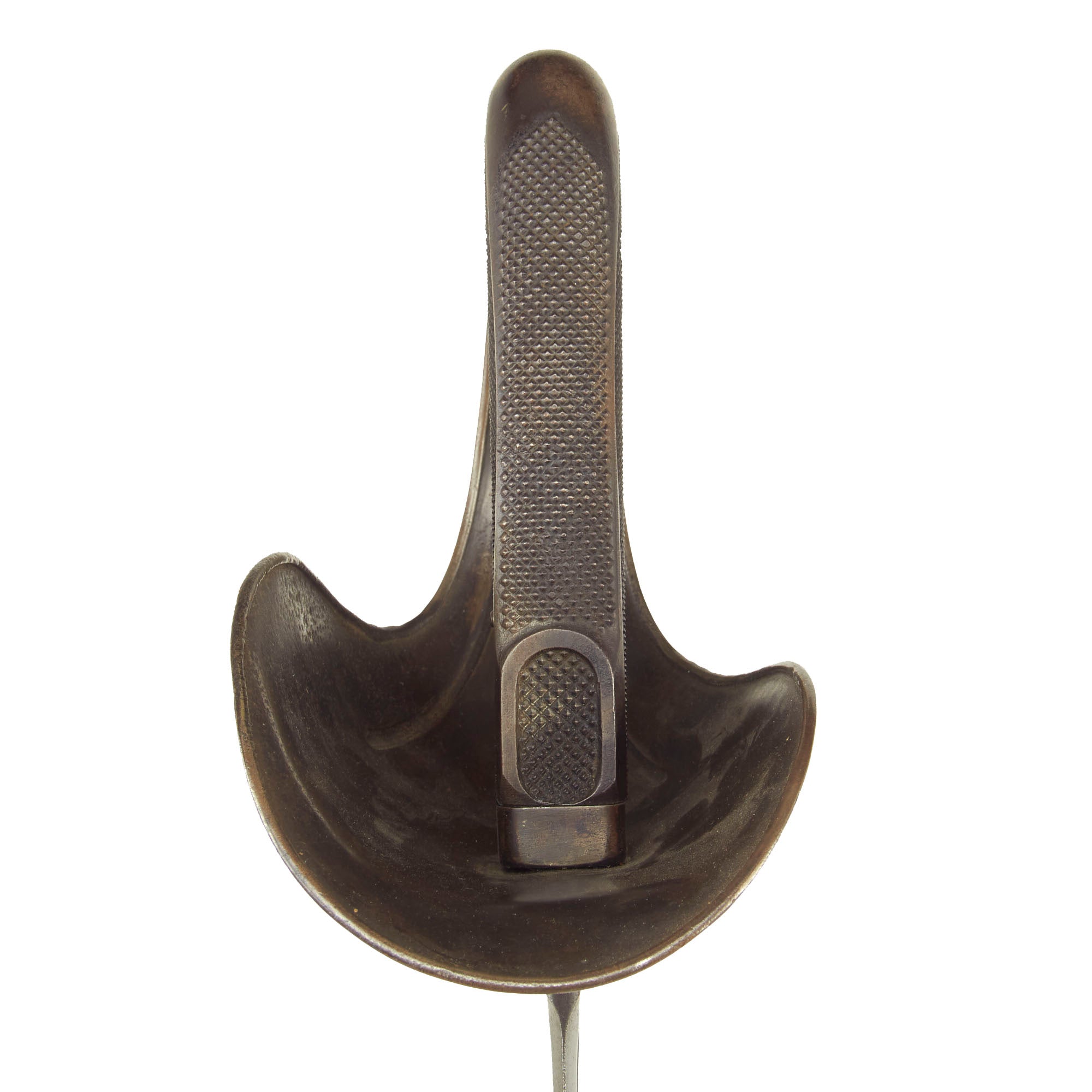 - It has a blued steel (some were nickel plated) "cup-hilt" and a black composition grip.