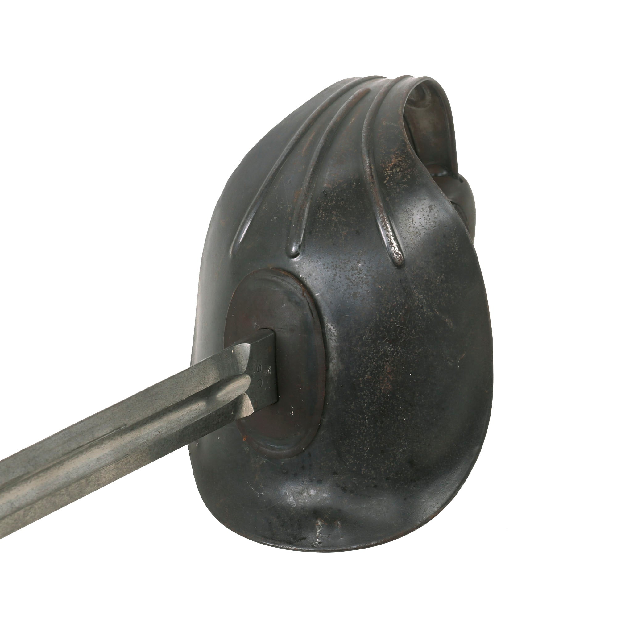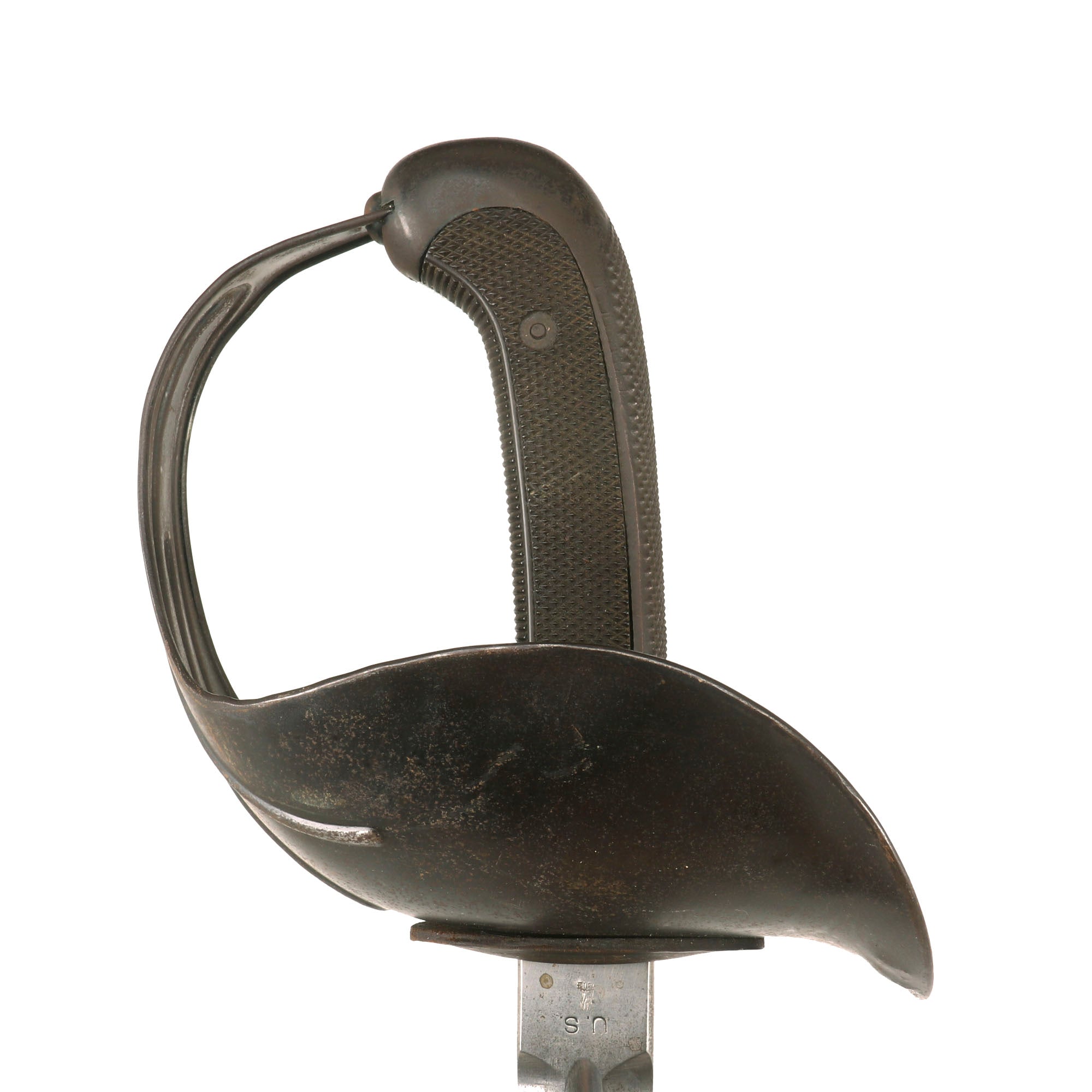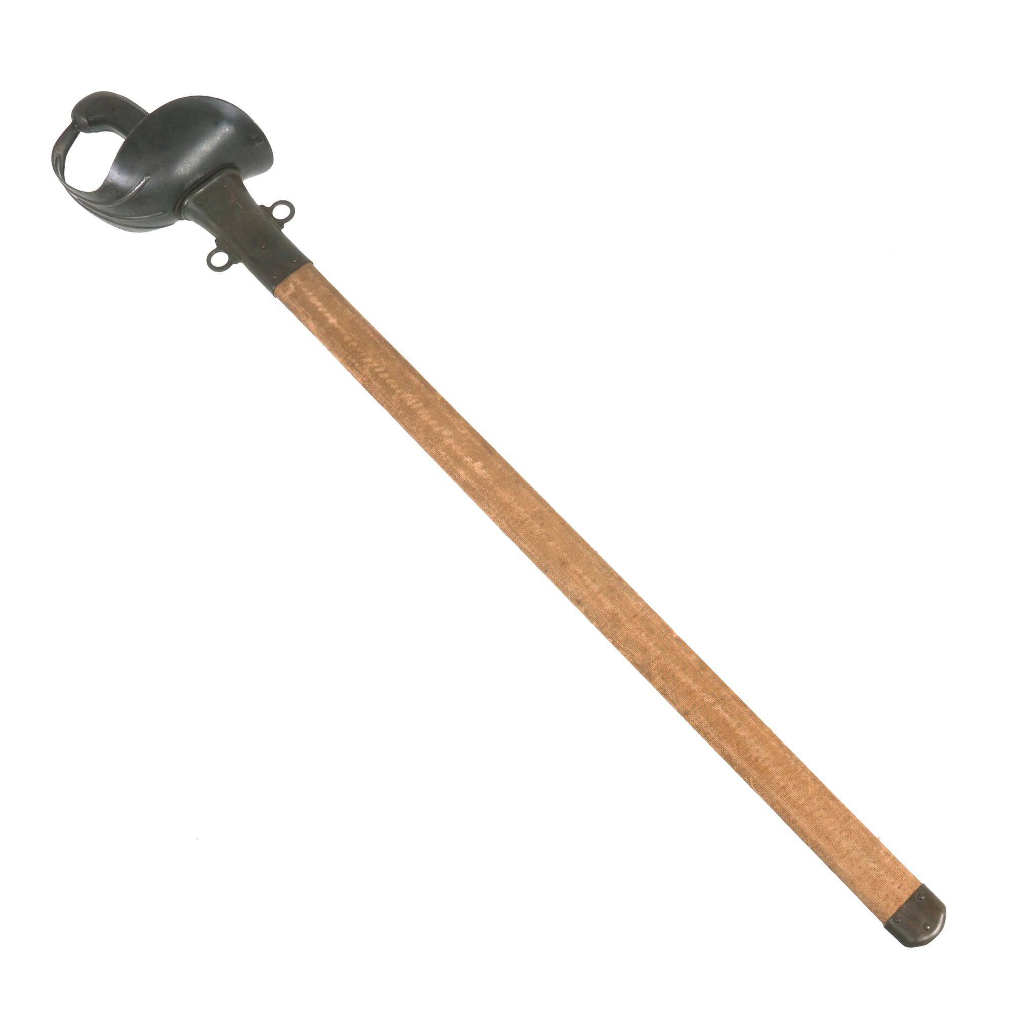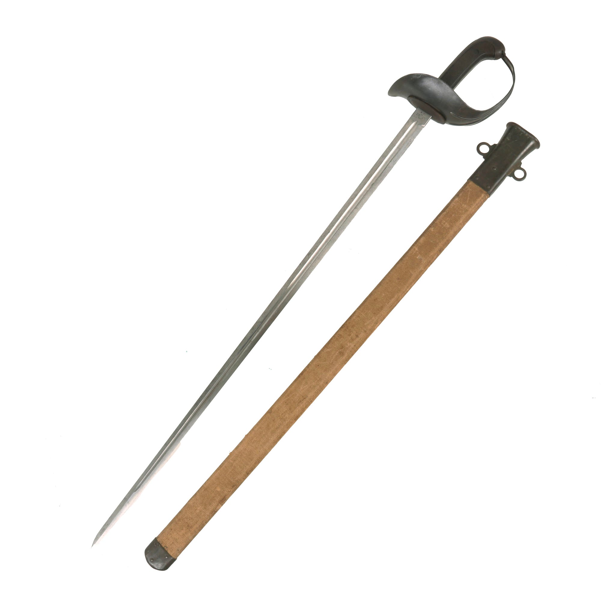 Blade condition is very good, with a wonderful patina, and only a few nicks on the edge though it does appear to have been cleaned. Minor pitting but no other major corrosion, just the usual light staining from age. Canvas on the scabbard is intact with staining from age and was clear coated at some point, giving it a very solid feel. The heavy steel guard is in great shape, as is the grip, which shows only light dents and a few paint marks. The entire sword has a lovely patina that is impossible to replicate. One of the more iconic models of U.S. Sabers, ready for further research and display!