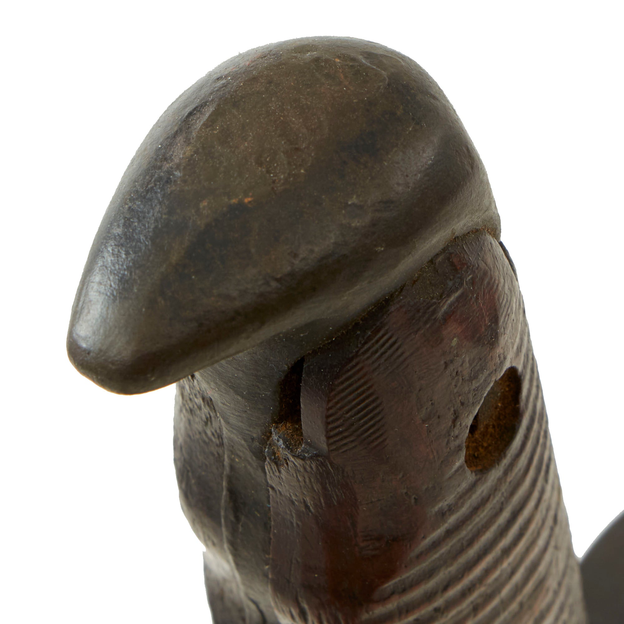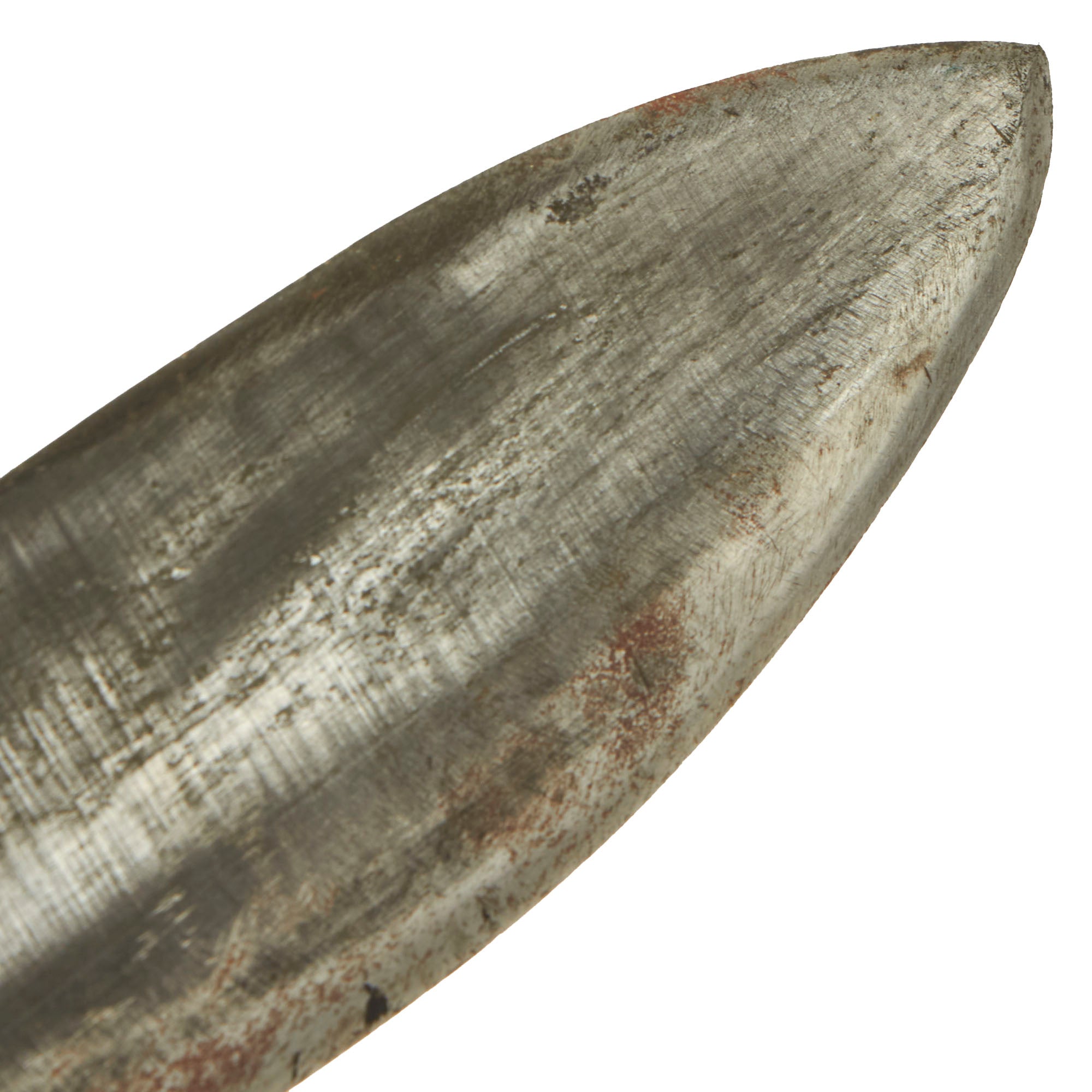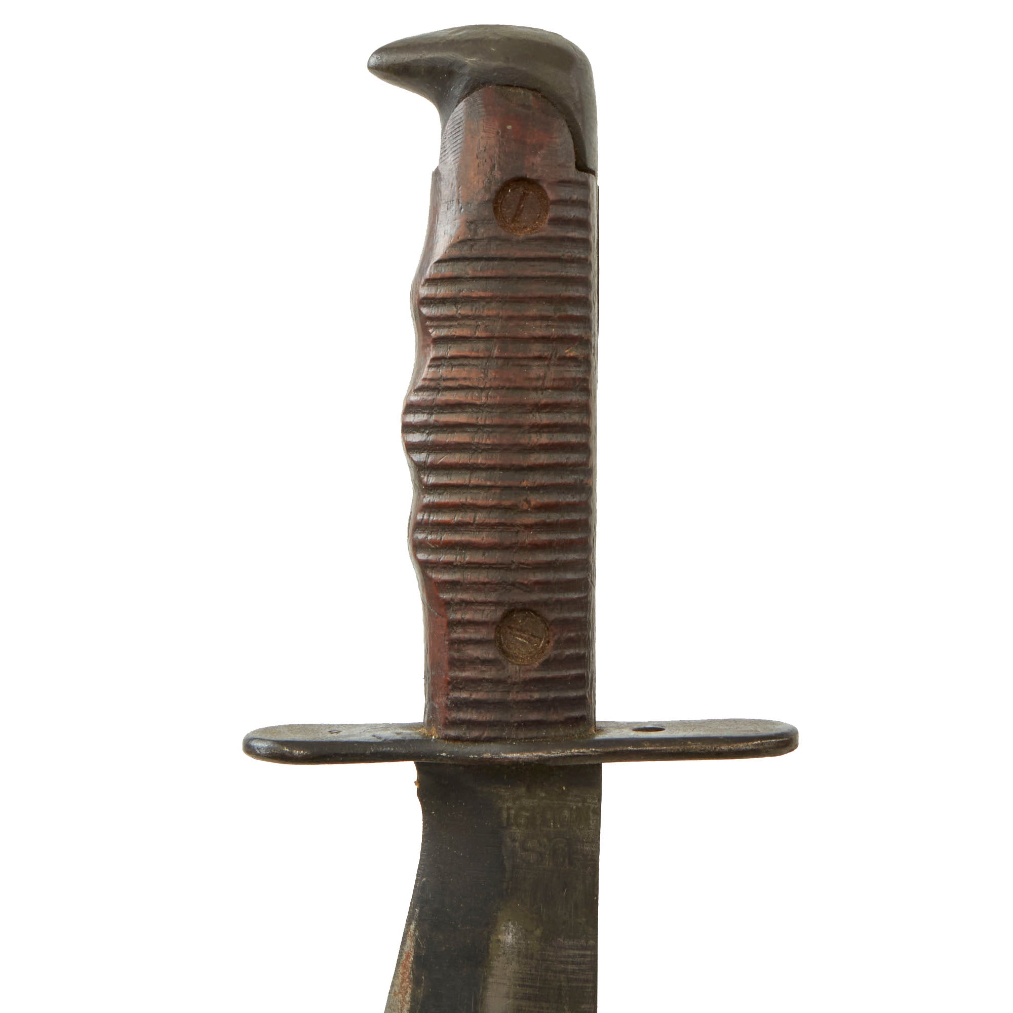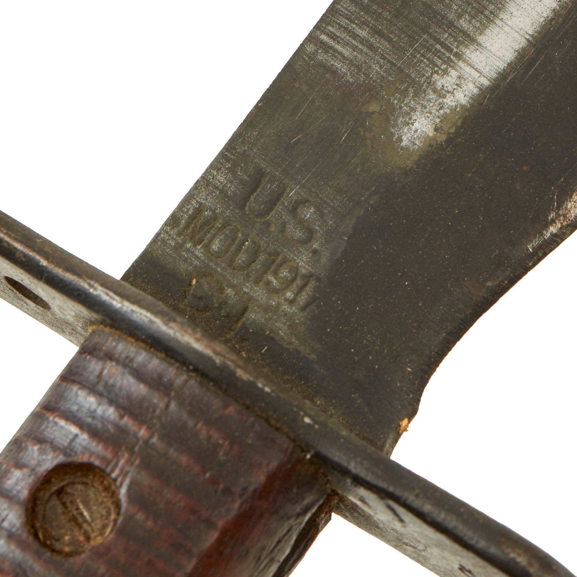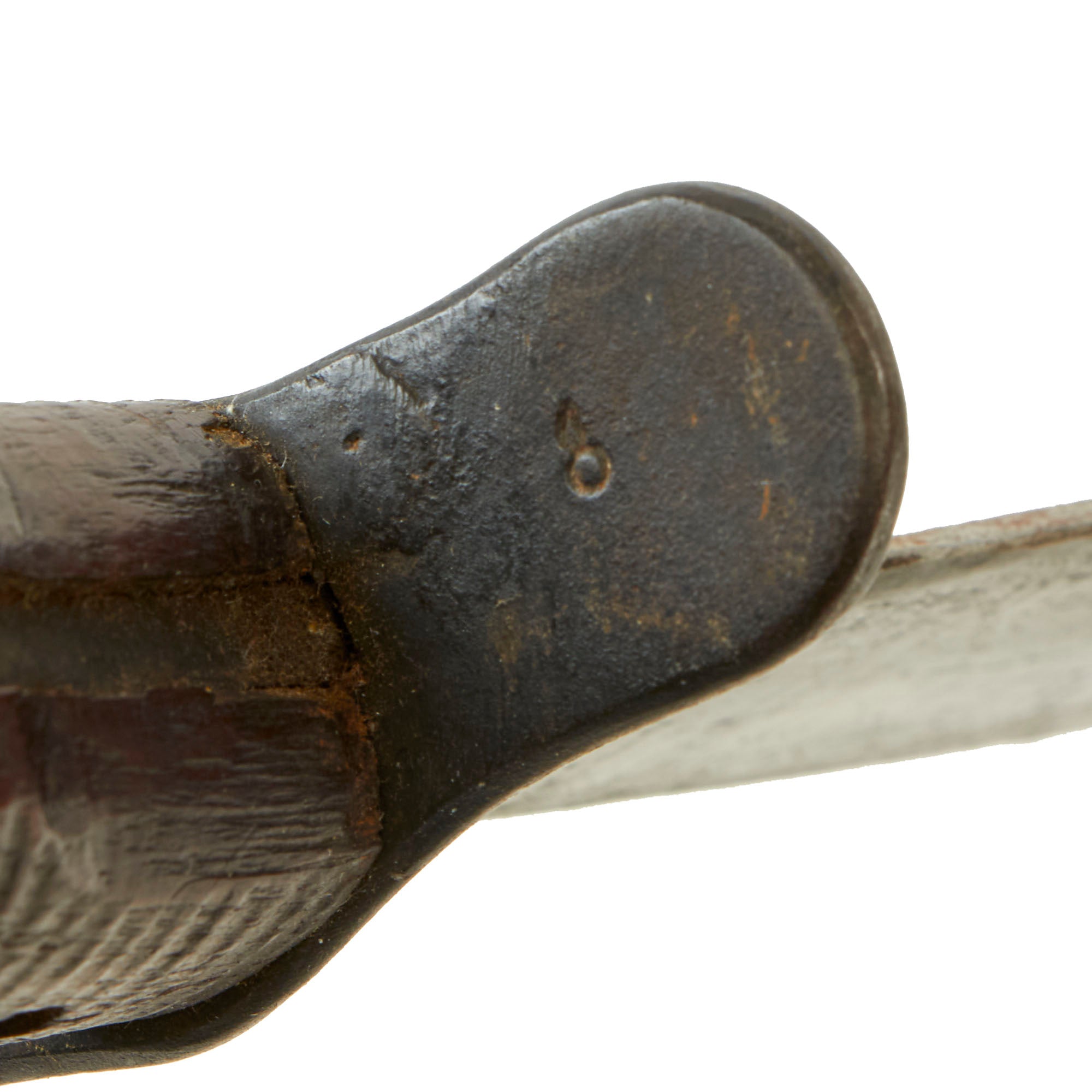 The blade retains little of its lovely blackened color, with signs of the usual service wear, while the ricasso areas still retain almost all the original finish. This example definitely has been sharpened several times but there is no change in appearance nor any damage to the edge. The main edge of many 1917s, such as this one, is mostly ground from the factory from one side, while the other side was left flat. The edge on the tips and near the ricasso are ground from both sides.