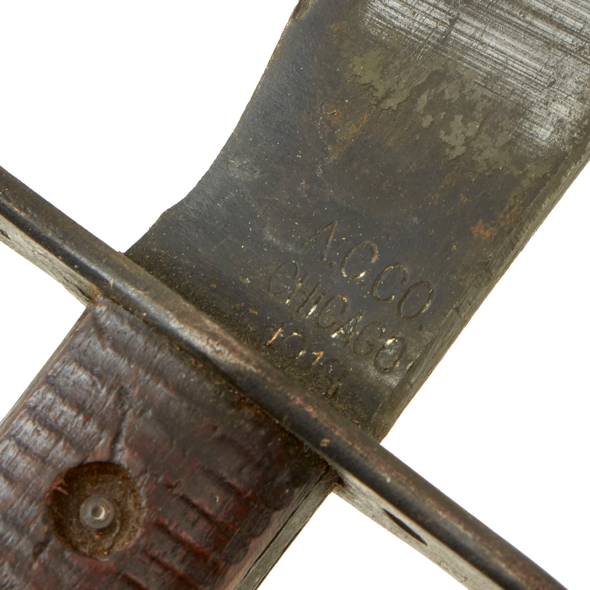 Original Item: Only One Available. This is a very nice example of a Model 1917 C.T. Bolo knife, manufactured by American Cutlery Company of Chicago, Illinois. This model was a moderate simplification of the earlier 1910 Bolo made by Springfield Armory. The main difference is the lack of the catch mechanism on the scabbard and grip. It was manufactured by contractors such as Plumb and American Cutlery Co. of Chicago. The blade ricasso on this example is clearly marked: