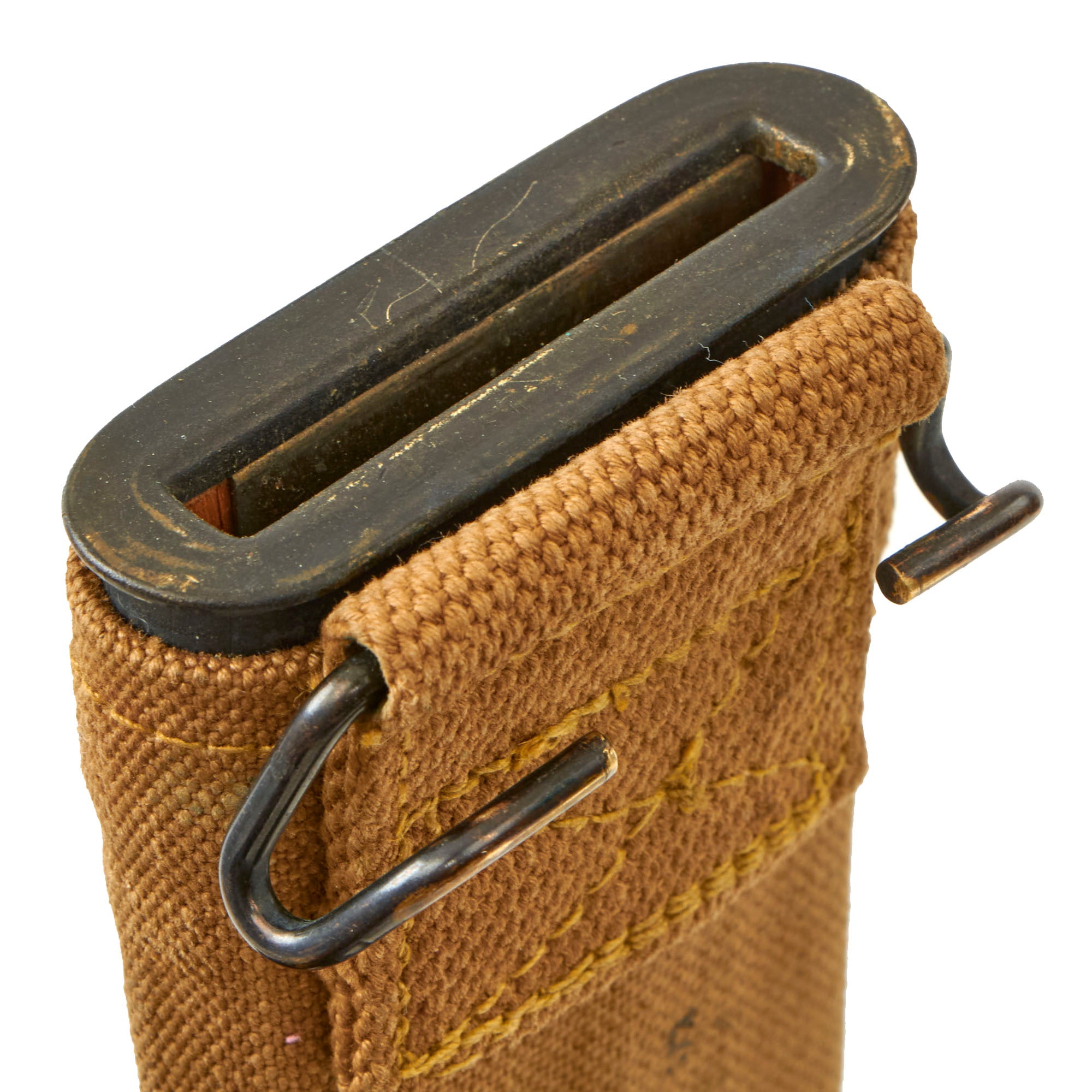 The leather tip of the canvas scabbard has a lovely aged chestnut brown color, and it still has the original manufacturer marking ckearly visible: