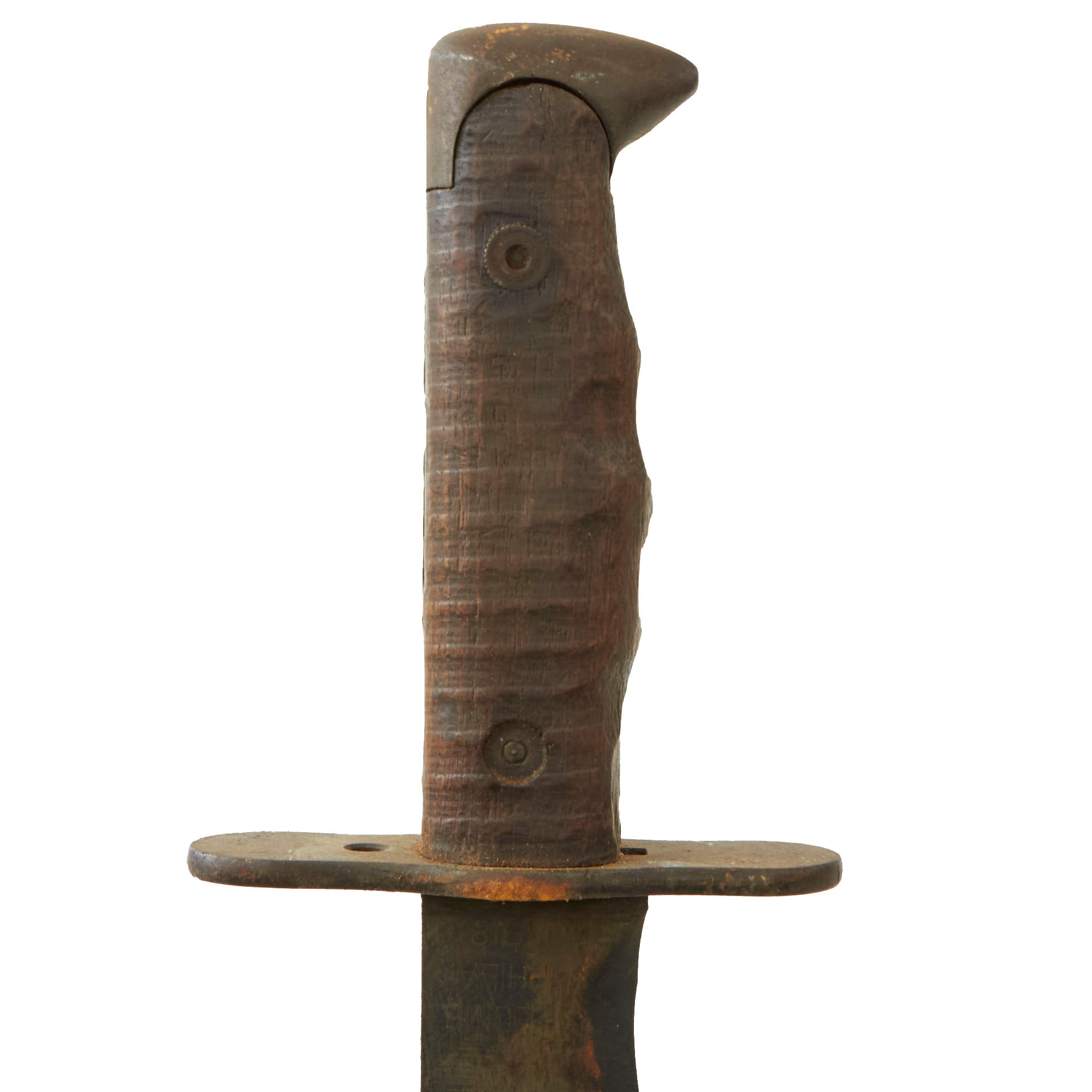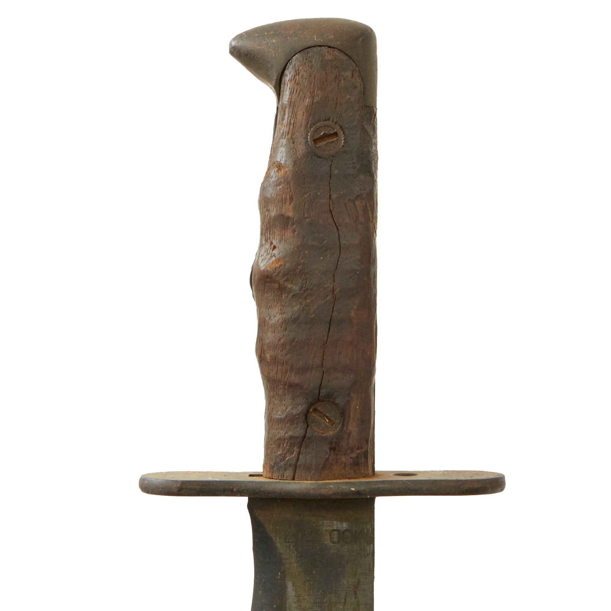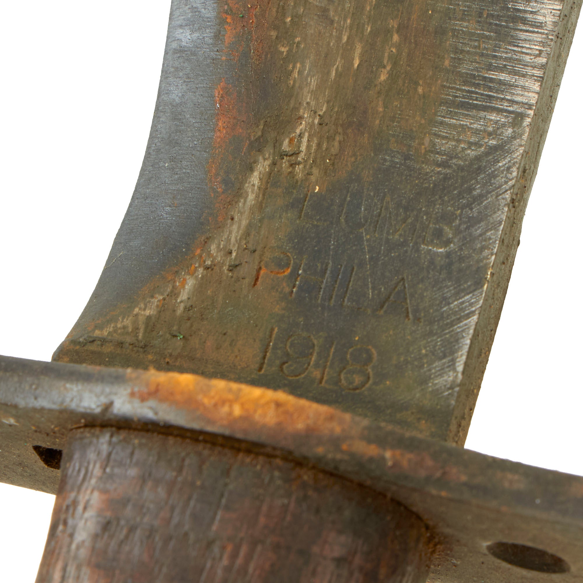 This model was a moderate simplification of the earlier 1910 Bolo made by Springfield Armory. The main difference is the lack of the catch mechanism on the scabbard and grip. It was manufactured by contractors such as Plumb and A.C. Co. The blade ricasso of this example is marked:
