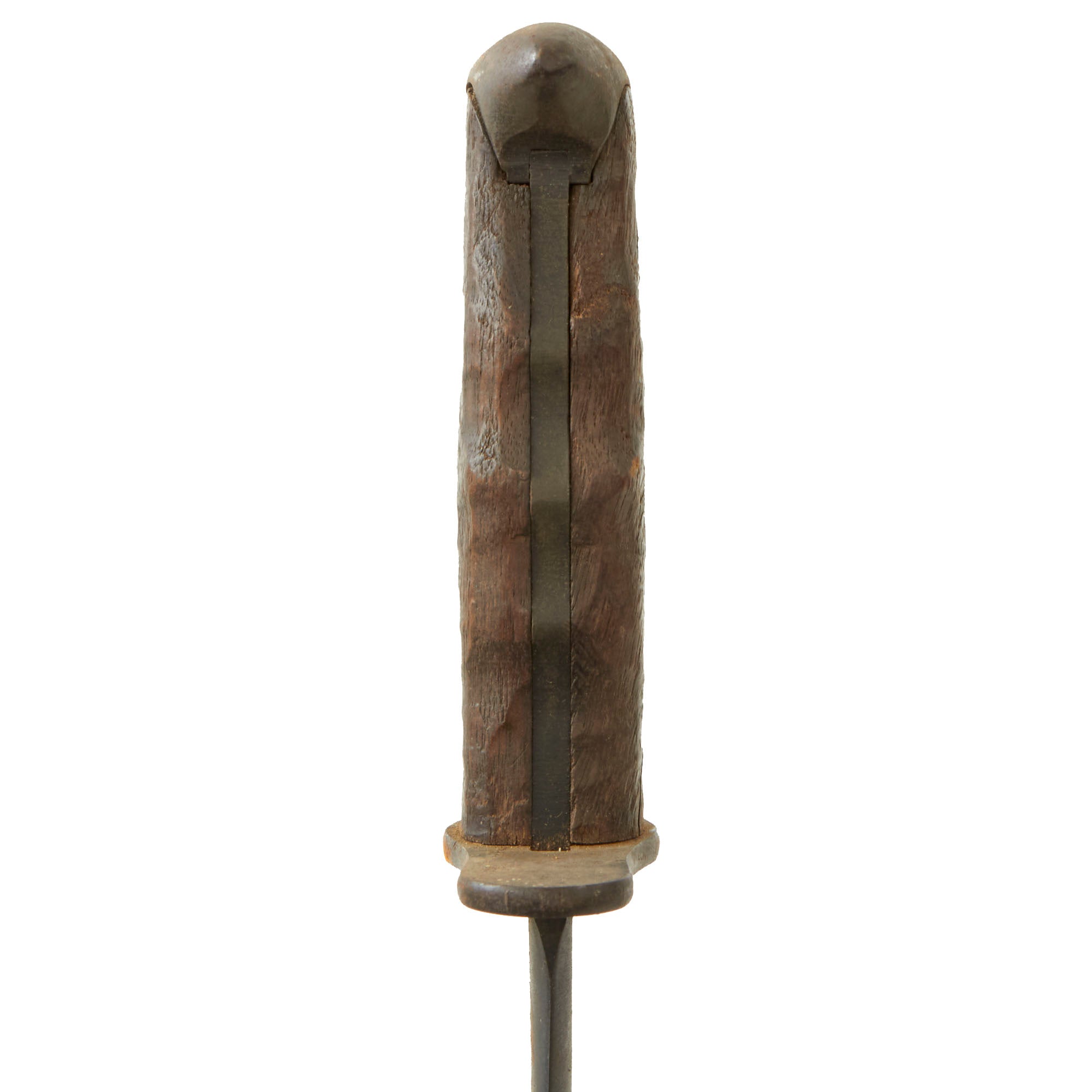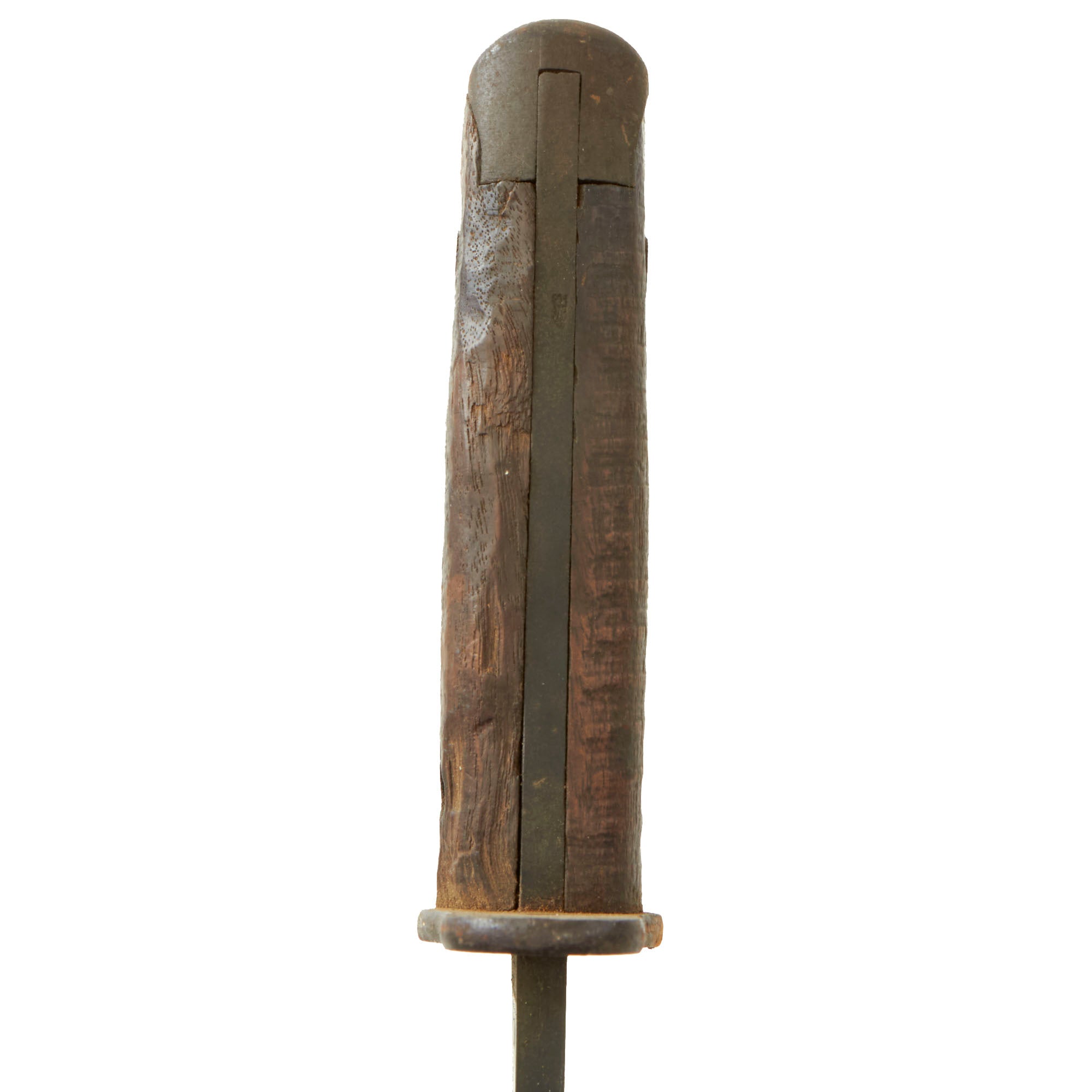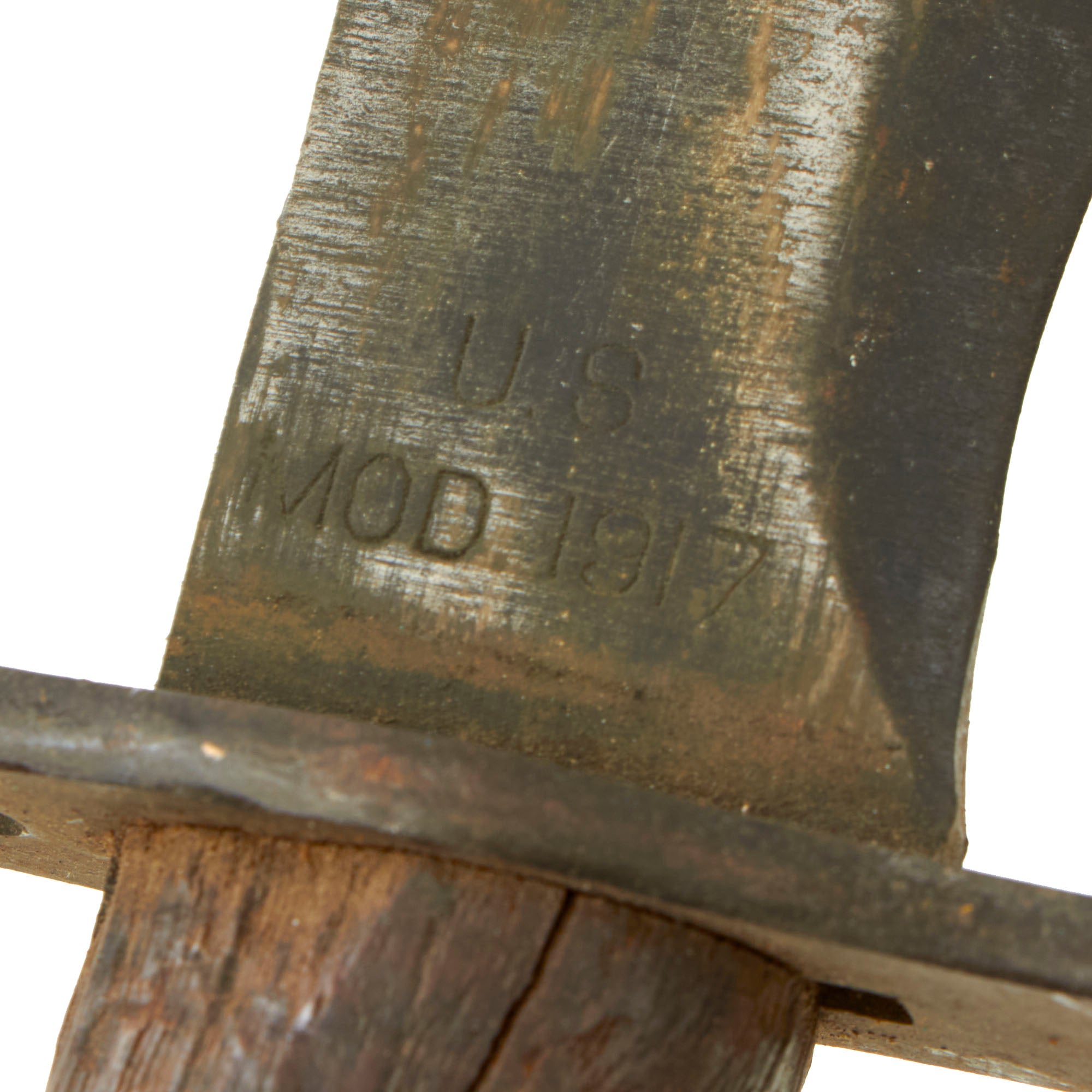 This model was a moderate simplification of the earlier 1910 Bolo made by Springfield Armory. The main difference is the lack of the catch mechanism on the scabbard and grip. It was manufactured by contractors such as Plumb and A.C. Co. The blade ricasso of this example is marked: