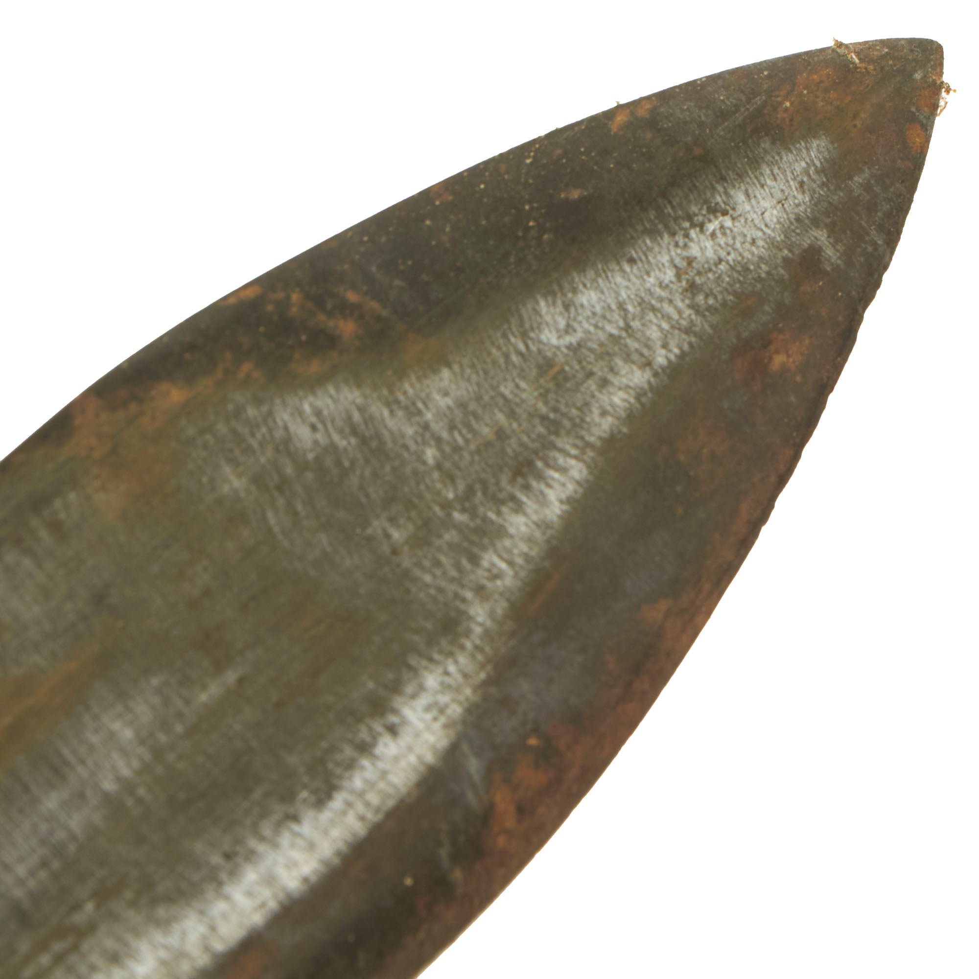 Blade and ricasso still has much of the blackened finish. There is also the usual runner wear on both sides of the blade. The main edge of the model 1917, such as this one, is mostly ground from one side, while the other side was left flat. There is just some light sharpening from the flat side, which was the quickest way to get the edge back.