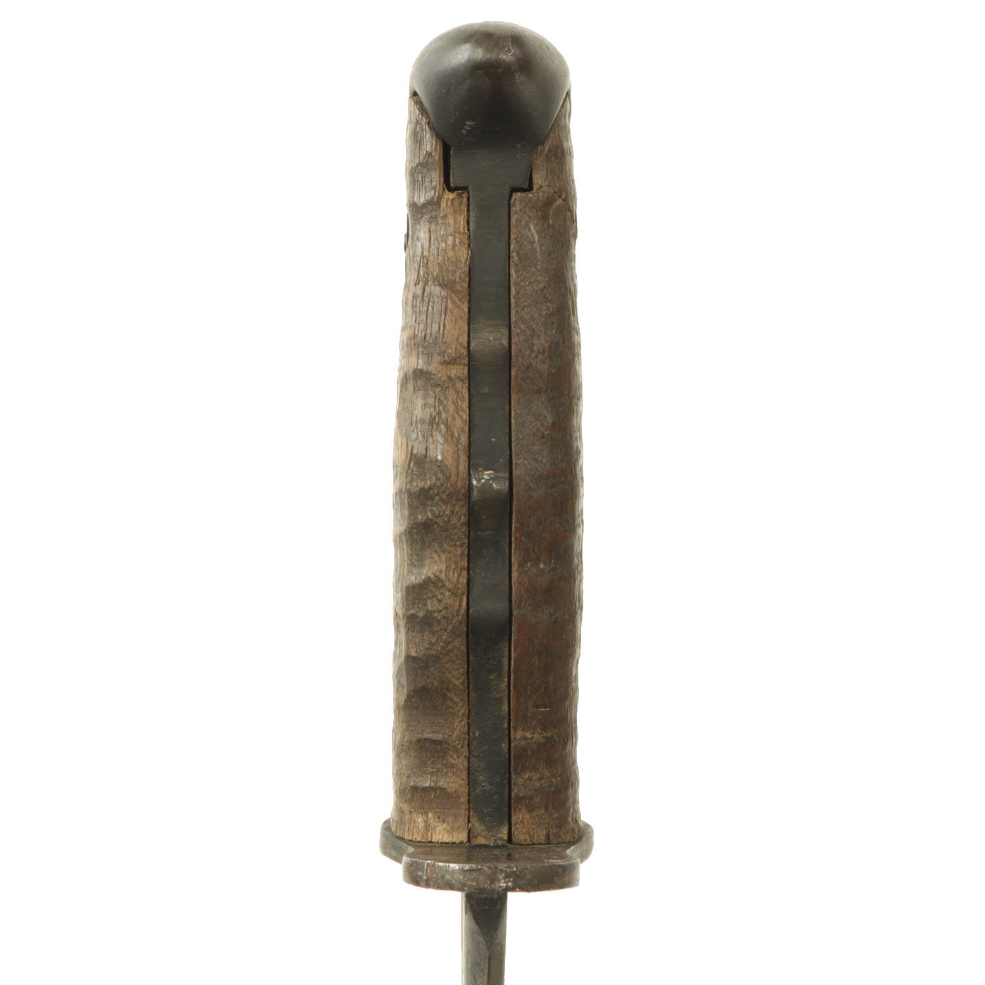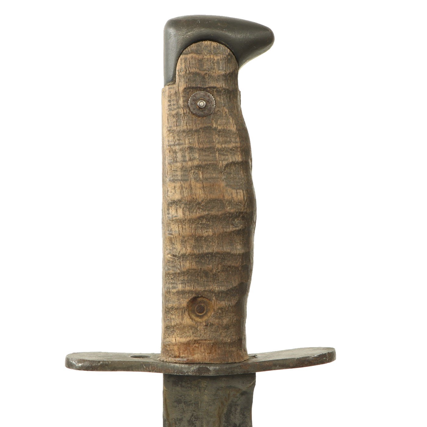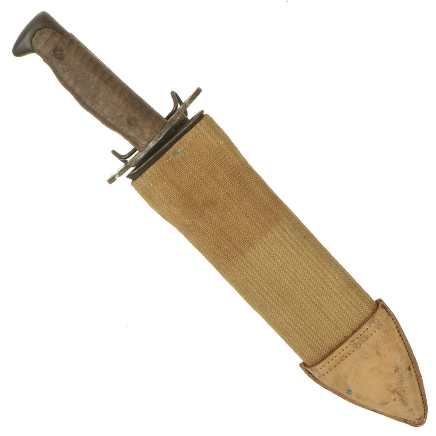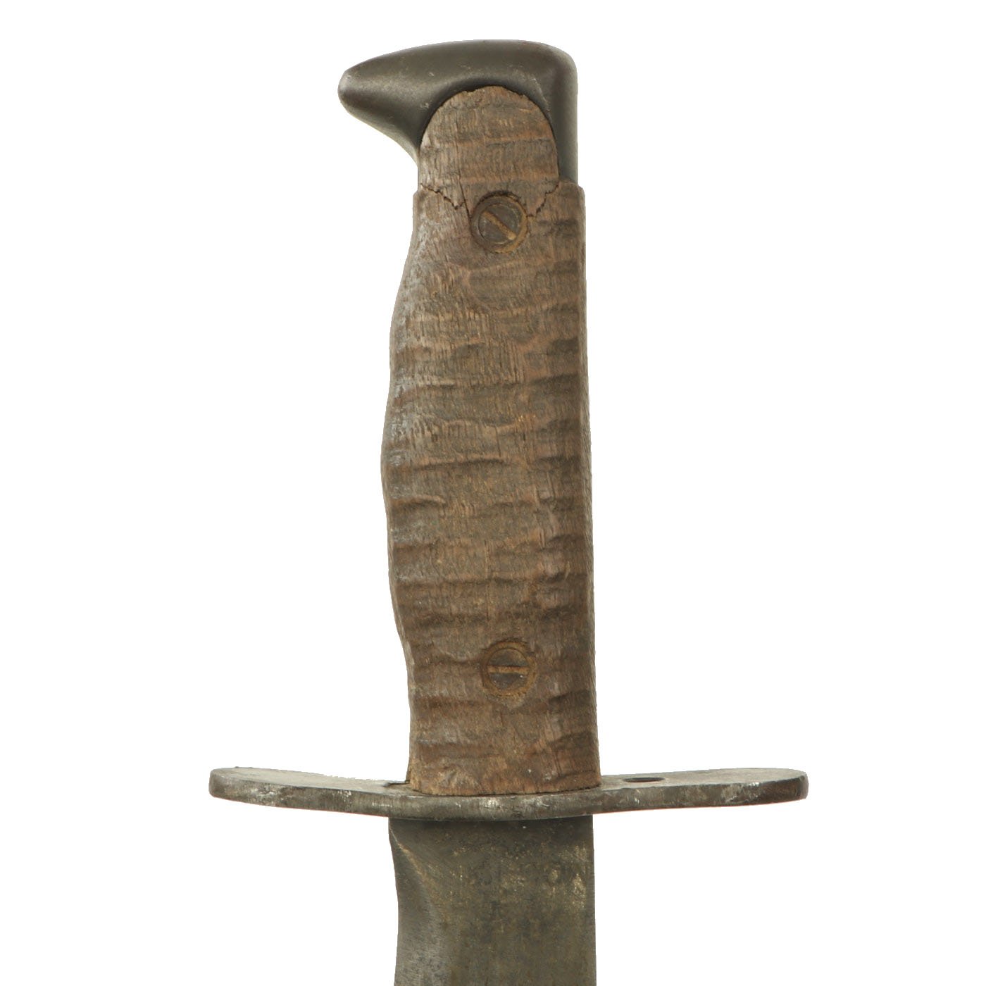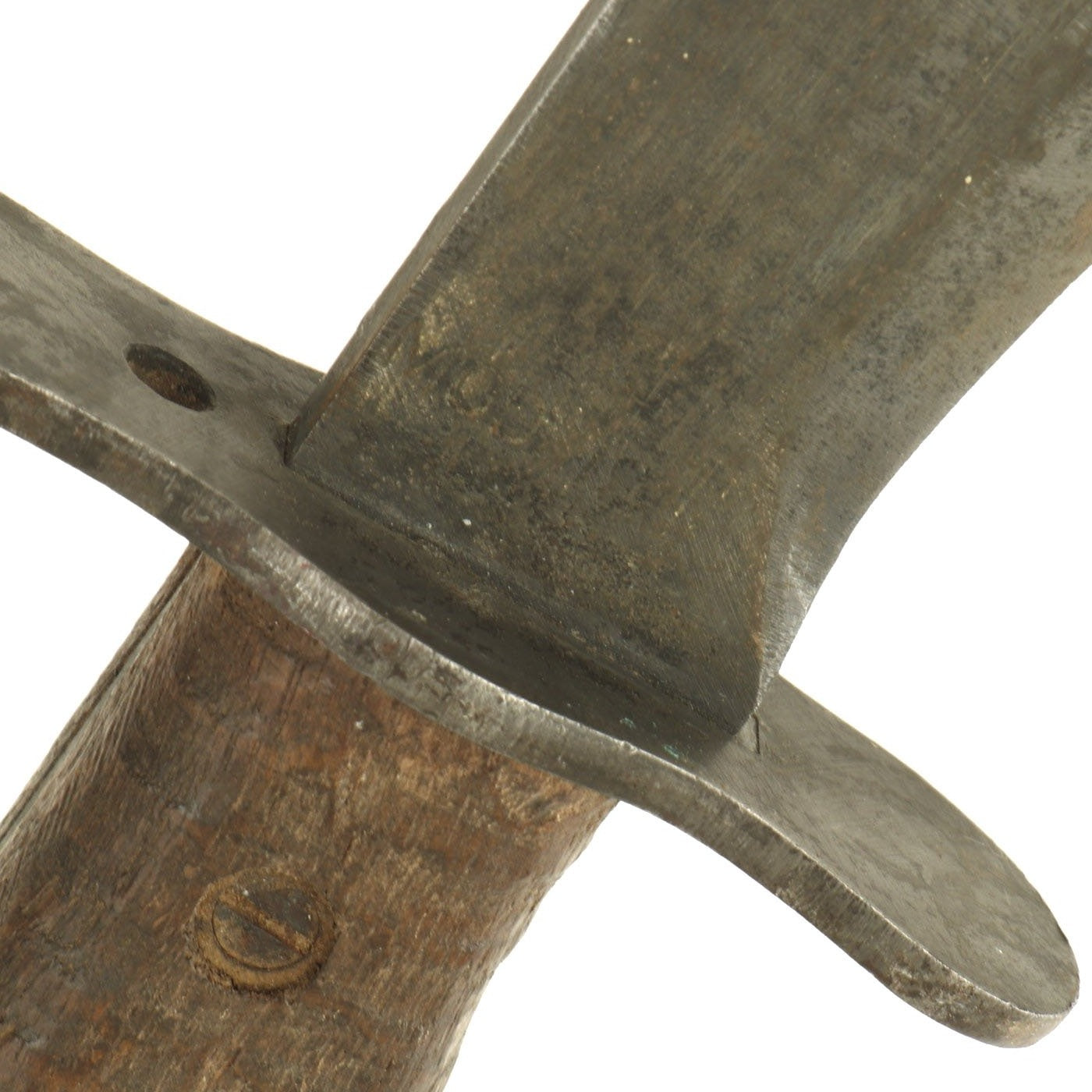 This model was a moderate simplification of the earlier 1910 Bolo made by Springfield Armory. The main difference is the lack of the catch mechanism on the scabbard and grip. It was manufactured by contractors such as Plumb and A.C. Co. The blade ricasso is faintly marked (upside down):
